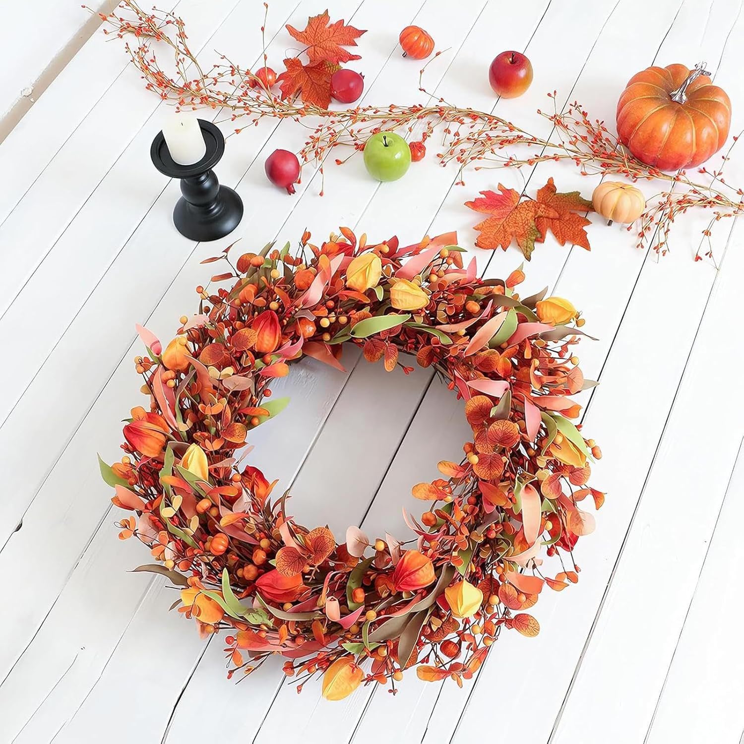 Decorazione Autunnale: Progettata per celebrare l'arrivo 'autunno, questa decorazione a tema autunnale arricchisce la tua porta d'ingresso con interesse visivo ed eleganza rustica; non evidenzia la bellezza a stagione del raccolto, ma imposta anche un accogliente per riunioni familiari e festività durante tutto l'autunno, creando un'atmosfera invitante con dettagli intricati e spirito festivo per abbellire l'ingresso. Alta Durabilità Riutilizzabile: Caratterizzata da una costruzione robusta in PVC, questa ghirlanda autunnale per porta d'ingresso garantisce prestazioni e la possibilità di riutilizzo multiplo, consentendo ai proprietari di decorare porte o pareti in modo ripetuto mentre conserva il tema autunnale vivace stagione dopo stagione, senza perdita di colore o forma, per un'opzione decorativa e sostenibile. Lavorazione Manuale Curata: Queste ghirlande autunnali uniscono una base in rattan vivace e resistente a una raffinata arte intrecciata a mano, arricchite con foglie autunnali, bacche arancioni e zucche decorative per creare un look morbido ed elegante. Ideali per aggiungere un fascino stagionale alla tua porta d'ingresso durante i autunnali, queste decorazioni autunnali per la casa offrono un'atmosfera accogliente e festosa, perfette per abbellire l'entrata con stile e calore. Corona per il Ringraziamento: La corona autunnale mette in risalto i ricchi colori autunnali e un'atmosfera di raccolto, offrendo il divertimento del Ringraziamento attraverso il suo design che migliora le celebrazioni festive e dona un tocco delicato a porte o pareti di casa, creando un'ambiente accogliente per le festività autunnali con colori caldi e tema del raccolto. Dimensione Ottimale per Decorazioni: Con un diametro di 56 cm quando espansa, questa ghirlanda autunnale offre le proporzioni giuste per decorare diverse aree; dopo lo scarto, rimoa e moa i rami per massimizzare l'aspetto visivo, creando un'atmosfera calda e festosa nelle case durante la stagione del raccolto, ideale per abbellire ingressi o soggiorni con stile accogliente e autunnale.