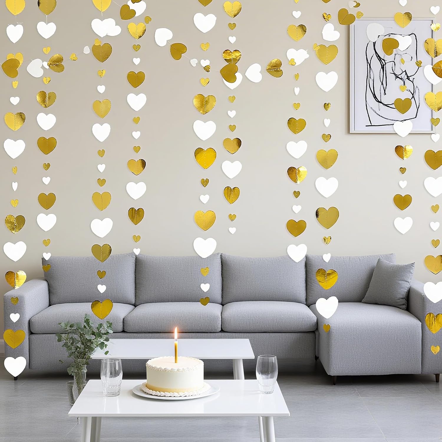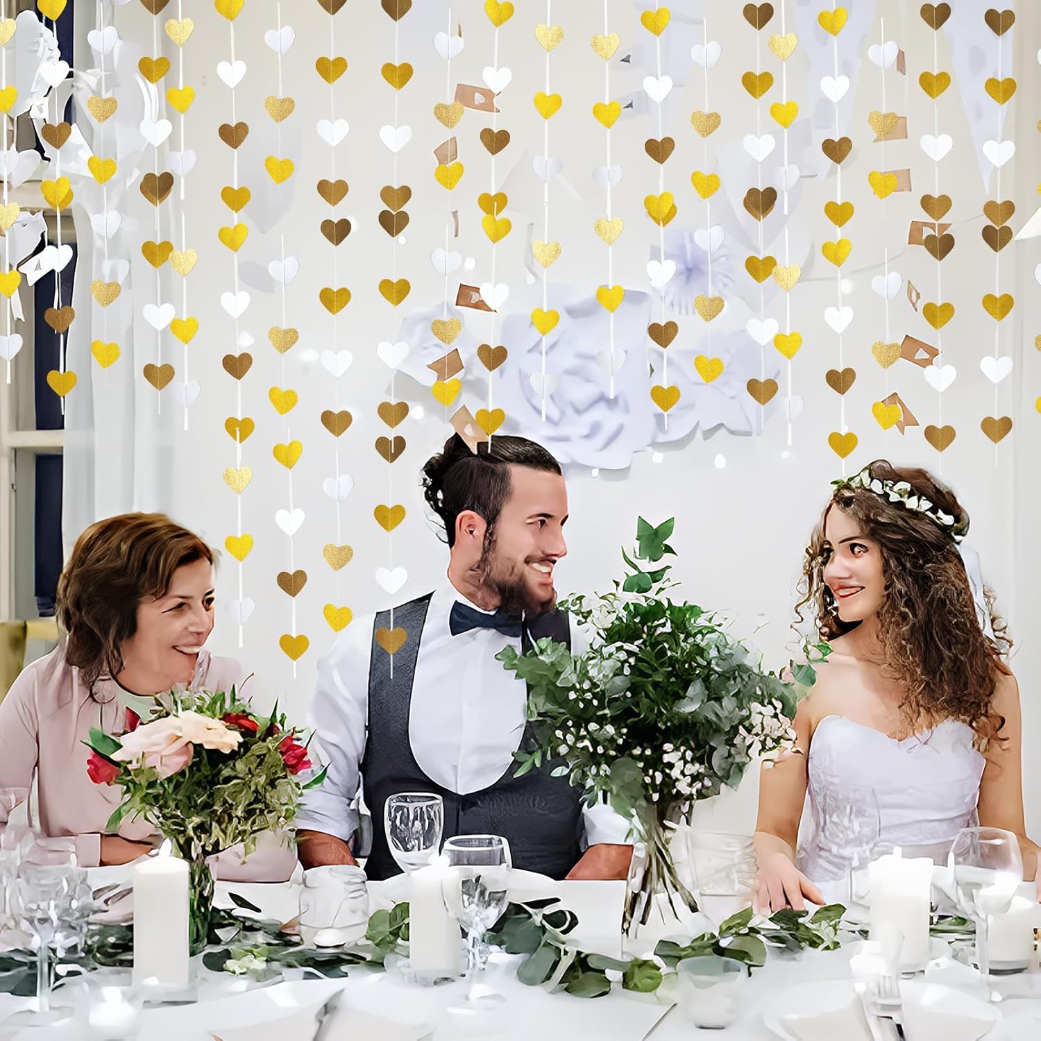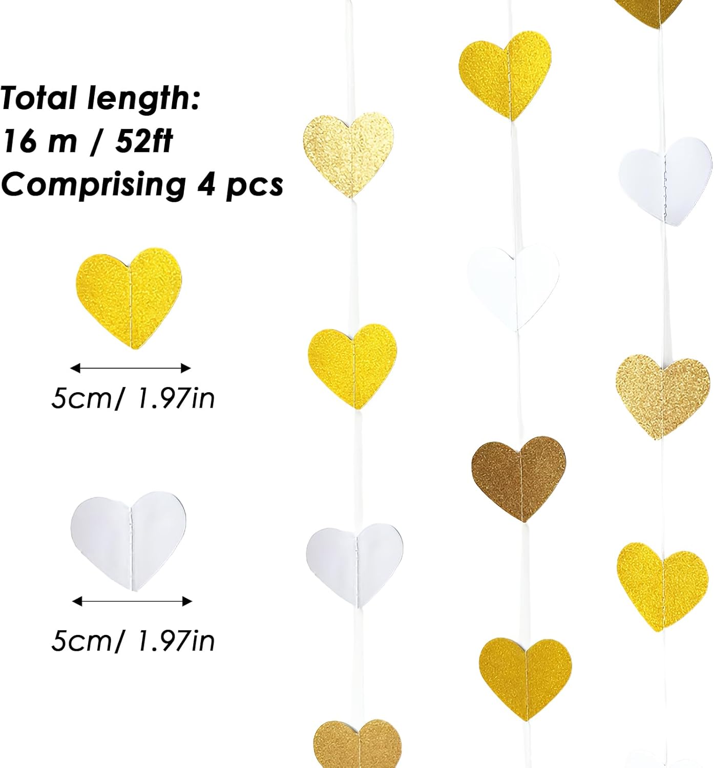 Elegante decorazione per matrimonio: questa ghirlanda a forma di cuore da 15,8 m aggiunge un tocco di romanticismo a qualsiasi evento. Ideale per matrimoni, feste di fidanzamento e celebrazioni di anniversario, crea un'atmosfera calda e festosa con la sua combinazione di colori oro e bianco. Perfetto per decorare stanze, case e luoghi per celebrare l'amore. Lunghezza generosa per un uso versatile: con 4 set di ghirlande per striscioni per feste, ognuna misura 4 metri, la lunghezza totale raggiunge un impressionante 52 piedi (16 metri). Questa ampia lunghezza consente di decorare facilmente grandi spazi, che si tratti di un ricevimento di nozze, una festa di fidanzamento o una riunione di anniversario. Varie occasioni: dalle decorazioni per feste di nozze all'arredamento per feste di fidanzamento, questo versatile streamer è progettato per migliorare qualsiasi occasione speciale. Che tu stia per sposarti, festeggiare un anniversario o ospitare una festa di compleanno, il design a forma di cuore si adatta perfettamente a una varietà di temi e ambientazioni. Facile da appendere e stile: realizzato per comodità, questa ghirlanda è leggera e facile da appendere. Puoi facilmente drappeggiarlo su pareti, soffitti o spazi per eventi per creare effetti visivi sorprendenti. I toni oro e bianco completano qualsiasi arredamento, rendendolo ideale sia per eventi interni che esterni. Ideale per più celebrazioni: non solo questa ghirlanda è adatta per decorazioni di matrimoni e fidanzamenti, ma è anche ideale per celebrazioni di anniversario, eventi di San Valentino o compleanni. Il suo design senza tempo porterà un tocco di amore e gioia a qualsiasi riunione, rendendolo una scelta versatile per tutti i tipi di celebrazioni.
