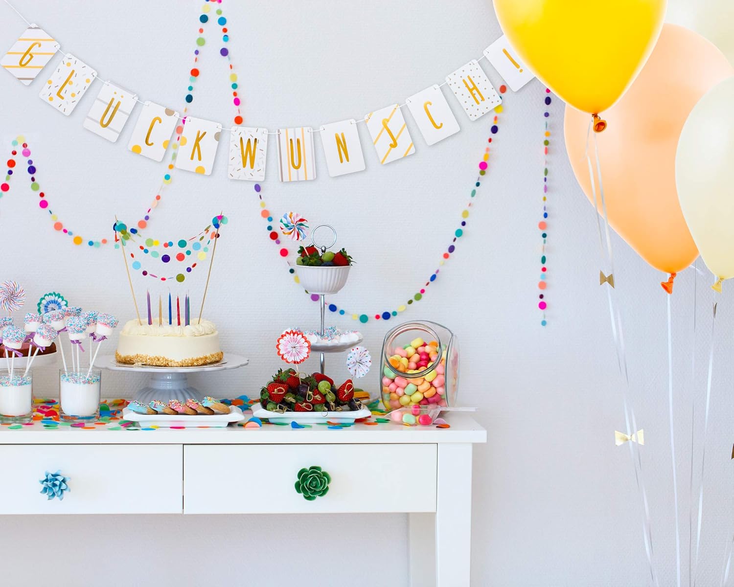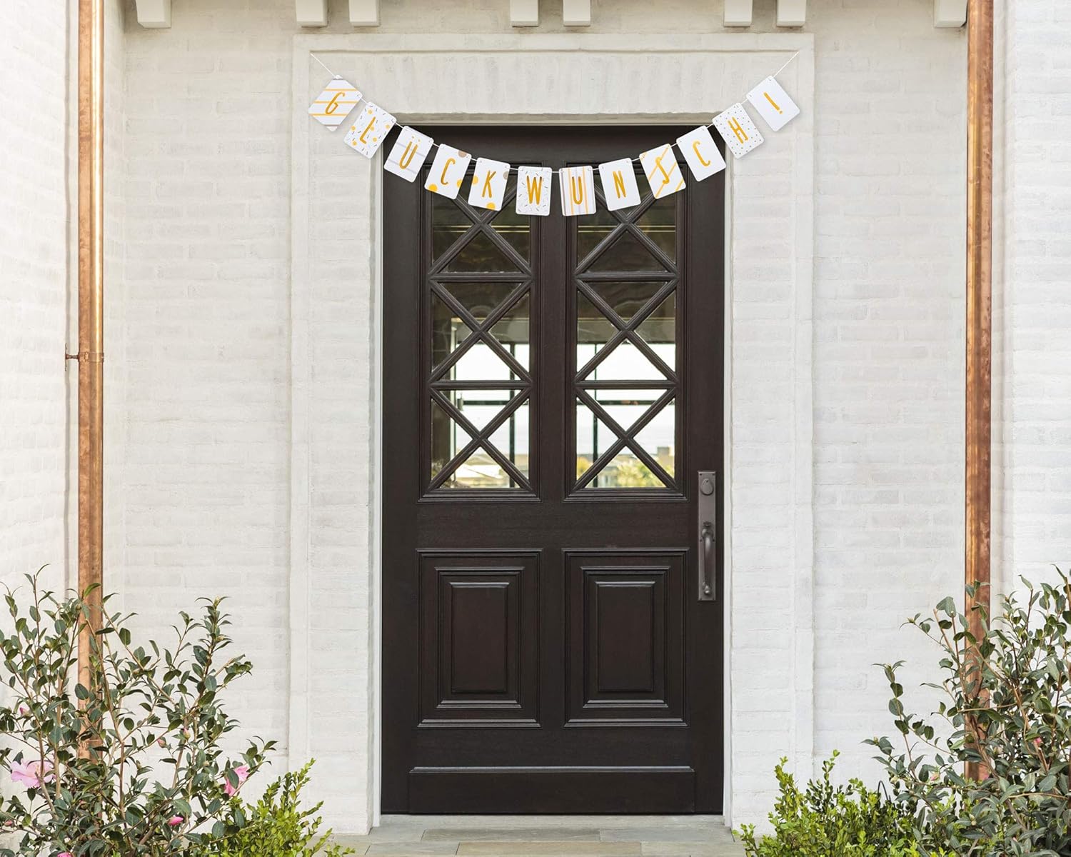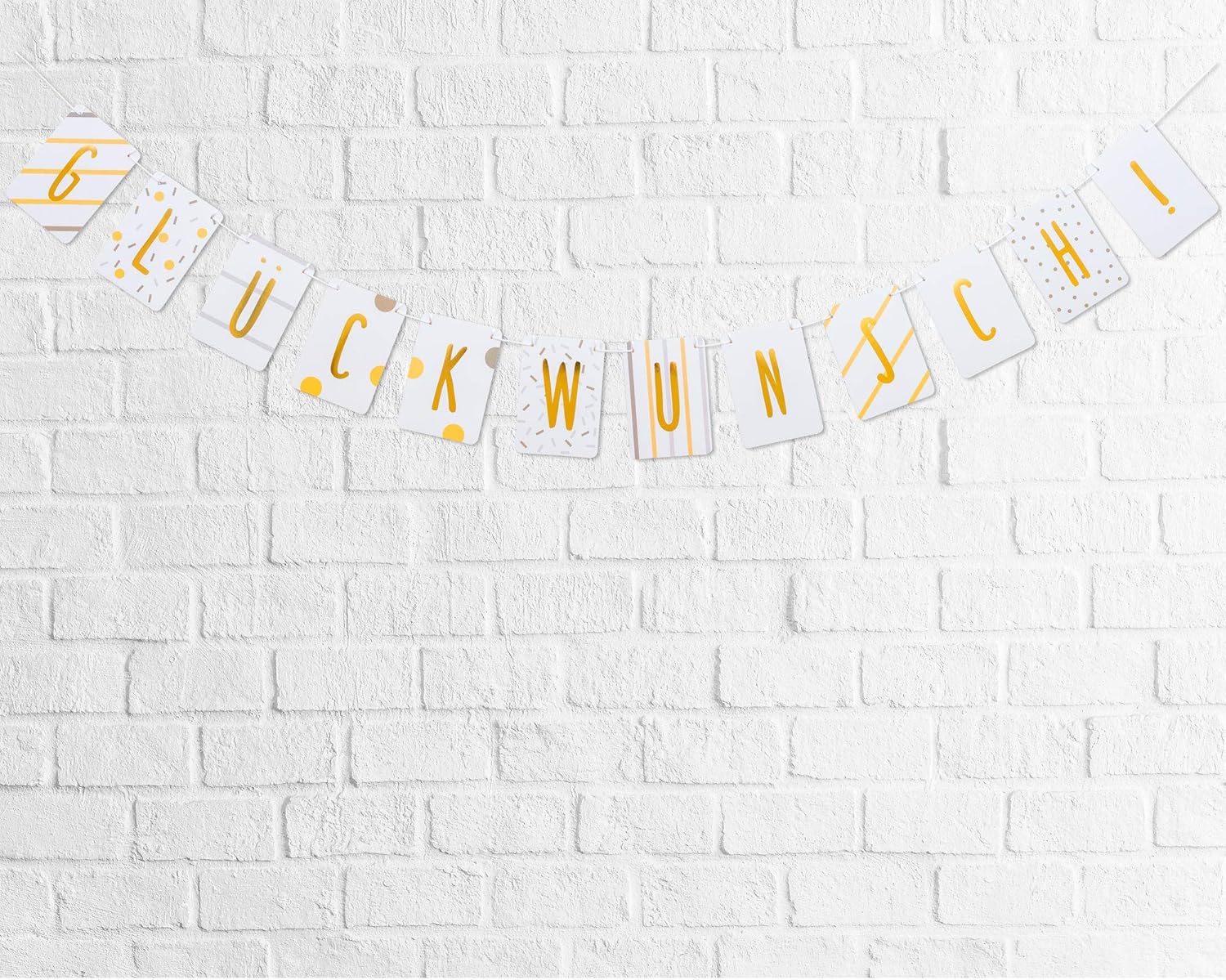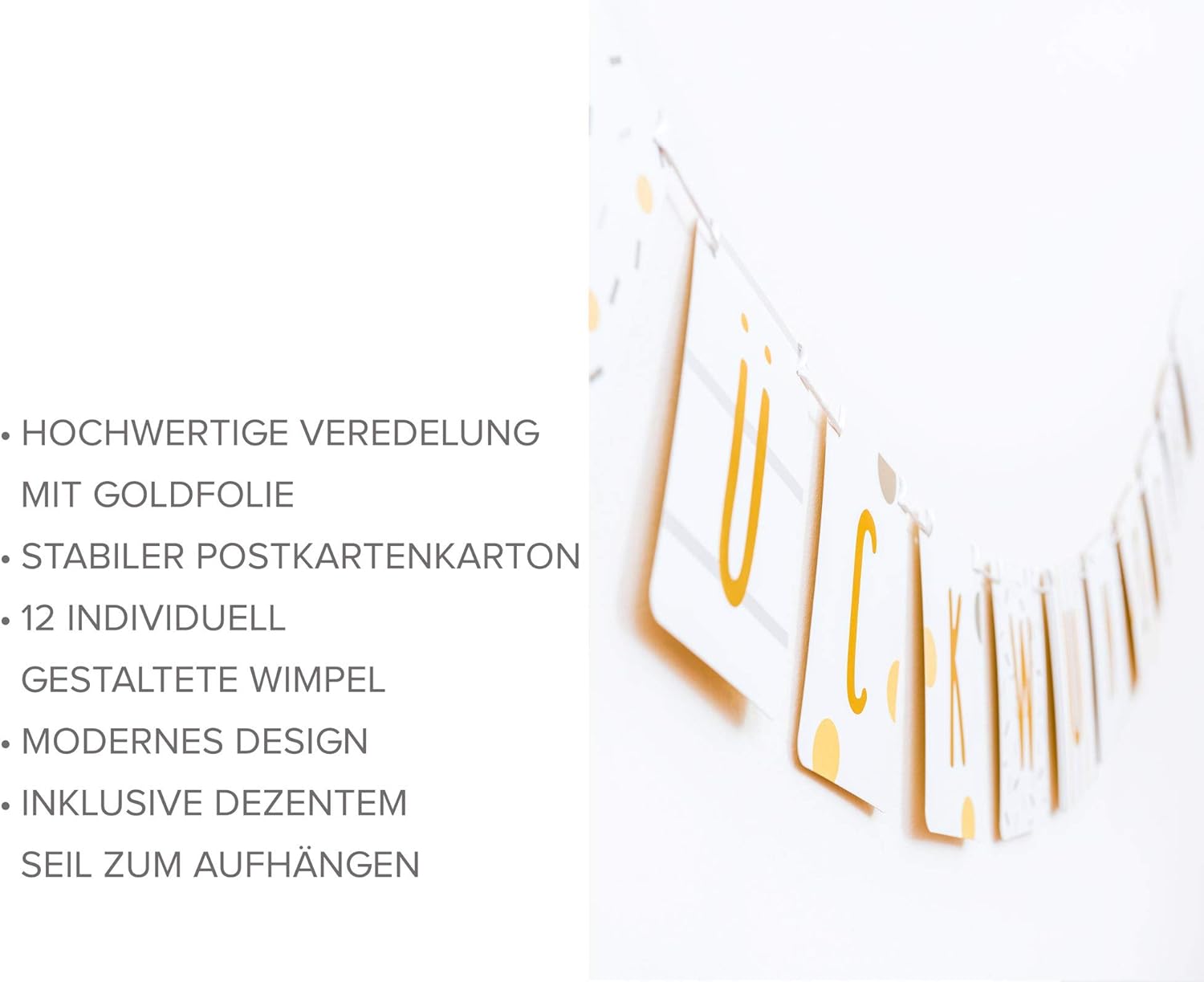 TUTTO IL MEGLIO ★ Stai organizzando una festa e cerchi una ghirlanda chic per completare le decorazioni della tua festa? Allora con questo striscione per feste prendi la decisione giusta. GHIRLANDA DI ALTA QUALITÀ★ I singoli gagliardetti della ghirlanda sono in formato DIN A6 e sono realizzati in robusto cartone da cartolina. Le lettere sono rifinite con lamina d'oro di alta qualità, in modo che la ghirlanda attiri l'attenzione in modo speciale. GHIRLANDA DI BUON COMPLEANNO - Grazie alla semplice scritta "Congratulazioni!" La ghirlanda di compleanno può essere utilizzata anche come oggetto decorativo neutro per un baby shower, o come piccolo saluto di benvenuto per una nascita, l'inizio della scuola, il superamento di un esame, il diploma di scuola superiore, la laurea, una promozione, un anniversario, ecc. RIUTILIZZABILE - La ghirlanda di carta è di alta qualità, in modo che la catena decorativa possa essere riutilizzata per molte occasioni diverse. Facilmente combinabile: l'elegante catena di auguri e la ghirlanda di compleanno si possono combinare perfettamente con altri set di decorazioni per feste e oggetti decorativi. CONSEGNA INCLUSA - Nella consegna sono incluse 12 gagliardetti e una corda per attaccarli.