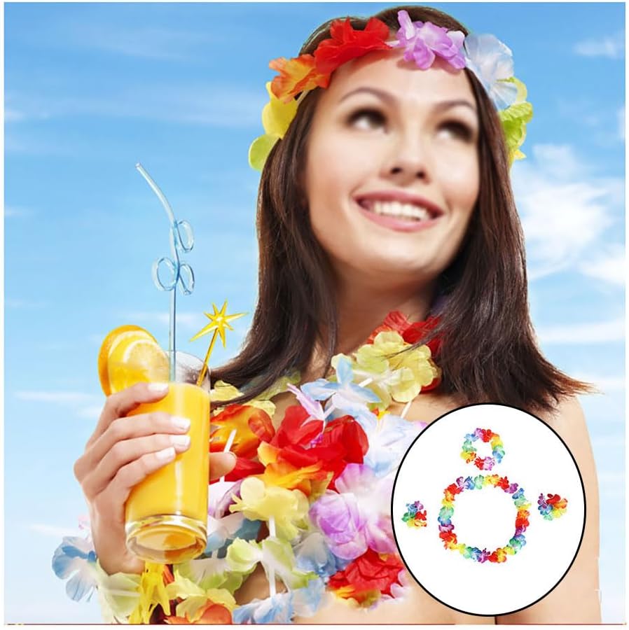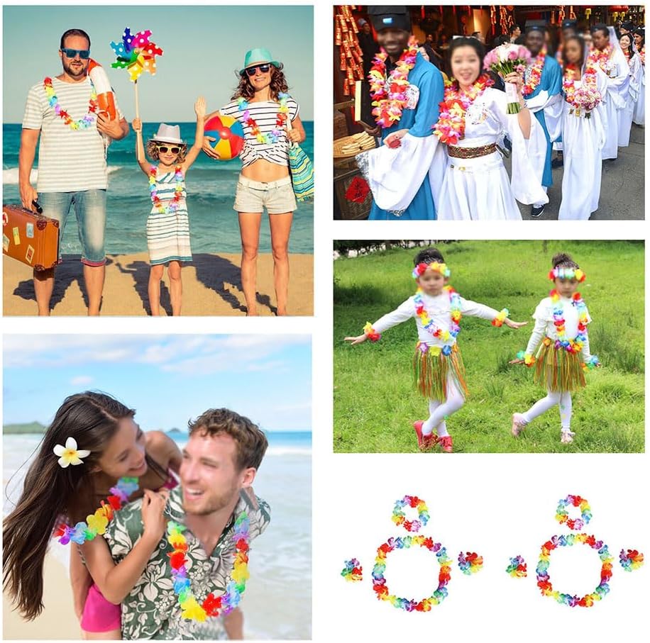 Catene di fiori hawaiane: catene di fiori hawaiane realizzate con materiali di alta qualità, morbide e confortevoli, dai colori vivaci, leggere e traspiranti, delicate sulla pelle, sicure ed ecologiche, riutilizzabili e durevoli Catene di fiori hawaiane: catene di fiori hawaiane decorate con fiori colorati, colori vivaci e colorati ed eleganti petali di fiori, appositamente progettati per una varietà di feste, celebrazioni e festival Catene hawaiane: catene hawaiane perfette per decorazioni per feste hawaiane, feste luau, feste in spiaggia, feste in spiaggia Decorazione, feste di carnevale, feste di matrimonio, festival musicali, oggetti di scena per costumi di danza hawaiana, ecc. Catene di fiori: il colletto non è elastico, il braccialetto e la fascia per la testa sono elastici, possono essere allungati elasticamente, per donne, uomini e altre persone di diverse età Catene Hawaii: le catene Hawaii non solo si adattano e possono essere combinate con vari giochi di ruolo, costumi di tutti i giorni o di festival, ma aggiungono anche uno stile tropicale unico alla tua vita di tutti i giorni