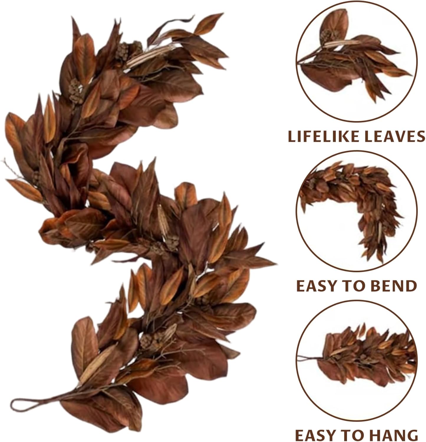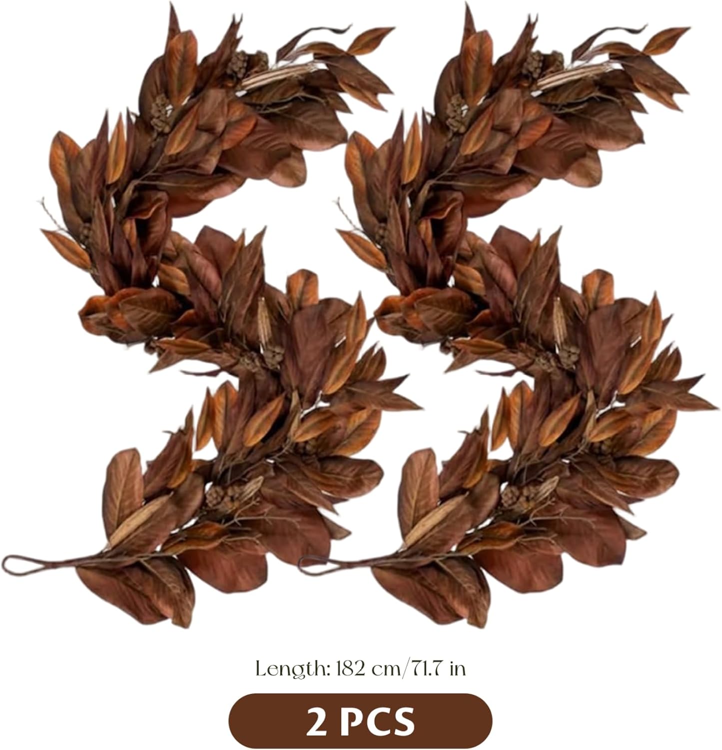 IDEALI PER MOLTE OCCASIONI: Queste ghirlande sono ideali per riunioni del Ringraziamento, matrimoni al chiuso, feste all'aperto o come decorazioni stagionali quotidiane, portando calore e fascino festivo ovunque siano esposte. Lunghezza generosa: con due fili da 72 pollici ciascuno, avrai un sacco di ghirlande da drappeggiare su mensole, ringhiere per scale, tavoli, porte o recinzioni esterne per creare un tocco accogliente e stagionale. Riutilizzabili e durevoli: realizzate in plastica di alta qualità, queste ghirlande manterranno il loro colore e il loro aspetto nel tempo, così potrai godertele per più stagioni autunnali senza preoccuparti che sbiadiscano o cadano. Decorazione flessibile: le ghirlande sono leggere e facili da modellare, il che le rende facili da disporre attorno a candele, vasi o altre decorazioni senza perdere la loro forma realistica. Look stagionale realistico: ogni ghirlanda presenta foglie di magnolia realistiche nei toni marroni naturali, creando una decorazione elegante e ispirata che completa le decorazioni rustiche, rustiche o tradizionali.