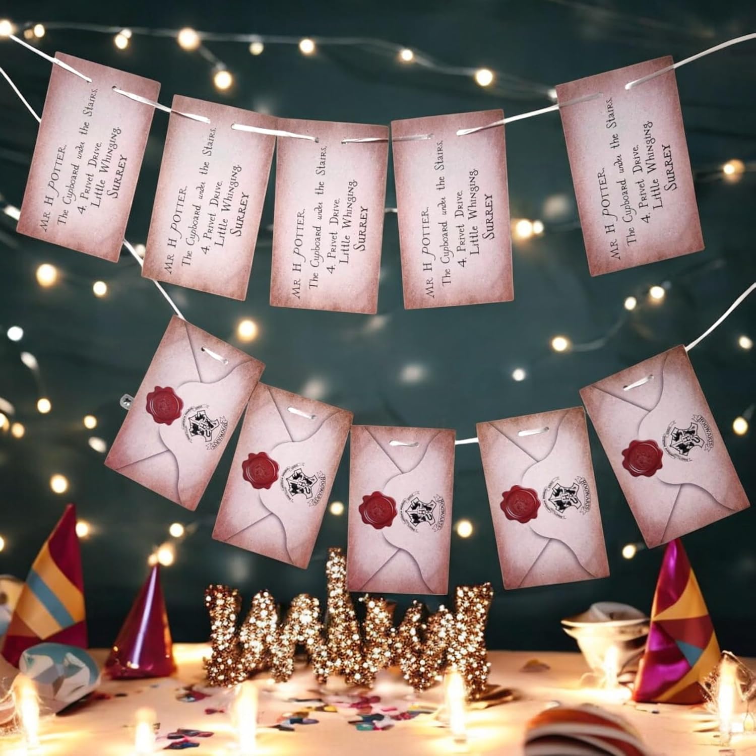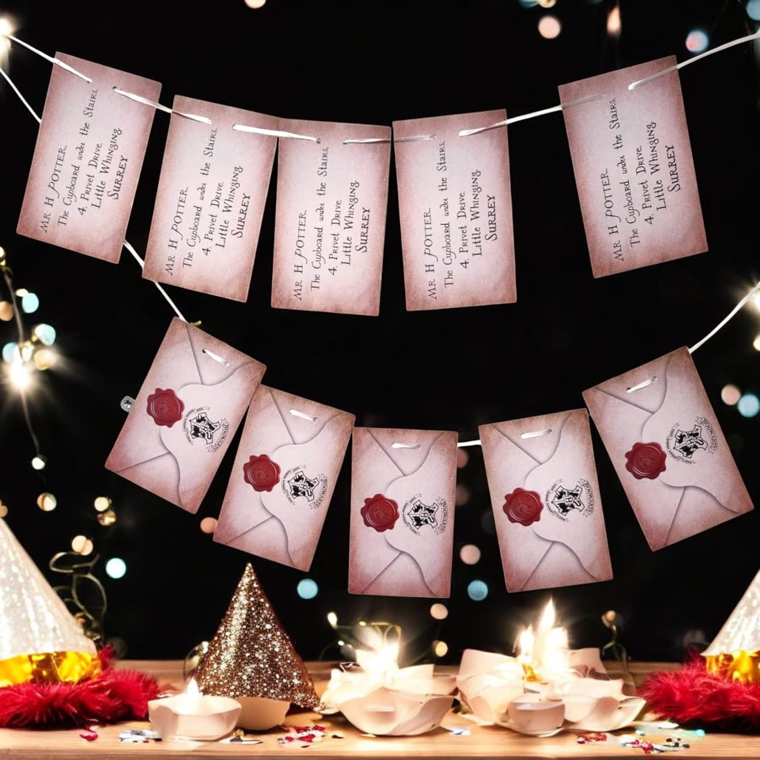 Tema del design: ghirlanda magica con lettere con bandierine in stile busta ispirata all'estetica della scuola di mago per un'atmosfera incantevole da festa Decorazione versatile: perfetta per feste di compleanno, eventi a tema e decorazioni magiche per feste che trasformano qualsiasi spazio in un mondo magico Pronto per feste: le bandierine pre-assemblate rendono l'installazione facile e veloce, consentendo la decorazione immediata di pareti, porte o tavoli Qualità premium: il materiale in carta resistente assicura che la ghirlanda mantenga la sua forma durante la celebrazione, creando allo stesso tempo un effetto visivo sorprendente Dettagli magici: ogni elemento a forma di busta nella ghirlanda presenta dettagli di design dall'aspetto autentico che catturano l'essenza della consegna della posta magica