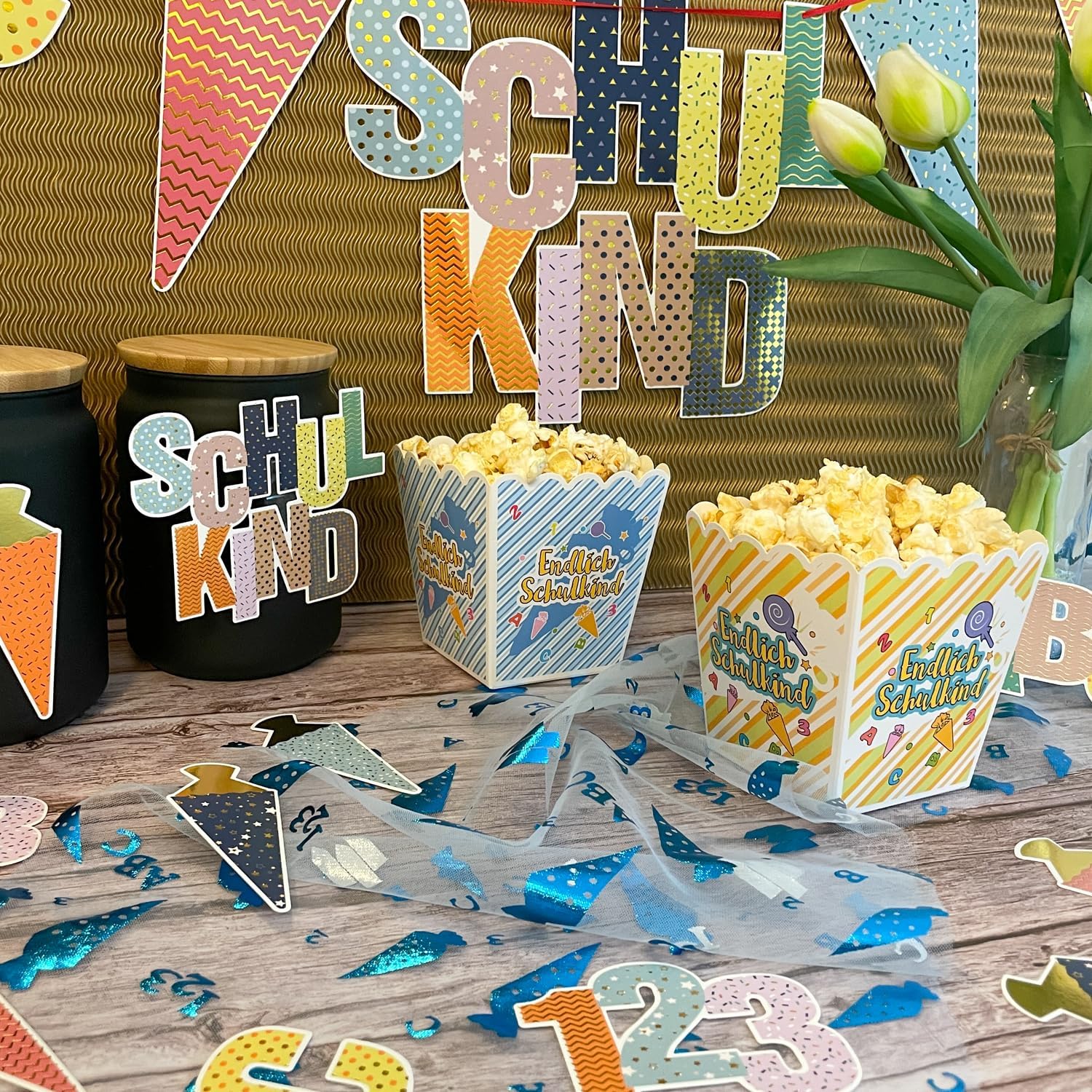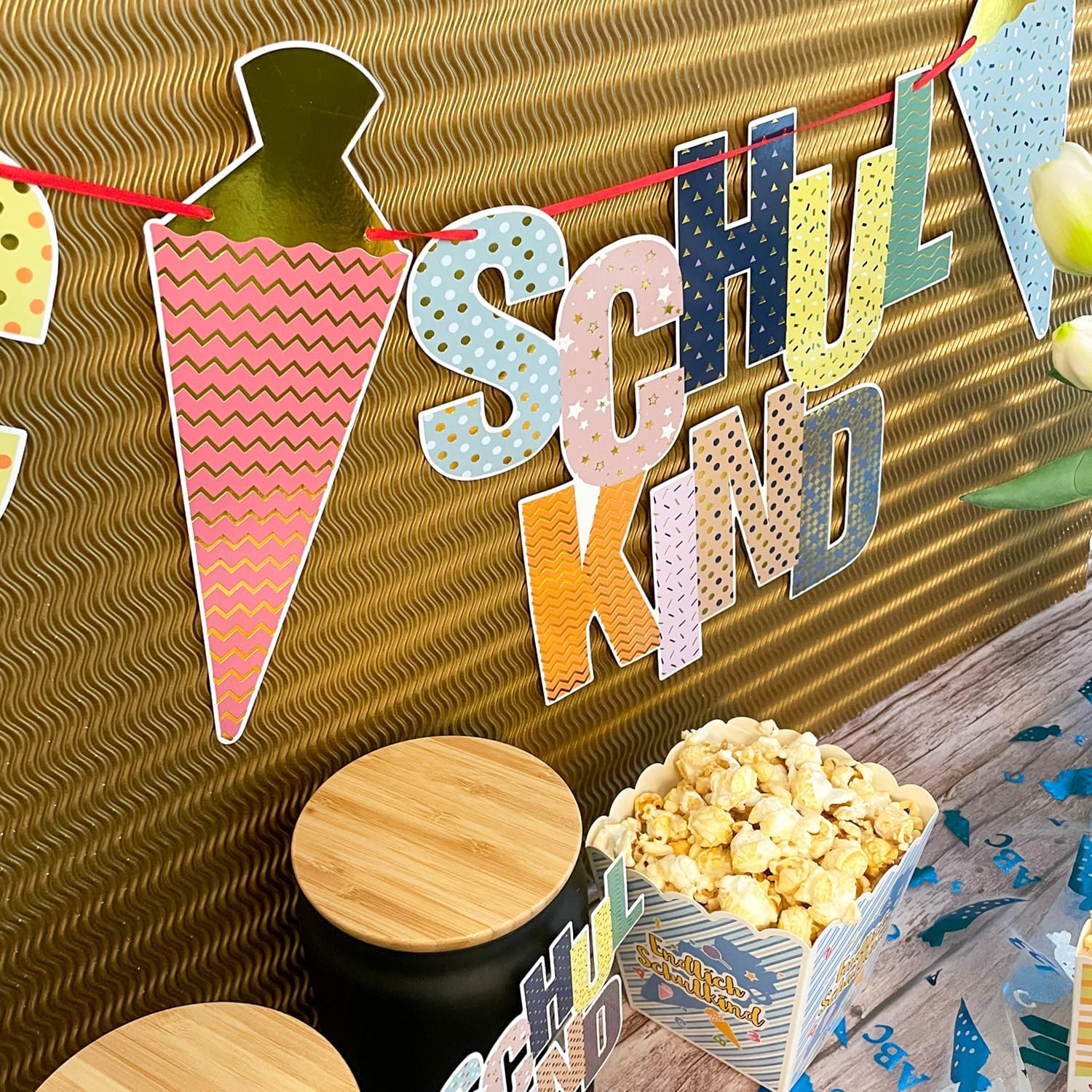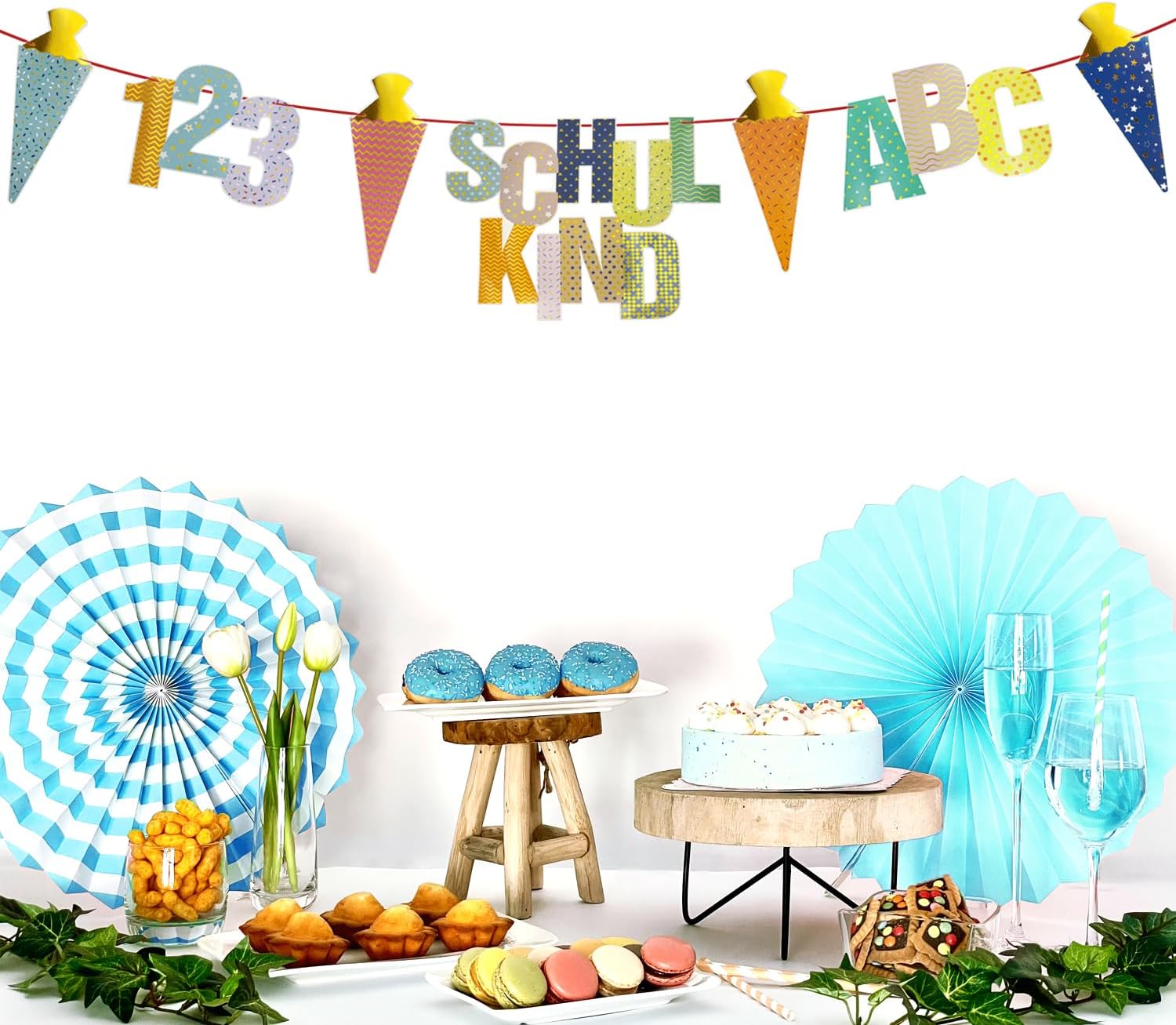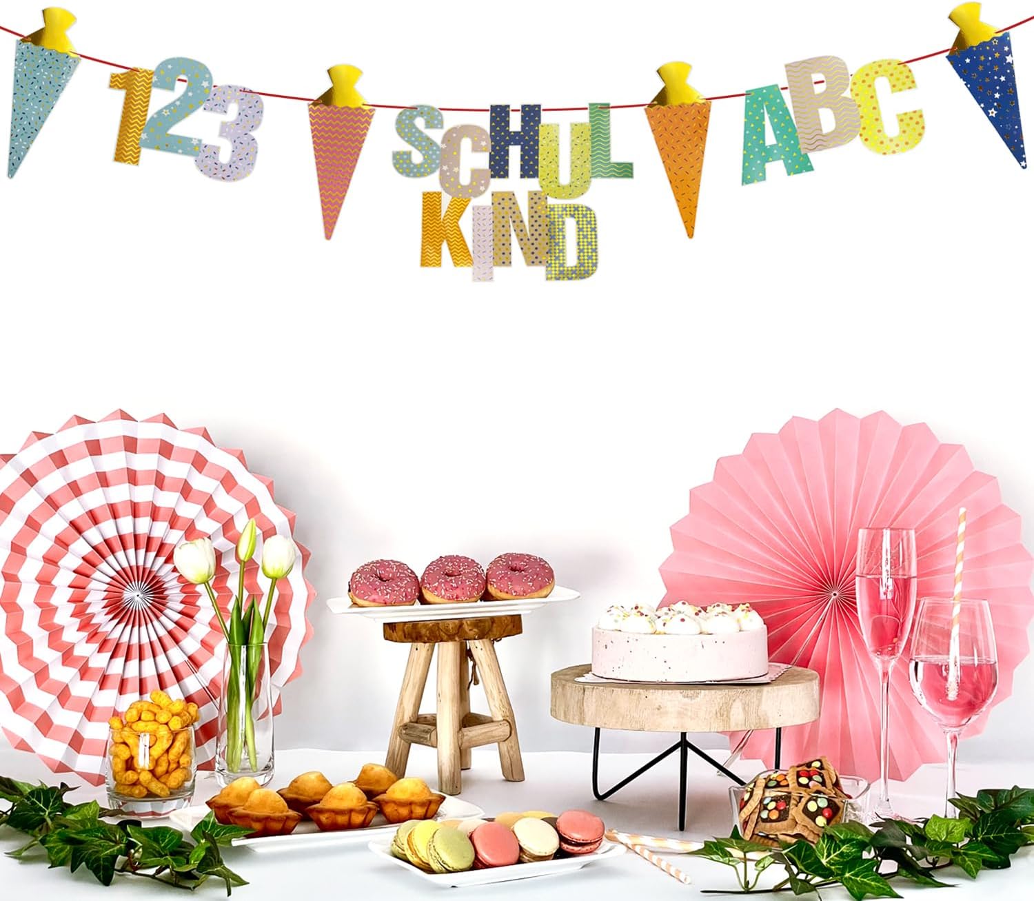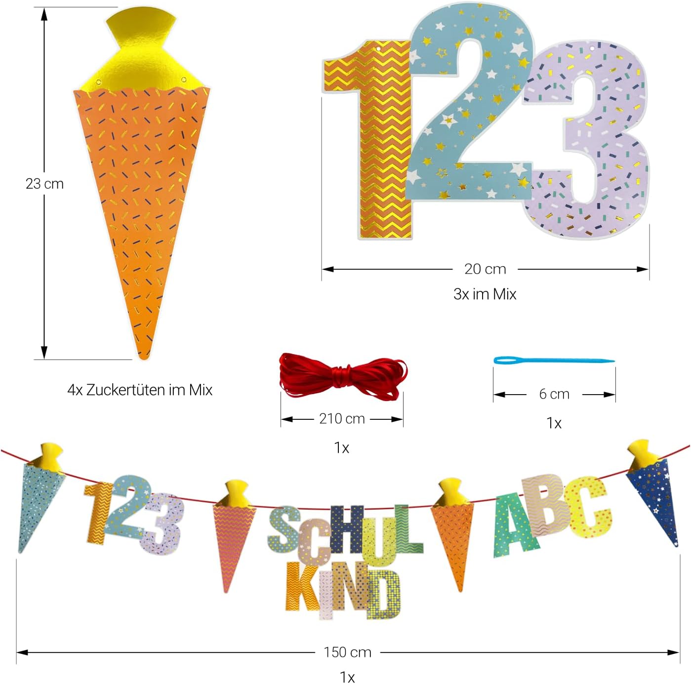 Per un perfetto inizio della scuola è incluso tutto: la ghirlanda contiene la scritta "Schulkind", lettere ABC colorate, 123 numeri, quattro coni di zucchero con accenti dorati, un nastro coordinato e un ago - subito pronti per l'uso per la vostra decorazione per l'inizio della scuola. Design colorato con effetto lucido: colori vivaci combinati con dettagli metallici lucidi attirano davvero l'attenzione - ideale come decorazione scolastica per ragazze e ragazzi. Materiale: cartone Grande e accattivante - dimensioni perfette per ogni stanza: scritta "Schulkind": 30 × 23 cm, ABC: 25 × 12,5 cm, 123: 20 × 12,5 cm, bustine di zucchero: 20 cm. La lunghezza totale della ghirlanda è di ca. 1,5 m - ideale per finestre, pareti o tavoli per feste. Utilizzabile per gli scopi più diversi – interni ed esterni: sia per l'iscrizione scolastica, l'inizio della scuola o come sfondo per le foto – questa decorazione è perfetta per ogni occasione e può essere meravigliosamente combinata con altri elementi fai da te. Progettata con amore: un highlight all'inizio della scuola: la ghirlanda non è solo una decorazione, ma anche un ottimo ricordo di uno dei giorni più importanti nella vita di un bambino. Ideale come regalo per l'inizio della scuola.