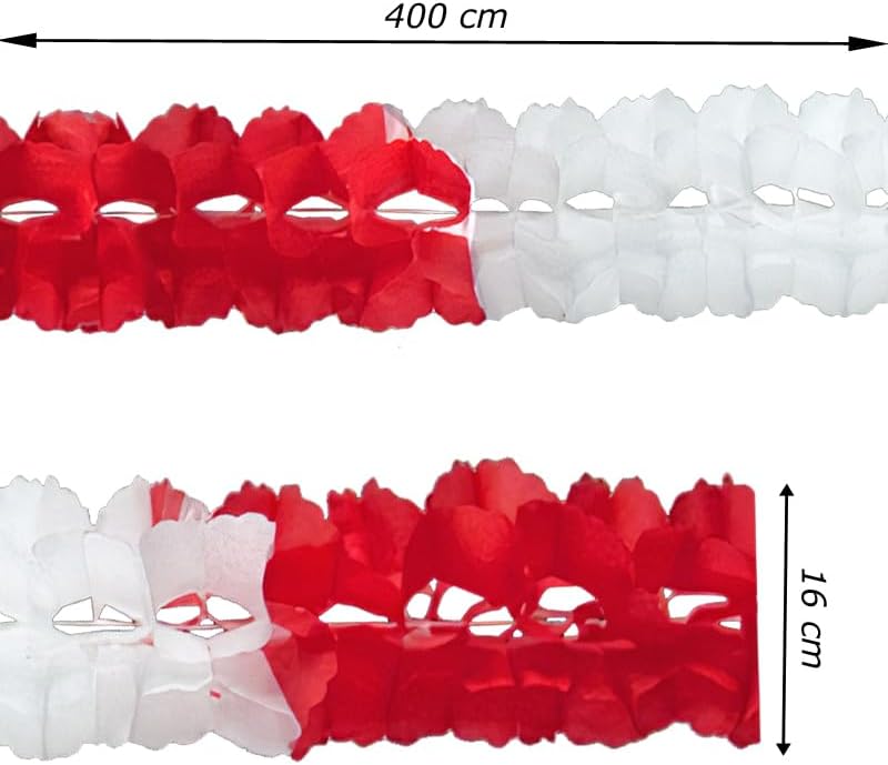 Dimensioni sufficienti per riempire la stanza: ciascuna delle due ghirlande per feste rosse e bianche ha una lunghezza di ca. 4 me un diametro di ca. 16 cm – sufficiente per sale per feste più grandi. Utilizzo versatile - Le ghirlande di carta a righe rosse e bianche sono perfette per feste a tema o in campagna, come decorazioni per il calcio, per carnevale, Capodanno, come decorazioni per i compleanni e molto altro ancora. Alta qualità - Realizzate in Austria con carta velina ignifuga, queste ghirlande di carta offrono alta qualità, durata e sicurezza per qualsiasi evento. Riutilizzabili: se usate con attenzione, le ghirlande per feste possono essere riutilizzate più volte, il che da un lato aiuta a risparmiare denaro e dall'altro ha un impatto positivo sull'ambiente. Facile da usare: le ghirlande di carta possono essere semplicemente aperte e poi appese nella sala delle feste a piacere o utilizzate come voluminosa decorazione da tavola.