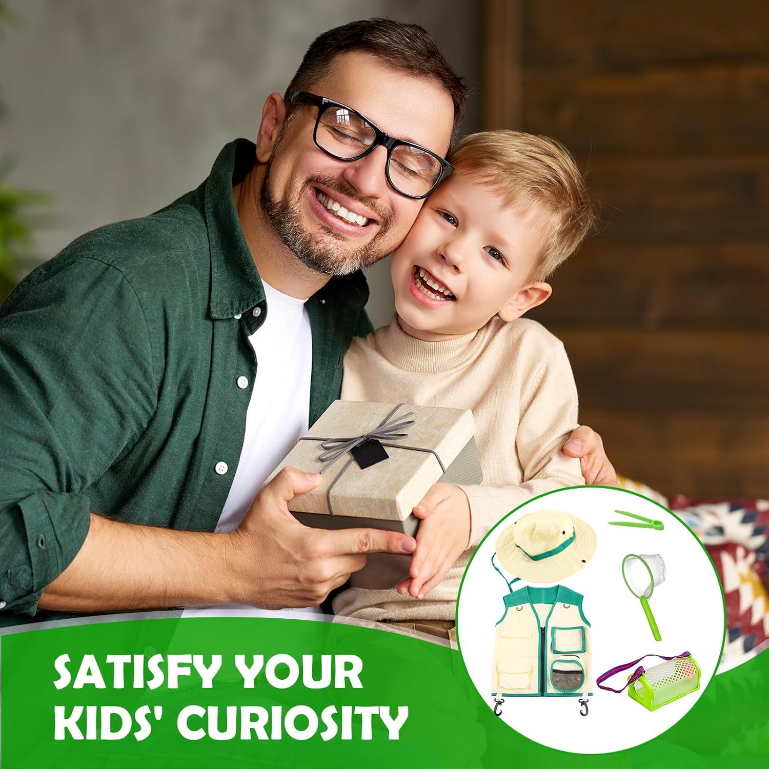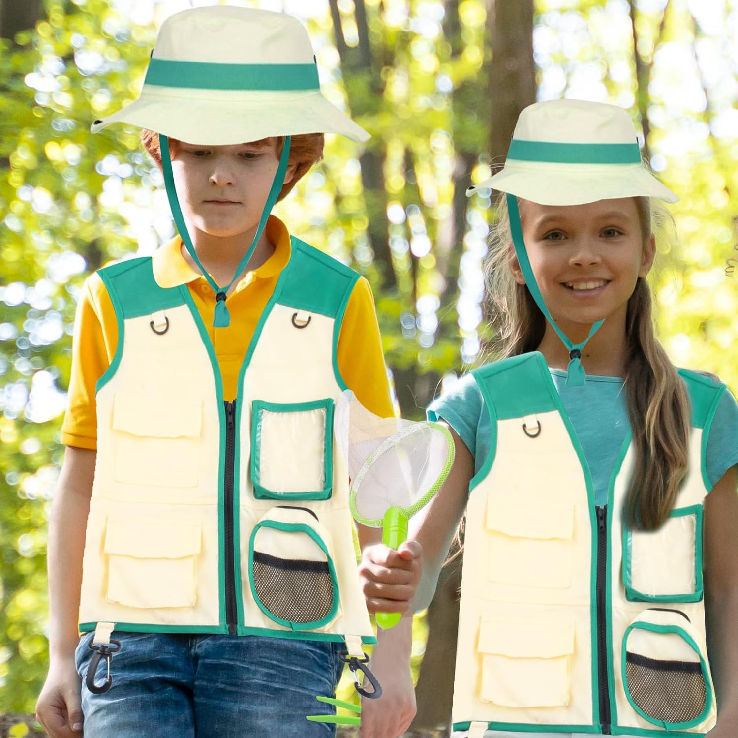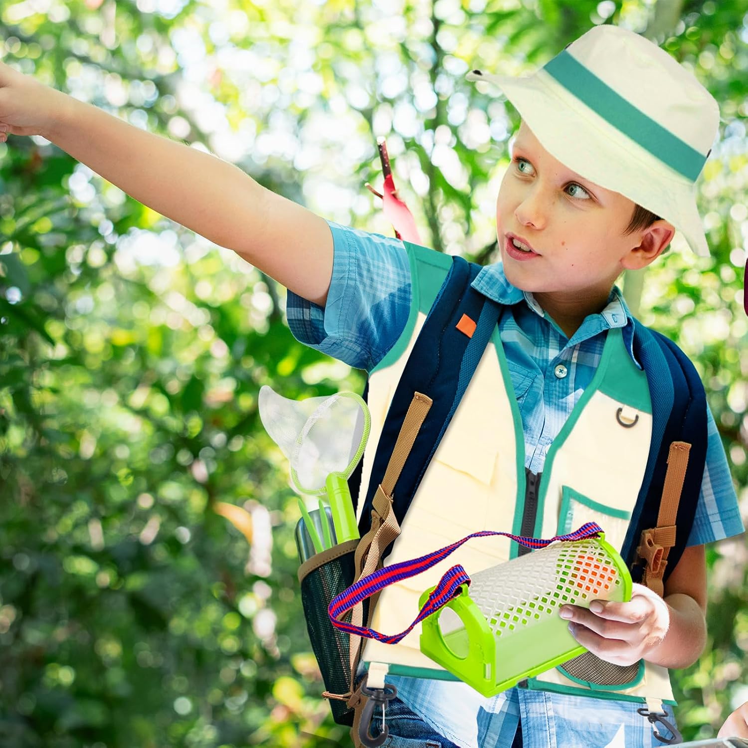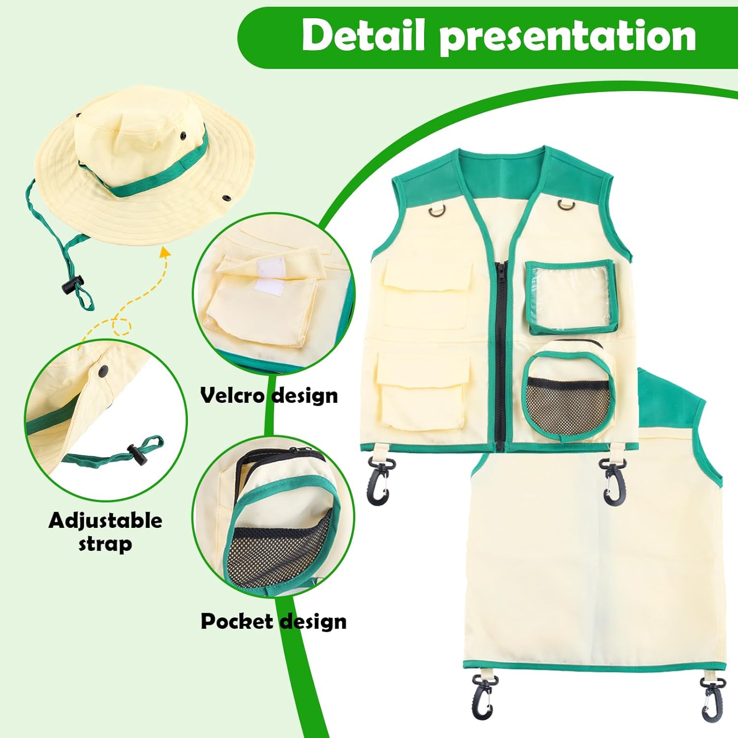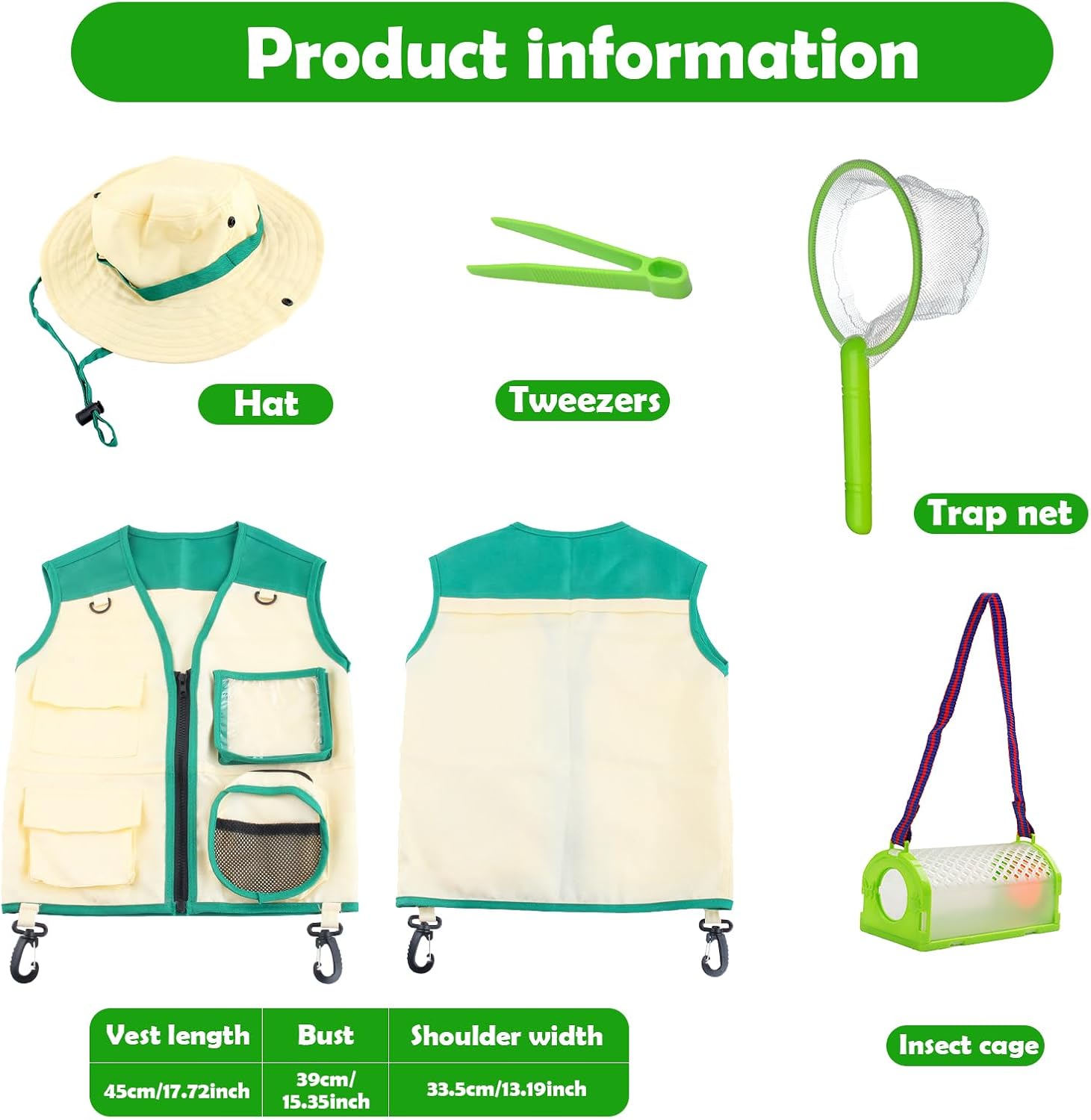 【Set di costumi da esploratore per bambini】: il set per catturare insetti costume da esploratore per esterni include: 1 pezzo di gilet verde, 1 cappello, 1 gabbia, 1 pinzetta e 1 rete, il set per catturare insetti costume da esploratore per esterni può rendere il tuo look più alla moda e luminoso e fare una profonda impressione. 【Materiale di alta qualità】: il costume da avventura all'aria aperta è realizzato in tessuto di alta qualità, adatto a bambini di diverse età e dimensioni; Gli oggetti di scena per la cattura di insetti per avventure all'aria aperta sono realizzati in materiale di alta qualità, con bordi lisci e senza angoli pungenti, con un buon comfort e possono essere riutilizzati. 【Misura regolabile】: il gilet è dotato di cerniera e tasche, il gilet ha anche un design con gancio su entrambi i lati, puoi appendere le tue cose su entrambi i lati per liberare le mani, il cappello è comodo e morbido al tatto e viene fornito con una fascia elastica che garantisce una vestibilità comoda. 【Accessorio per giochi di ruolo】 Il set di costumi da esploratore all'aperto ha una forma carina ed è perfetto come accessorio per costumi per l'esplorazione della foresta e giochi di ruolo in cui sei l'anima della festa. 【Esplorare la natura】: il set da esploratore verde per bambini è decorato con colori naturali, con questo set da esploratore per esterni i bambini possono conoscere meglio la natura, entrare in contatto con essa e scoprire la bellezza della natura.