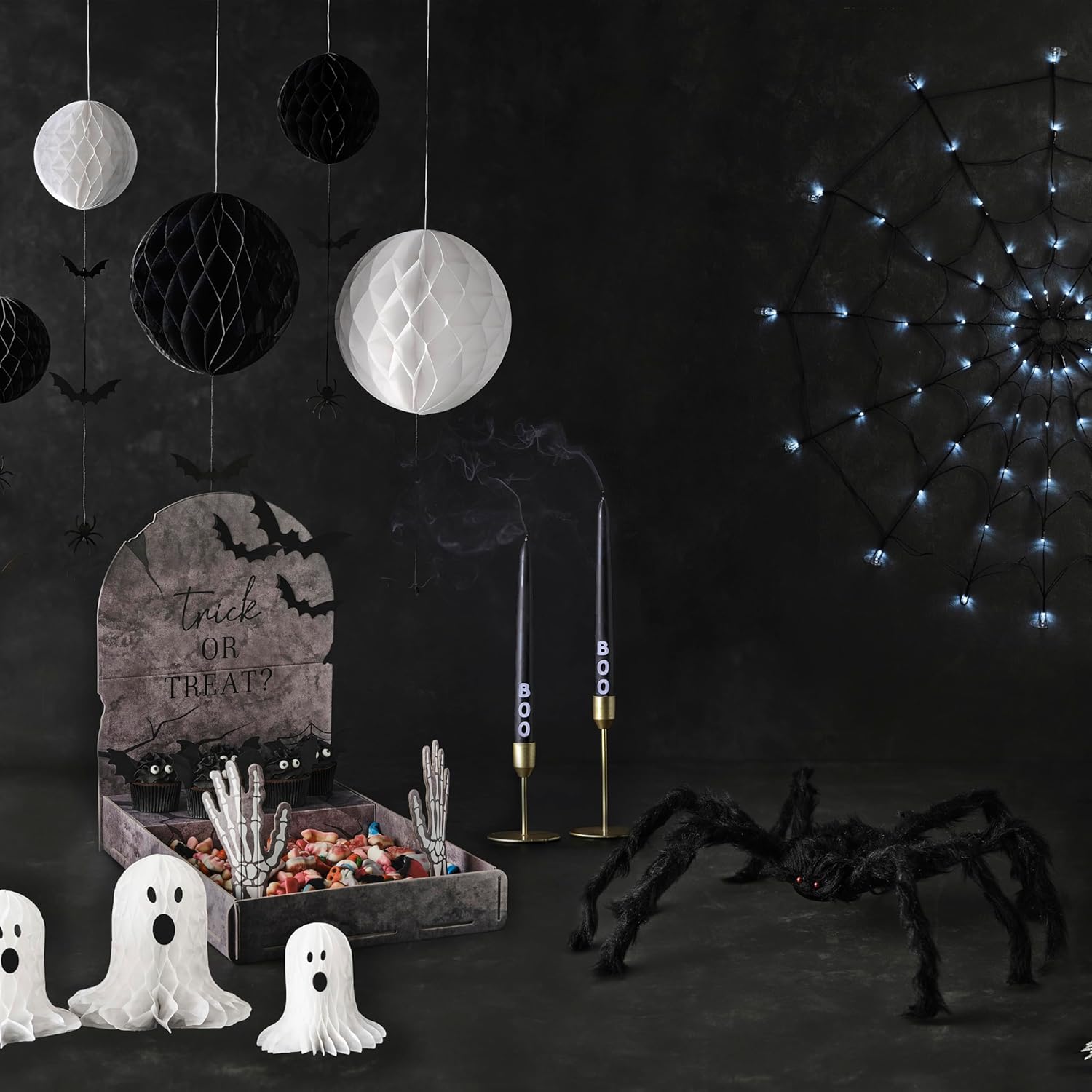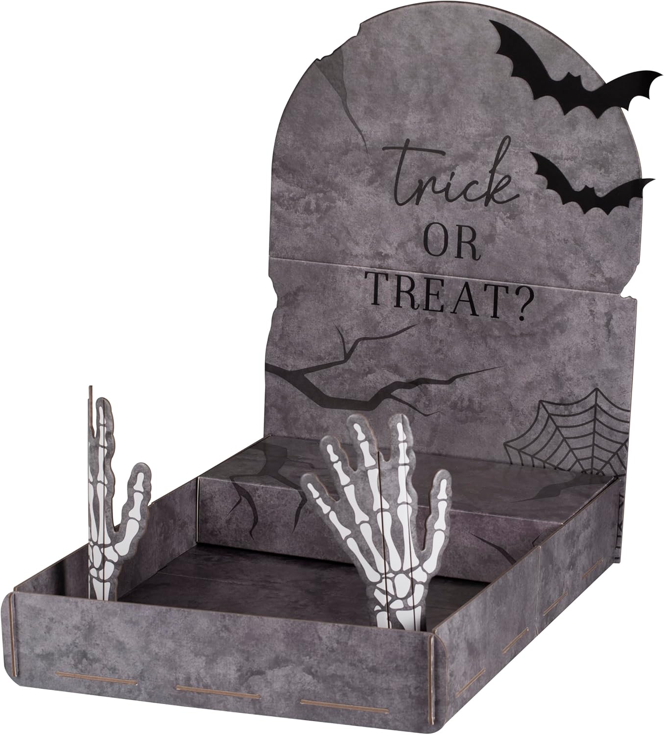 Porta dolcetti a forma di lapide realizzato in robusto cartone Include mani scheletrate, pipistrelli e pannelli stampati in grigio gotico Facile da montare e riutilizzare per feste di Halloween e buffet Centrotavola per esporre dolci, torte o snack Stampa fronte/retro per un effetto sorprendente da tutte le angolazioni