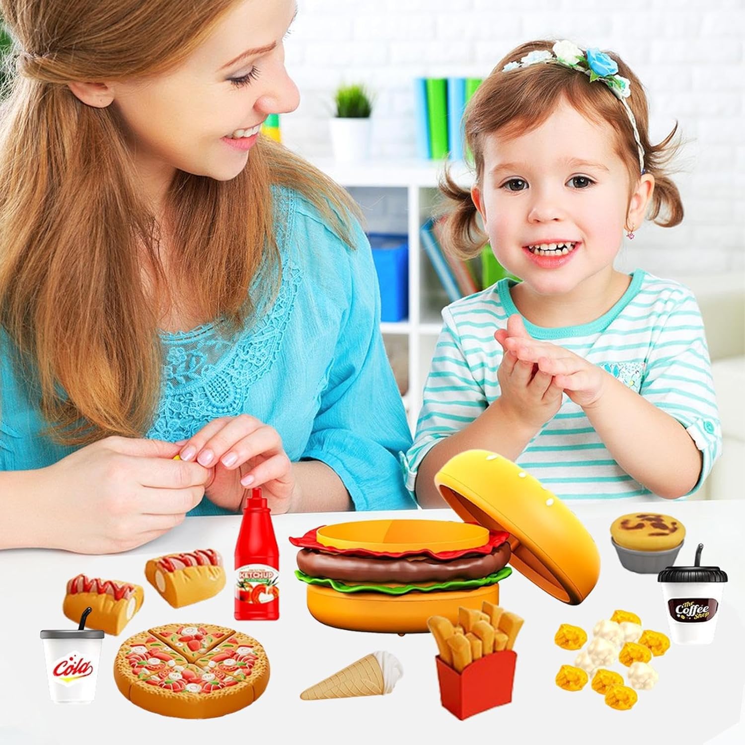 Essenziali del Gioco Simbolico: Accessori alimentari realistici combinati con colori vivaci sviluppano la creatività e mantengono l'interesse dei in scenari interattivi di cucina Benefici giocosi: Promuove lo sviluppo cognitivo attraverso attività che stimolano la riflessione logica e perfezionano le capacità motorie, con set alimentari-giocattoli interattivi che offrono benefici educativi. Partecipazione di Gruppo: Consente attività di gioco di ruolo condivise che stringono i legami familiari, incoraggia il gioco interattivo e promuove interazioni sociali positive per loro intorno a una cucina giocattolo completa. Durata Garanzia: la robusta costruzione in ABS garantisce il mantenimento degli standard di sicurezza durante i giochi d'imitazione prolungati in ambienti adatti, preservando le sue qualità a lungo termine senza deformazione Mobilità migliorata: ottimizza l'organizzazione e la mobilità grazie al suo design a forma di hamburger, sviluppando al contempo le abilità pratiche dei giochi creativi culinari