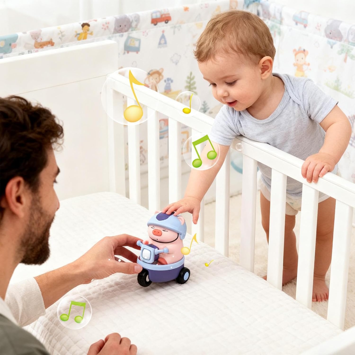 Materiale sicuro e inodore. Questi giocattoli per gattonare per bambini sono realizzati con materiali privi di sostanze nocive, offrendo tranquillità durante l'uso garantendo zero esposizione alle tossine. Ciò consente ai genitori di incorporare con sicurezza questi giocattoli nelle routine quotidiane, come ad esempio il sonno o le sessioni di sviluppo sensoriale, grazie alla loro composizione sicura. Incoraggia lo sviluppo motore: i giocattoli striscianti per bambini promuovono la crescita delle capacità motorie stimolando il movimento attraverso la rotazione, motivando i bambini a raggiungere e rotolare, contribuendo a sviluppare la forza del collo e della schiena per transizioni più verso le fasi di gattonamento durante il gioco quotidiano, incoraggiando così lo sviluppo fisico infantile in modo naturale e divertente. Luci e musica sincronizzate: questi giocattoli musicali per bambini integrano luci e musica sincronizzate con canzoni per bambini allegre per stimolare lo sviluppo uditivo e aumentare la felicità emotiva. Le melodie creano un'atmosfera calma e per il gioco quotidiano o il tempo di relax, aiutando il bambino a godersi momenti di intrattenimento che supportano il suo sviluppo uditivo e il benessere generale. Compagno di apprendimento precoce: questo giocattolo elettrico per gattonare consente ai bambini di godere di un miglioramento delle loro capacità motorie e di coordinazione -mano, creando momenti gioiosi di esplorazione che contribuiscono a un'educazione precoce completa. Attraverso il gioco interattivo e stimolante, i piccoli sviluppano la loro curiosità e scoperta del mondo in modo naturale, incoraggiando uno sviluppo cognitivo e fisico equilibrato divertendosi in un ambiente giocoso e sicuro. Caratteristiche per l'attenzione: incorpora luci LED lampeggianti e un taglierina rotante colorato, progettato per migliorare le capacità di tracciamento visivo, fornendo un'esperienza coinvolgente mentre il bambino si concentra sui modelli di movimento in vari ambienti di gioco.