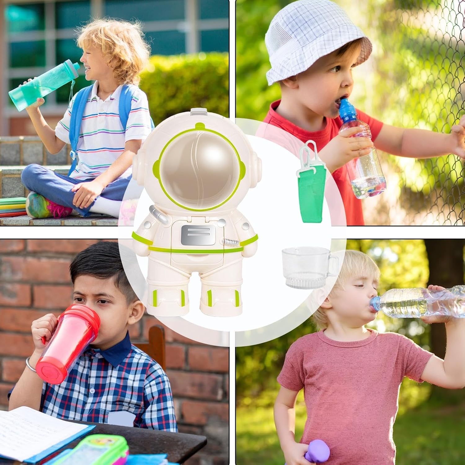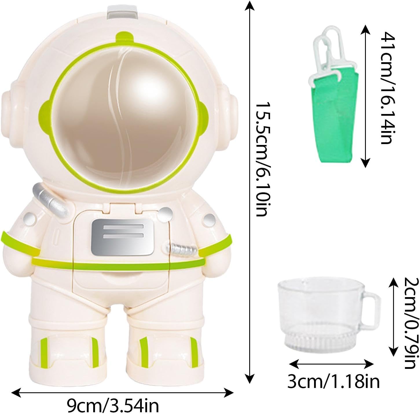 Materiale sicuro: realizzato con materiali ABS eccellenti, questo distributore d'acqua garantisce un'esperienza di consumo sana e sicura e garantisce che il tempo di gioco del tuo bambino sia divertente e attento. Promuovere le abitudini di consumo: fai in modo che il tuo bambino affronti giocosamente l'importanza dell'assunzione fluida con questo giocattolo del distributore d'acqua. Può essere riempito con acqua pura o altre bevande e allo stesso tempo funge da vero donatore, perfetto per la simulazione di scene reali. Forma di astronauta marcata: Lascia che l'immaginazione del tuo bambino funzioni liberamente con il nostro giocattolo del distributore d'acqua in un design del robot dell'astronauta. Questo esclusivo distributore d'acqua non solo offre al liquido, ma dona anche a ogni scrivania o comodino un tocco di divertimento e umore. Facile da trasportare: questo giocattolo compatto per dispenser d'acqua è stato sviluppato per mani piccole e ha una tracolla lunga 41 cm per un facile trasporto. Perfettamente adatto per escursioni e pic-nic, li adoreranno fornire liquidi all'aperto. Regalo di riscaldamento del cuore: promuovi l'interesse del tuo bambino per l'acqua potabile con questo regalo unico, che funge anche da giocattolo. Perfetto per ogni occasione. Assicurati che i tuoi consumano abbastanza liquidi anche nelle calde giornate estive.