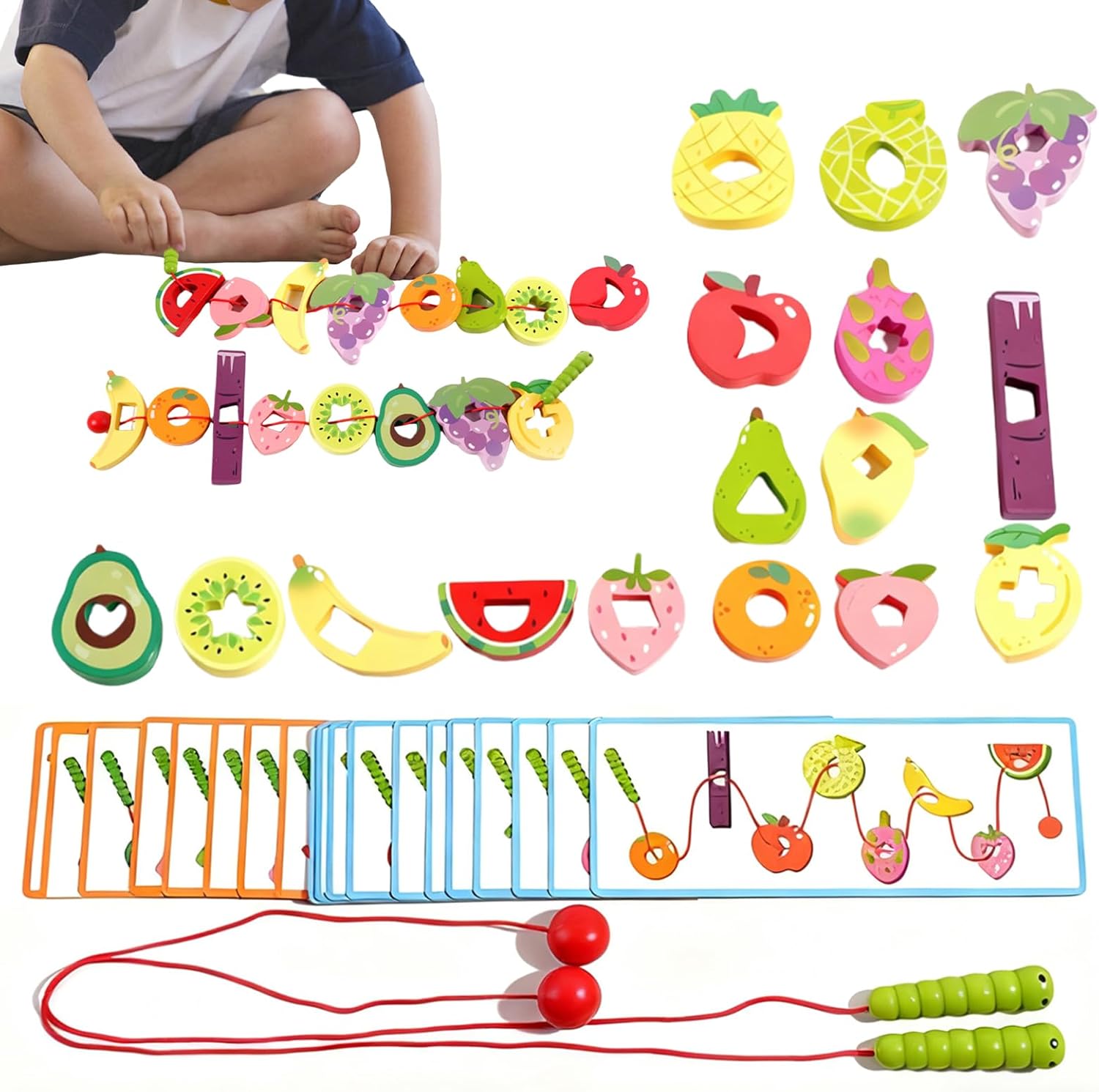 Incoraggia la crescita delle abilità: progettato con perline che si infilano su una corda, questo prodotto aiuta a perfezionare la coordinazione occhio-mano e il controllo motorio fine coinvolgendo i giovani studenti nell'afferrare, pizzicare e ruotare durante attività di gioco fantasiose Coinvolgente scoperta dei colori: perline e fili per bambini realizzati con colori sorprendenti ad alta saturazione che ricordano i frutti di tutti i giorni, tra cui mele, banane e fragole, incoraggiano i giovani studenti a esplorare e riconoscere i colori senza sforzo, promuovendo gioiosi momenti educativi all'interno o all'esterno Perline di legno lisce: le perline per bambini costruite in legno massiccio forniscono un'esperienza di gioco sicura e sicura attraverso superfici di sbavature e corde resistenti, consentendo ai bambini piccoli di partecipare comodamente ad attività di sviluppo sensoriale, sia all'interno che all'interno di scenari di gioco educativi di gruppo Un momento di gioco coinvolgente e indispensabile: il giocattolo allacciato migliora l'interazione genitore-figlio con la narrazione a tema , insegnando ai bambini a identificare colori e forme mentre momenti di amore e divertimento, offrendo incoraggiamento in un ambiente di gioco stimolante Design elegante: i giocattoli che infilano i bambini progettati come un che mangia frutta catturano l'attenzione dei giovani attraverso aspetti vivaci e , favorendo lo sviluppo sensoriale e la coordinazione occhio-mano in scenari di gioco coinvolgenti