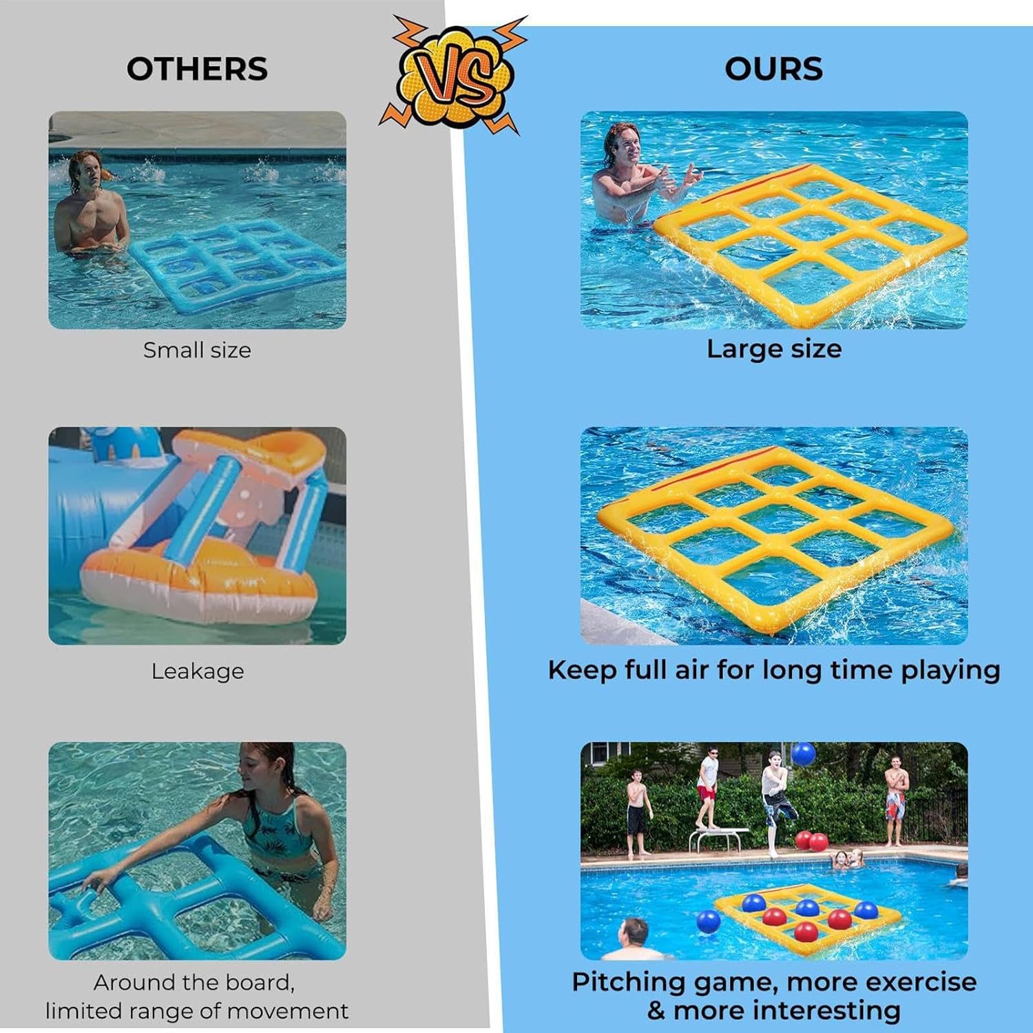 Materiale sicuro: progettati con un'innovativa tecnologia di tenuta, questi set da piscina garantiscono che non vi siano perdite e allo stesso tempo offrono superfici , senza irritazioni e una costruzione multistrato resistente, migliorando la sicurezza e il divertimento in ambienti acquatici. Accessori divertenti e funzionali: il set di giochi da piscina include colori vivaci per una maggiore visibilità, una tavola grande, palline gonfiabili e strumenti facili da gonfiare, garantendo un'esperienza piacevole e senza problemi. Attività di gruppo interessante: Promuove la connessione tra famiglia e amici, migliorando il coordinamento mano- attraverso giochi interattivi in piscina che combinano strategia e abilità di lancio, per esperienze di gioco coinvolgenti. Uso multiplo: ideale per feste o divertimento quotidiano, questo tavolo offre spazio di archiviazione senza sforzo e si adatta perfettamente a piscine, spiagge e cortili, migliorando i momenti di svago con una versatile adattabilità. Ottimo regalo: combinando utilità e divertimento, questo set è ideale per vacanze o compleanni, creando ricordi e interazione duraturi per tutte le età.