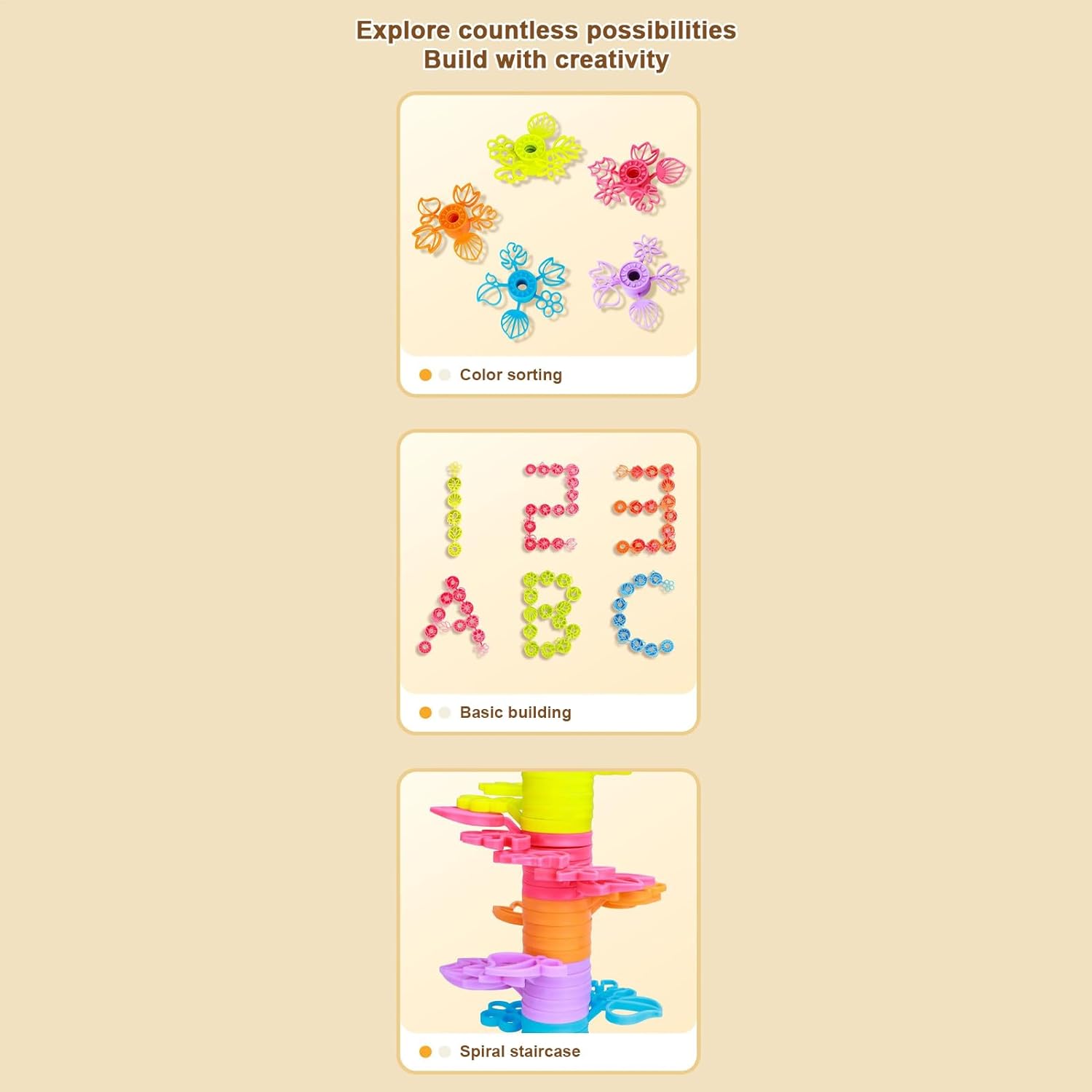 Design creativo: giocattoli impilabili con varie forme e colori promuovono il gioco fantasioso, consentendo ai bambini di sperimentare costruzioni creative che stimolano la risoluzione dei problemi in ambienti prescolari o aree di gioco familiari Intensificare l"unione familiare: Offre sfide di impilamento aperte che stimolano la creatività e promuovono il pensiero critico, generando opportunità per preziosi momenti familiari rafforzando capacità di comunicazione e collaborazione Sviluppo delle abilità: i giocattoli impilabili migliorano il pensiero logico e la pianificazione incoraggiando la concentrazione e l'immaginazione spaziale, ideali per i bambini per sviluppare abilità di risoluzione dei problemi in modo divertente durante il gioco Comodo trasporto: progettati con una scatola di immagazzinaggio incorporata, questi giocattoli impilabili semplificano l'organizzazione e offrono mobilità senza sforzo, dando libertà ai bambini di esplorare giochi fantasiosi in cortili, aule o vacanze, incoraggiando la creatività in qualsiasi ambiente Durevoli: Con un design robusto, questi giocattoli impilabili per bambini offrono prestazioni affidabili grazie a materiali di alta qualità, garantendo sicurezza e longevità per innumerevoli ore di divertimento fantasioso durante il gioco creativo in interni o esterni