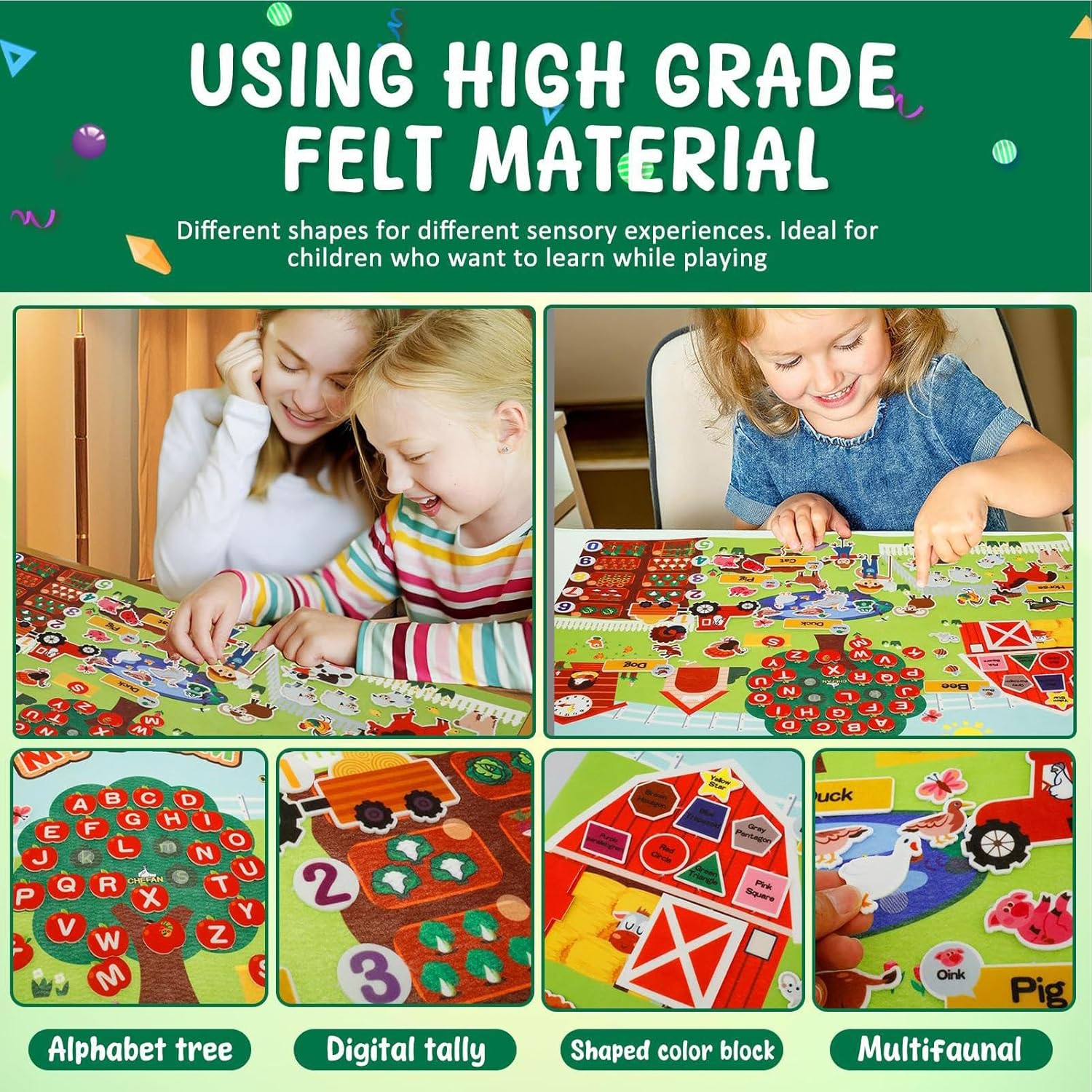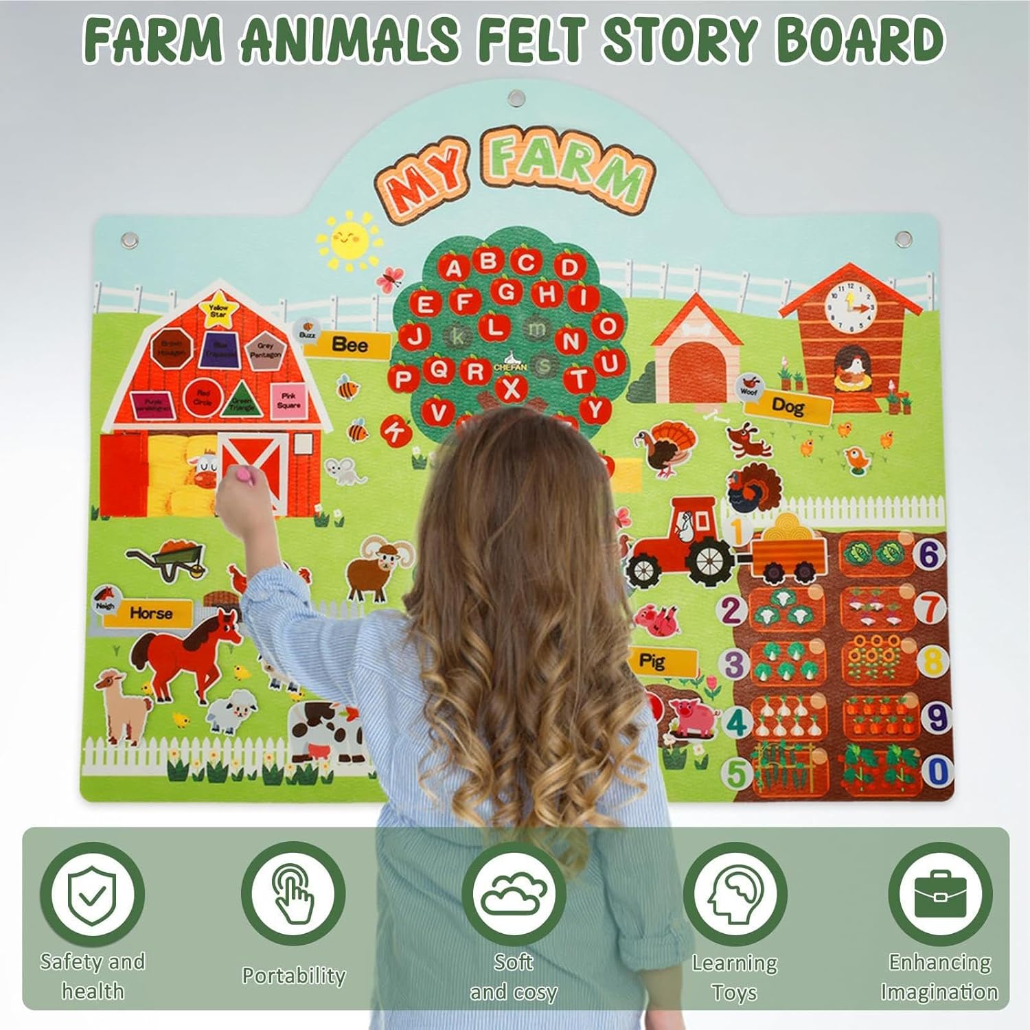 Esercitate creatività: eccita i tuoi succhi creativi ed esplora nuovi orizzonti usando il nostro set di storie di board. Crea e interpreta diverse storie agricole usando una miriade di personaggi animali e oggetti di scena per migliorare la tua immaginazione e creatività, con una vasta gamma di storie in attesa di essere raccontate Migliora le capacità di narrazione: i nostri set di storie di board incoraggiano l'interazione, la comunicazione e la coopplicazione tra familiari e amici mentre ed eseguono narrazioni coinvolgenti, perfette per coloro che vogliono sviluppare i loro talenti narrativi Design per bambini: realizzato con feltro di alta qualità, il nostro set di storie è morbido e comodo con cui i bambini possono giocare. Siate certi che non irrita o danneggerà tuo figlio, garantendo un di gioco sicuro e divertente. Divertiti con la pace della mente Uso ampio: con i nostri set di storie di board di feltro, tuo figlio migliorerà le loro prime capacità di alfabetizzazione attraverso la coinvolgimento di narrazione, giochi divertenti e il conteggio 'apprendimento e il riconoscimento del colore. per l'educazione prescolare, fornisce un'ampia applicazione che lo rende una scelta ideale per genitori e insegnanti Acquisire la conoscenza della fattoria: il nostro set di storie di board di feltro, misura 81 68,5 cm, è un modo fantastico per i bambini di conoscere l'ambiente agricolo. Usando la tavola di feltro interattivo, i bambini possono immergersi in un mondo di animali e numeri, rendendo l'apprendimento divertente e coinvolgente