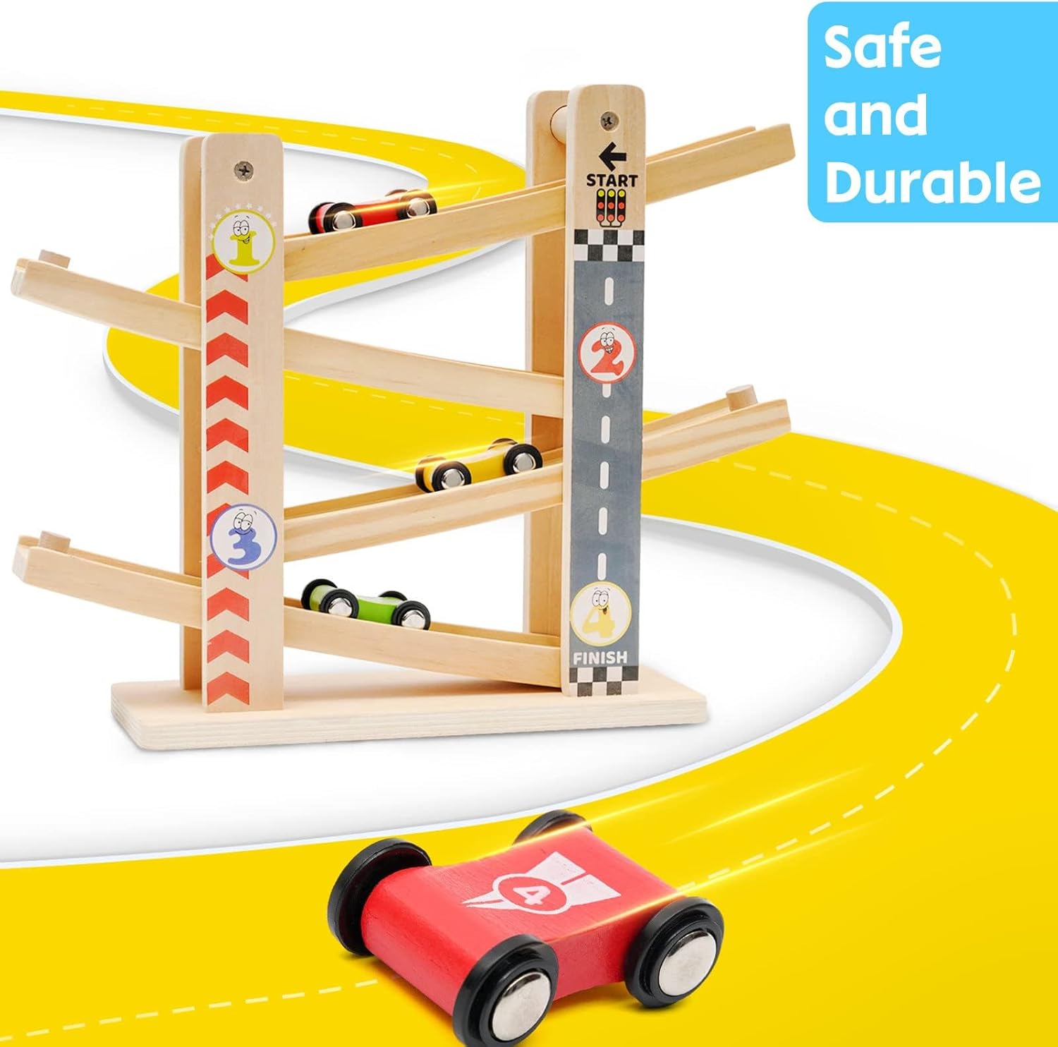 ADOZIONE DEL LEGNO DI ALTA QUALITÀ: il giocattolo da rampa per auto in legno è realizzato in legno di alta qualità con vernice a base d'acqua atossica brillante - Tutti gli angoli sono lisci e delicati e le viti sono fissate saldamente e resistenti. GIOCATTOLO PER L'APPRENDIMENTO PRESCOLARE: questo giocattolo da rampa per auto in legno - incoraggerà lo sviluppo della coordinazione occhio-mano e della capacità di attenzione del tuo bambino - svilupperà le capacità di comunicazione. PIENO DI EFFETTI INVITANTI - Il suono delle auto da corsa sulla pista può attirare rapidamente l'attenzione di un bambino quando piange. La rampa da corsa è dotata di 4 auto e 4 rampe, offrendo l'opportunità di gareggiare con i tuoi bambini. FACILE DA CONSERVARE E MIGLIOR REGALO: il bellissimo design non solo può essere visualizzato in una stanza, ma eccelle anche nella ricchezza del gioco che promuove naturalmente la crescita dei bambini. Il regalo perfetto per ragazzi e ragazze di 1-5 anni. Il miglior regalo per i bambini: sarebbe un buon giocattolo per i bambini. Bel colore e la taglia giusta, facile da maneggiare per i bambini. Può essere un regalo di compleanno, un regalo per il giorno dei bambini, un regalo di Natale o un premio per i nostri adorabili bambini.