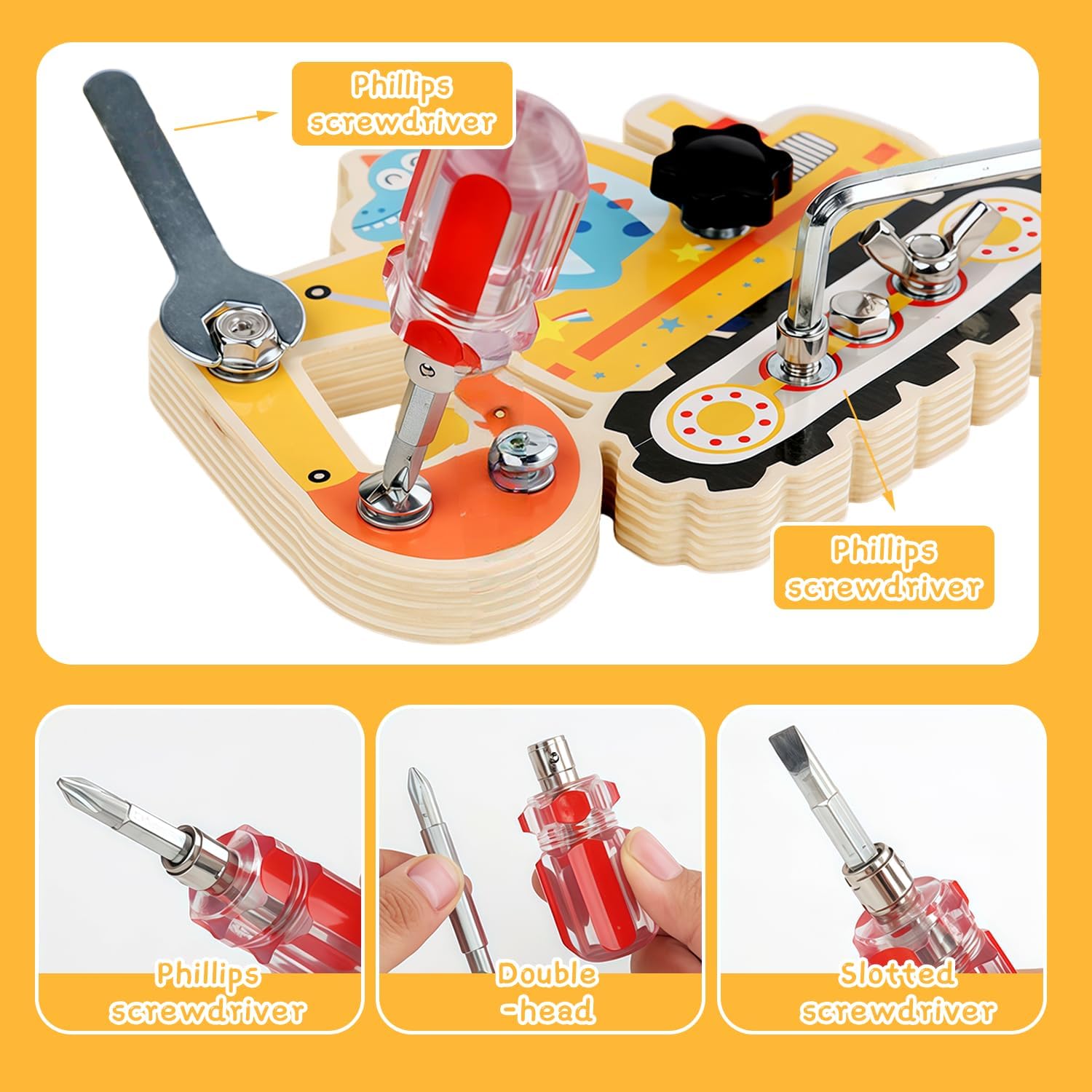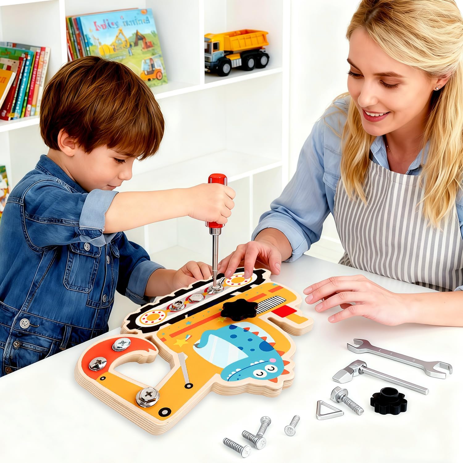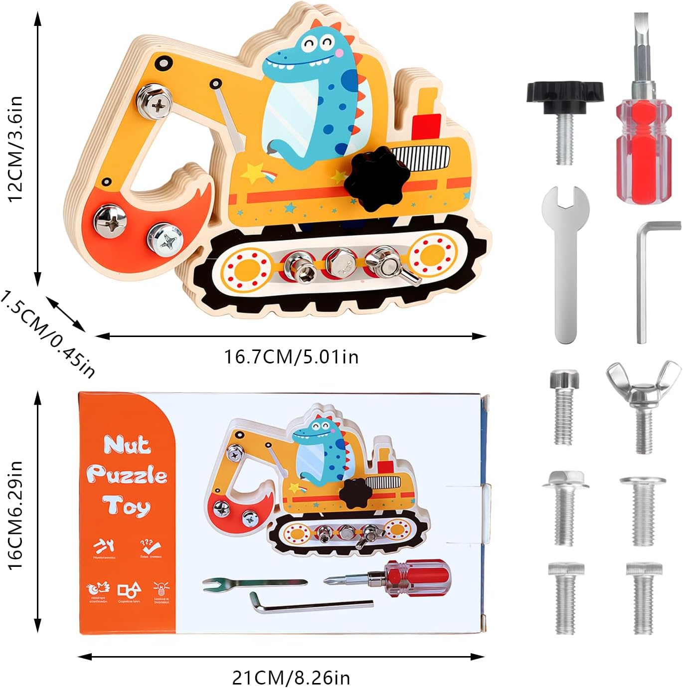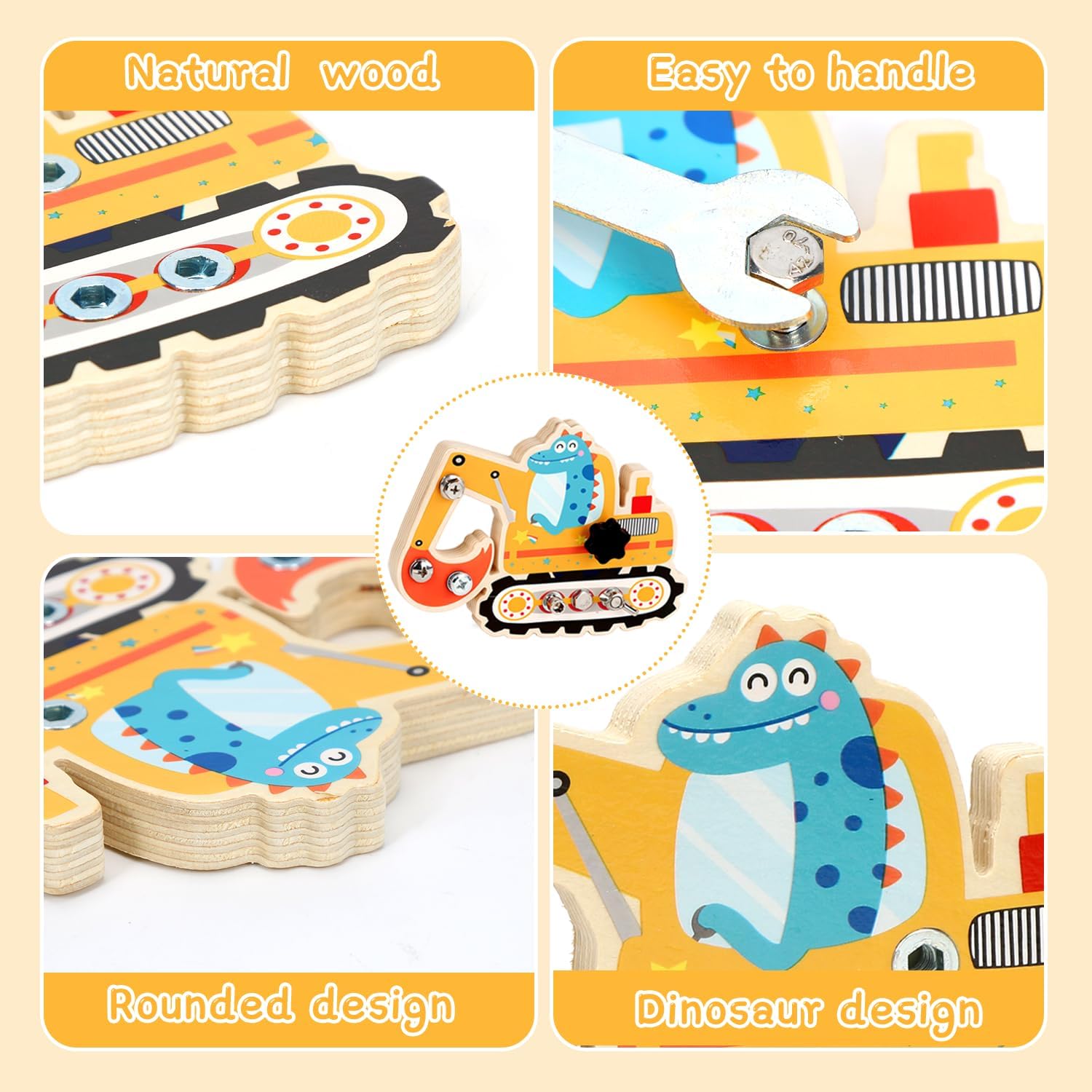 🦕【Giocattoli Montessori dai 3 anni in su】Con 7 viti diverse e 3 strumenti,questo set promuove in modo giocoso le capacità motorie fini,il ragionamento spaziale e la capacità di problem solving del tuo bambino.Impara attraverso l'esperienza,completamente senza pressione. 🌳【Materiali naturali e di alta qualità】La tavola delle viti è realizzata in legno massello e naturale,privo di spigoli vivi e schegge.Le viti e gli strumenti in metallo sono di alta qualità,hanno una superficie liscia e antiruggine e sono perfetti per le manine dei bambini.Le vernici atossiche a base d'acqua garantiscono un'esperienza di gioco senza preoccupazioni. 🧠【Giochi rompicapo】La tavola delle viti Montessori allena intensamente la coordinazione occhio-mano,la pazienza e il pensiero logico.Ogni vite presenta una nuova sfida e rafforza la fiducia in se stessi quando il bambino la risolve in modo indipendente. 🚀【Interessante tema meccanico】Questo splendido tabellone con viti,caratterizzato da una grafica accattivante raffigurante dinosauri ed escavatori,cattura l'interesse dei bambini e li incoraggia a giocare ed esplorare,rendendolo il preferito assoluto per bambini e bambine dai 3 anni in su. 🎁【Regalo perfetto per bambini e bambine】Che sia per un compleanno,per Natale o semplicemente per un regalo,questo tabellone con viti Montessori è un regalo ideale.Non è solo divertente,ma promuove anche lo sviluppo a lungo termine,rendendolo la scelta ideale per i genitori che apprezzano i giocattoli educativi di alta qualità.