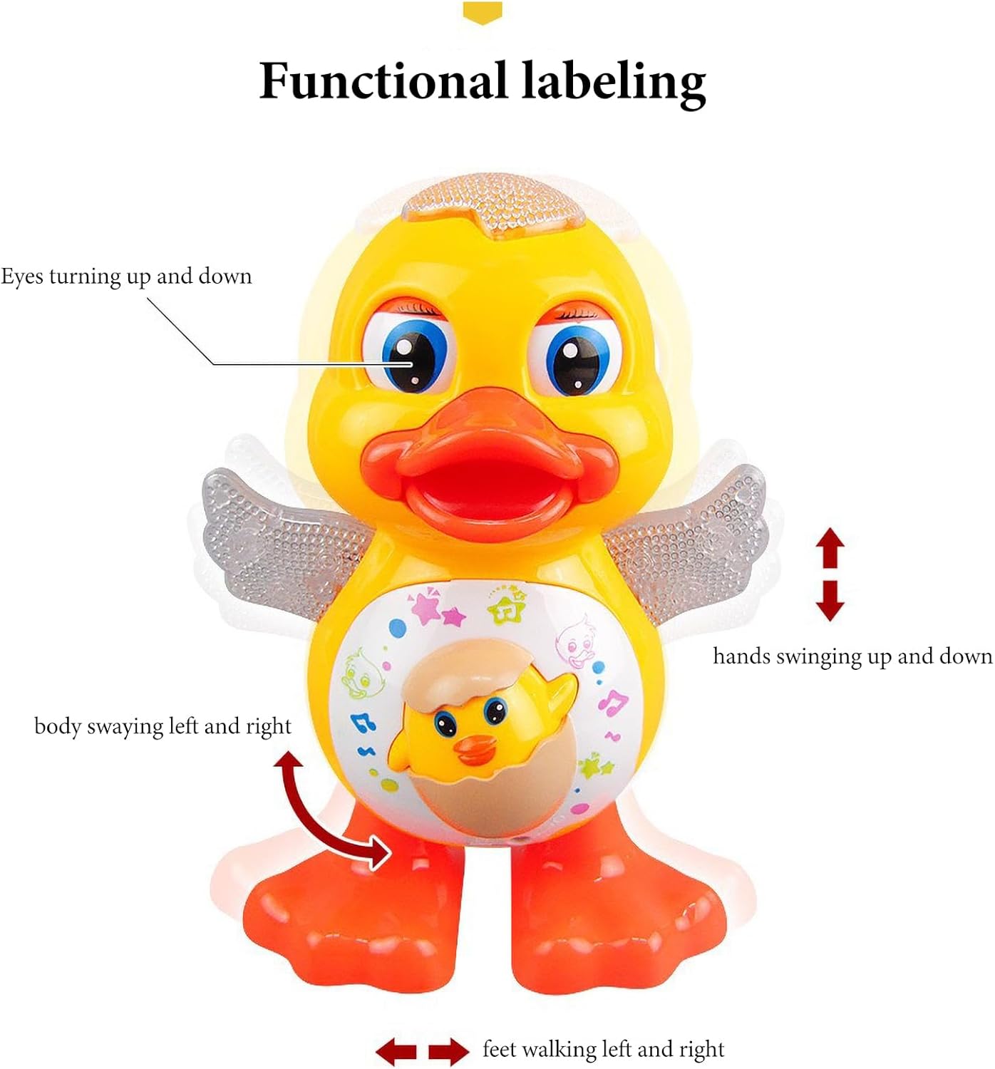 Gioco Illuminato:Dotata di schemi cangianti e bagliore LED su testa e zampe, 'garantisce sessioni di gioco piacevoli, adattandosi perfettamente agli ambienti poco in modo naturale. Intrattenimento Ritmico: Presenta movimenti animati di , rotazioni del corpo e sincronizzazione con musica ritmata per un'esperienza di gioco coinvolgente Strumento Educativo: Divertimento per la prima infanzia che migliora le capacità audiovisive con esperienze interattive, stimolando l'apprendimento in modo naturale ed efficace durante il gioco. Gioco Genitori-Figli: Favorisce attività ludiche condivise che nutrono la connessione emotiva, regalando interazioni significative durante momenti di qualità per una felicità duratura Costruzione ABS Affidabile: Realizzata in solido materiale ABS, l'ballerina offre eccellente resistenza all'usura e agli urti, soluzione riutilizzabile che rimane intatta anche dopo uso prolungato