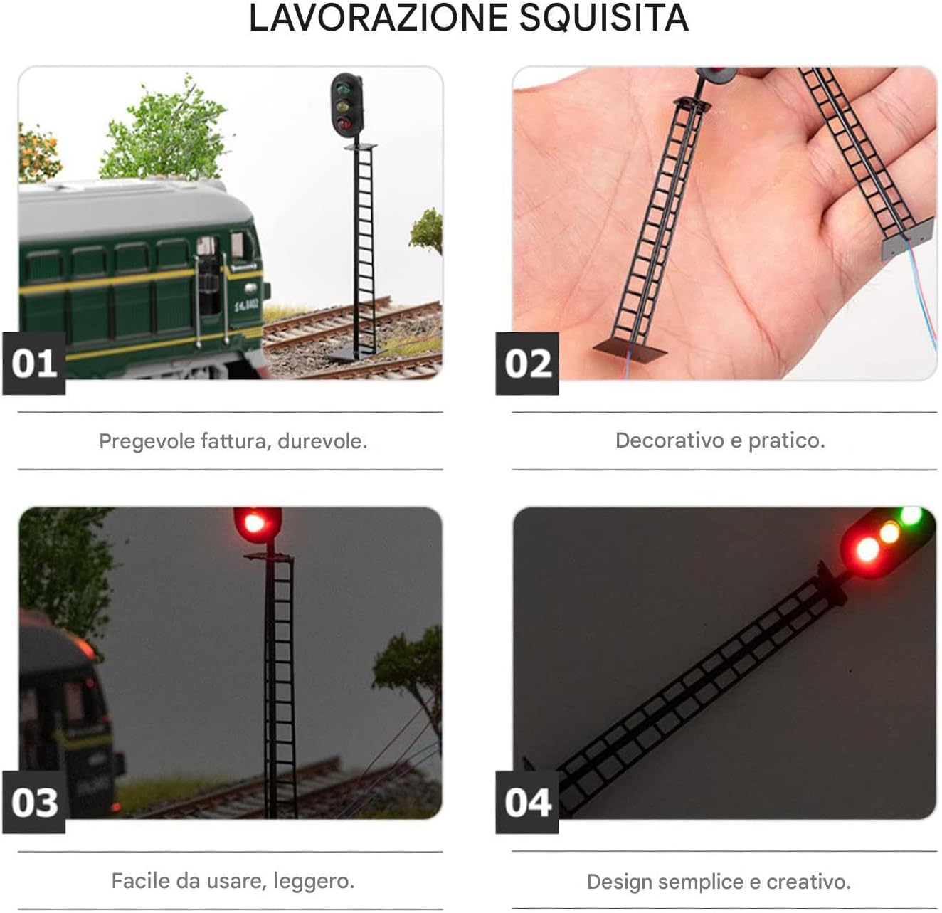 Migliora il realismo: size perfettamente per posizionare in case in miniatura o configurazioni di tavoli di sabbia, questo giocattolo del semaforo fornisce dettagli più realistici, rendendo qualsiasi scena in miniatura più affascinante Decorazione creativa per la casa: aggiorna il tuo tavolo di sabbia configurazione con questo intricato giocattolo del semaforo, offrendo una fantastica decorazione per la casa per amici o familiari che apprezzano bellissimi accenti Migliora il realismo del tavolo di sabbia: con luci verdi, gialle e rosse, questo modello di semafori ferroviari realistici è progettato per creare ambienti caldi Articoli di decorazione in miniatura: scatta alcune belle foto con questo giocattolo del semaforo, un must per display creativi e abbaglianti oggetti di scena fotografiche. I tuoi figli lo adoreranno Ampia applicazione: aggiornare il realismo della decorazione del paesaggio del tavolo di sabbia con questi semafori unici. Progettato specificamente per case in miniatura, offrendo una gamma di usi creativi