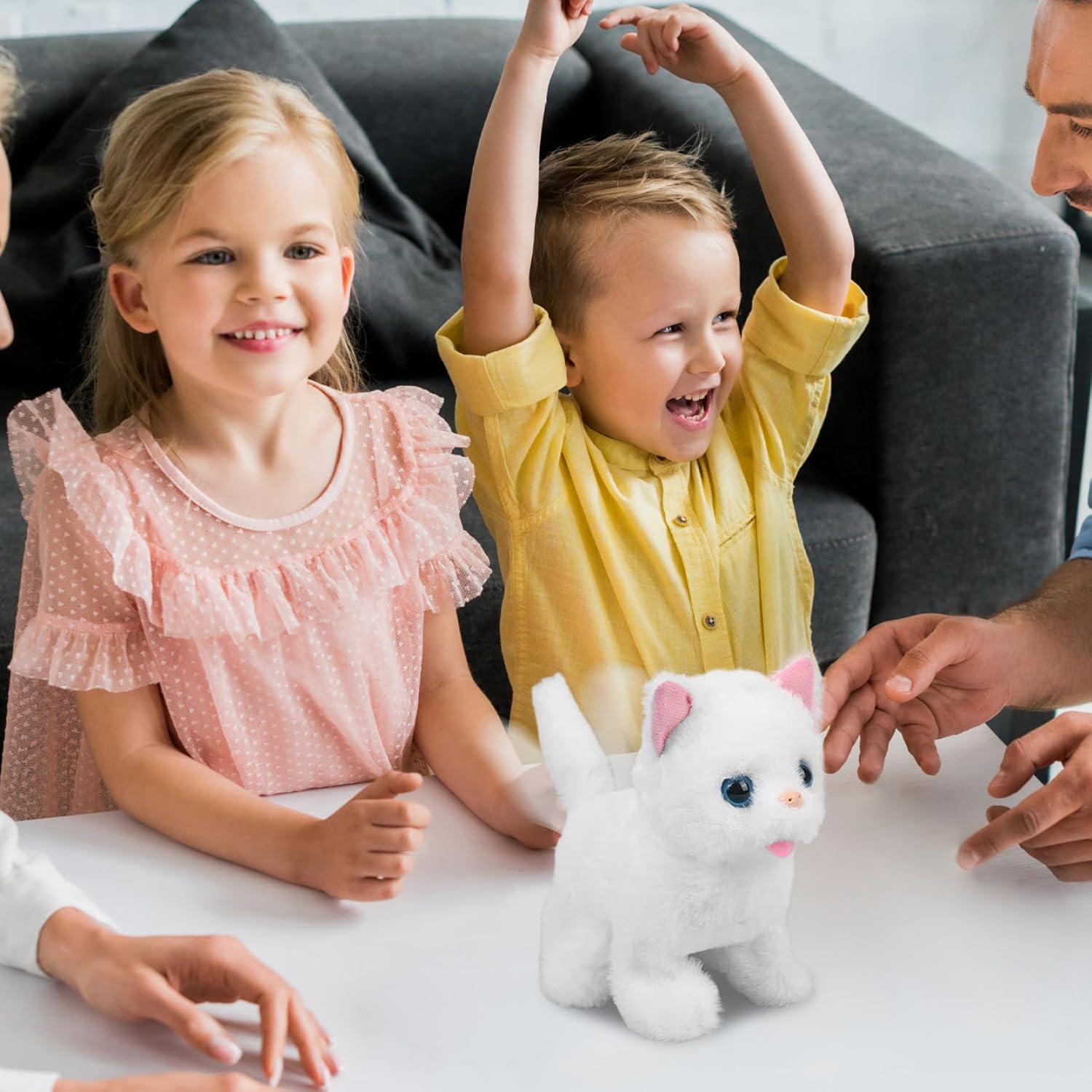 Richiede una configurazione minima: basta installare 2 batterie AA (non incluse) e questo gatto giocattolo è pronto per il divertimento!.Il suo design intuitivo garantisce che i bambini possano iniziare rapidamente a giocare senza una configurazione complicata. Design morbido e coccoloso: misurato 6.69x3.94x6.69 pollici, questo gatto giocattolo di peluche è realizzato con materiali morbidi e di alta qualità perfetti per coccole..È il compagno ideale per le avventure di gioco e le accoglienti sessioni di coccole. Caratteristiche a piedi interattive: guarda il viso di tuo figlio illuminarsi mentre questo peluche cammina e miagoli!.Il design interattivo fa divertire i bambini, incoraggiando il gioco immaginativo con una vivace esperienza simile a animali domestici. Adorabile azione che scodinda la coda: questo gatto giocattolo agita la coda mentre cammina, aggiungendo un tocco divertente e giocoso che imita il vero comportamento del gatto..I bambini apprezzeranno i deliziosi movimenti, rendendo questo giocattolo un'aggiunta accattivante alla loro collezione. Regalo perfetto per ogni occasione: sia per Pasqua, Natale che per i compleanni, questo gatto giocattolo fa un regalo affascinante per i giovani amanti degli animali..Le sue adorabili caratteristiche di design e interattive porteranno gioia e eccitazione a qualsiasi celebrazione.