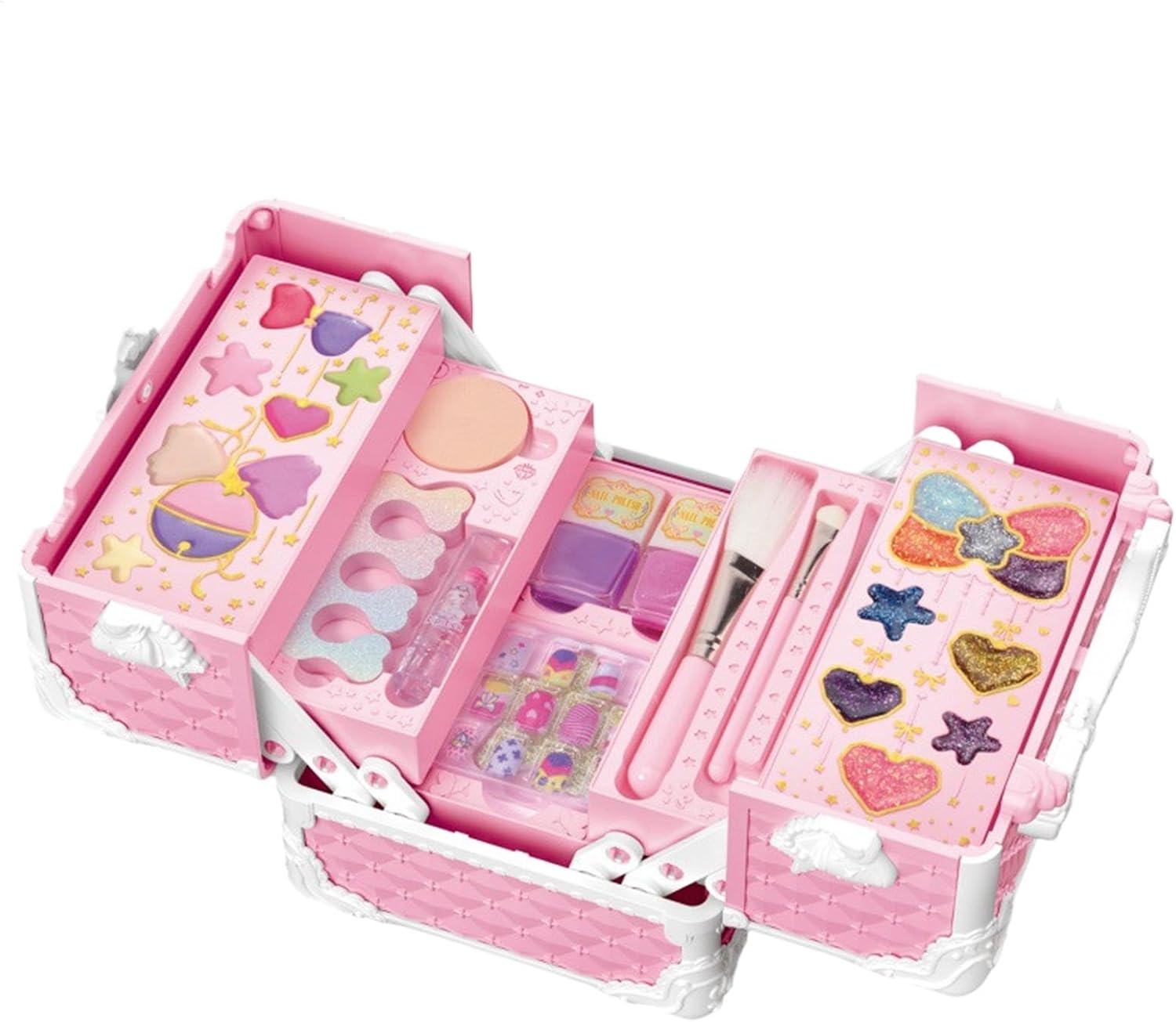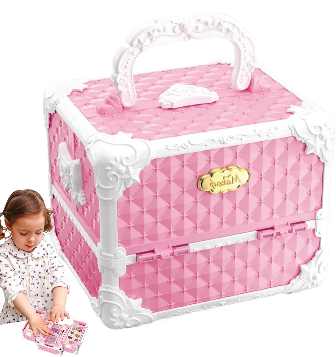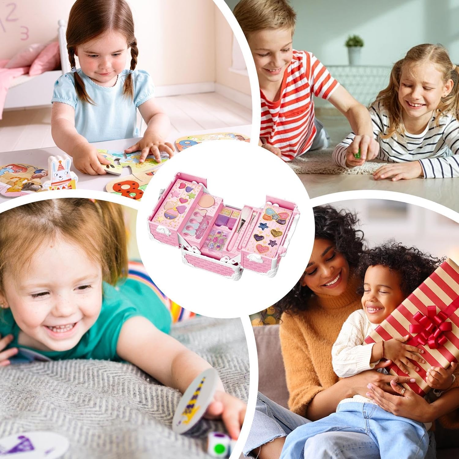 Set di cosmetici per bambini: abbellisci la tua bambina con un ricco assortimento di cosmetici per soddisfare le sue varie esigenze decorative, tra cui smalto, lucidalabbra, ombretto, fard, rossetto e pennelli per il trucco. Aumenta la fiducia: il nostro set di trucchi per ragazze incoraggia l'espressione di sé unica e consente ai bambini di sperimentare più opzioni di bellezza per incoraggiare l'immaginazione e la creatività. Giocare con il trucco migliora le capacità motorie, aumenta la fiducia in se stessi e offre ai bambini l'opportunità di esprimersi. Garanzia di sicurezza: il nostro set di trucchi per ragazze è realizzato con materiali sicuri e promette un divertimento sicuro e gioioso. Tutti i cosmetici si sciacquano facilmente con acqua, quindi la salute e la sicurezza del tuo bambino sono la cosa più importante in ogni sessione di gioco. Comodità portatile: questa custodia dal design accattivante con maniglia non solo semplifica l'organizzazione del trucco, ma fornisce anche una funzione antipolvere che garantisce ordine ed efficienza dello spazio, consentendo ai bambini di utilizzare o trasportare il trucco comodamente in qualsiasi momento. Regalo adorabile: con questo set di trucco per bambini, le ragazze possono mostrare la loro individualità e il loro fascino. Ottimo per compleanni, vacanze e altre occasioni speciali, è un regalo fantastico che li aiuterà a esprimere la loro personalità unica e a creare ricordi indimenticabili