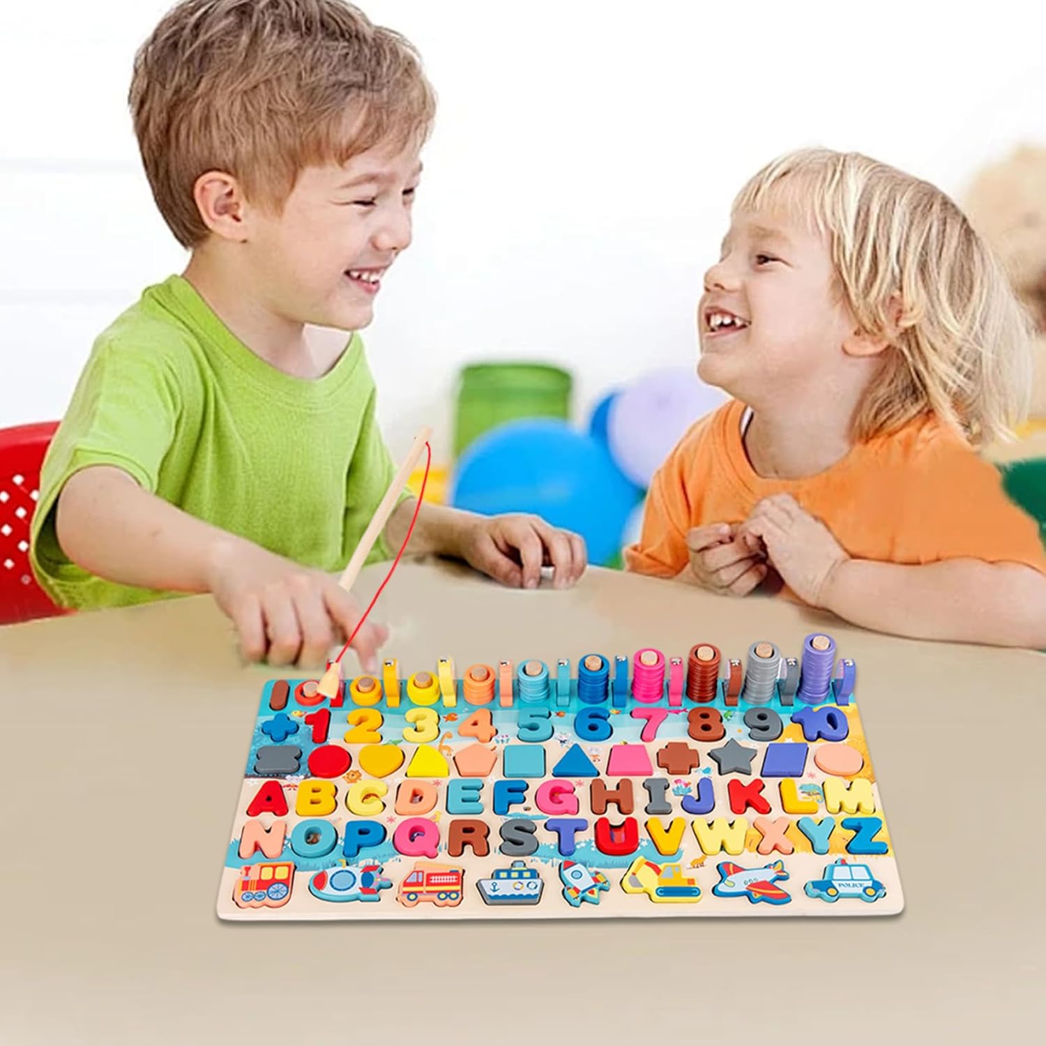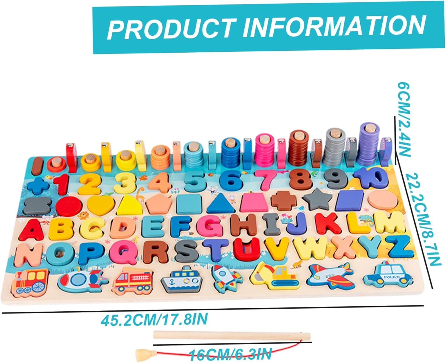 Divertimento educativo: coinvolgere i bambini con un puzzle di alfabeto in legno che combina lettere di apprendimento, numeri e forme, migliorando le abilità cognitive attraverso il gioco. Giocattolo di apprendimento versatile: ideale per bambini in età prescolare e bambini, questo puzzle supporta l'alfabetizzazione e la numerazione precoce offrendo attività di abbinamento alfabetico e di riconoscimento della forma. Materiali sicuri: realizzato in legno non tossico, questo puzzle è robusto e sicuro per ragazzi e ragazze, garantendo l'uso di lunga durata e la tranquillità per i genitori. Magnetico e interattivo: i pezzi magnetici si attaccano saldamente alla tavola, rendendo facile e divertente per i bambini piccoli abbinare e identificare forme e lettere diverse senza problemi. Sviluppo di abilità motorie fine: la canna da pesca incluse incoraggia la coordinazione e la destrezza degli occhi manuali mentre i bambini raccolgono pezzi di puzzle magnetici, perfetti per le mani piccole.