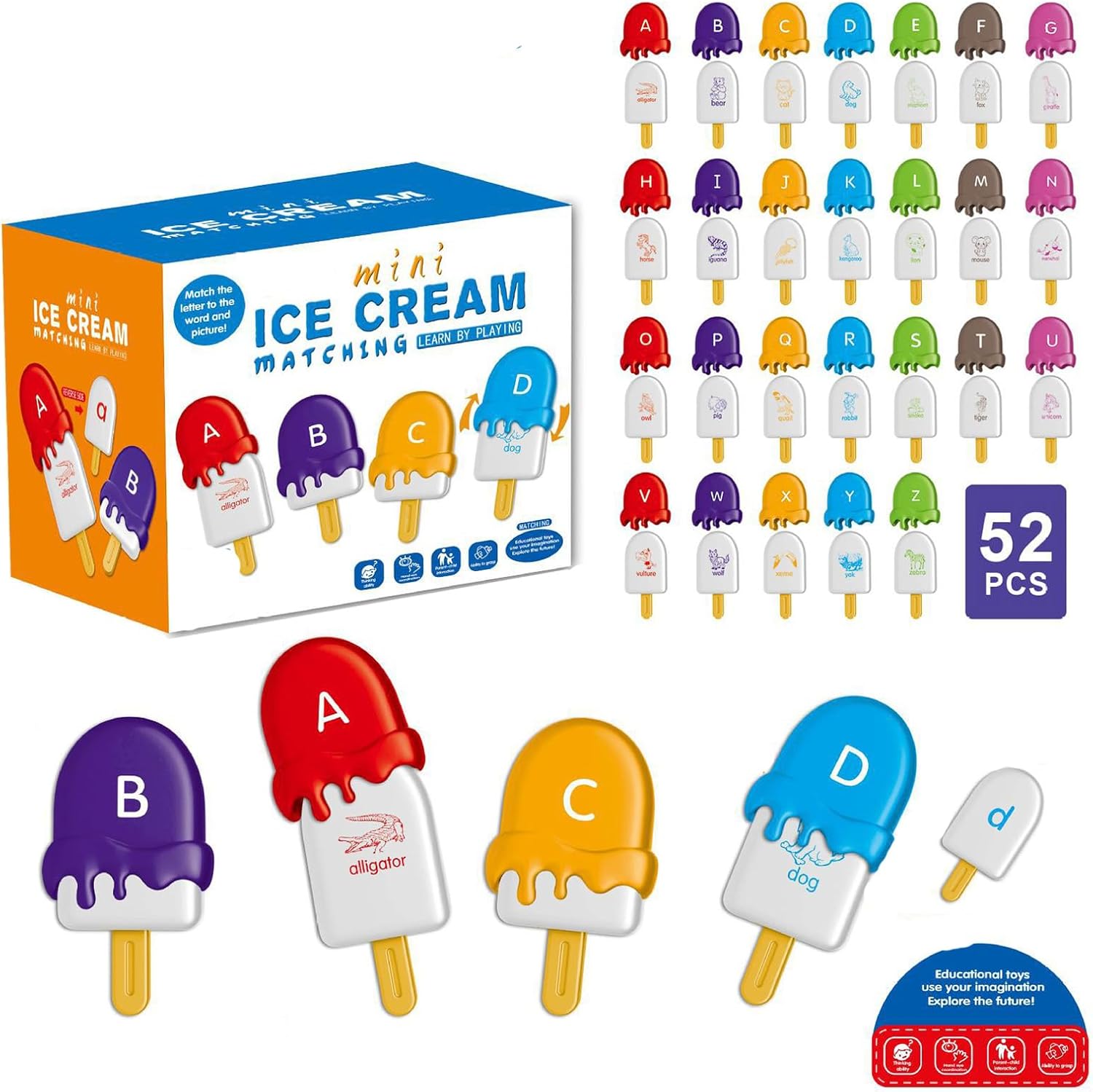 Ideale per appuntamenti di gioco interattivi, sviluppo di abilità o attività di gruppo Sviluppare in classe le abilità di ordinamento dei colori rafforzando le sequenze di lettere e numeri Contiene pezzi di plastica da 26 pezzi con palline di gelato e coni rimovibili, ciascuno etichettato con lettere maiuscole e numeri corrispondenti per esplorazioni educative multisensoriali Giochi di apprendimento delle lettere, riconoscimento dei colori, esercizi di conteggio e lettere combinati con attività giocose di ordinamento con il gelato Supporta lo sviluppo cognitivo unendo giochi di ordinamento con riconoscimento di modelli visivi e incoraggia i bambini a imparare le associazioni dei numeri delle lettere attraverso esercizi di abbinamento ripetuti. Perfetto per i bambini in età prescolare di 3 anni e per i bambini della scuola materna, promuove l'alfabetizzazione precoce e le abilità matematiche dei più piccoli attraverso metodi intelligenti e pratici