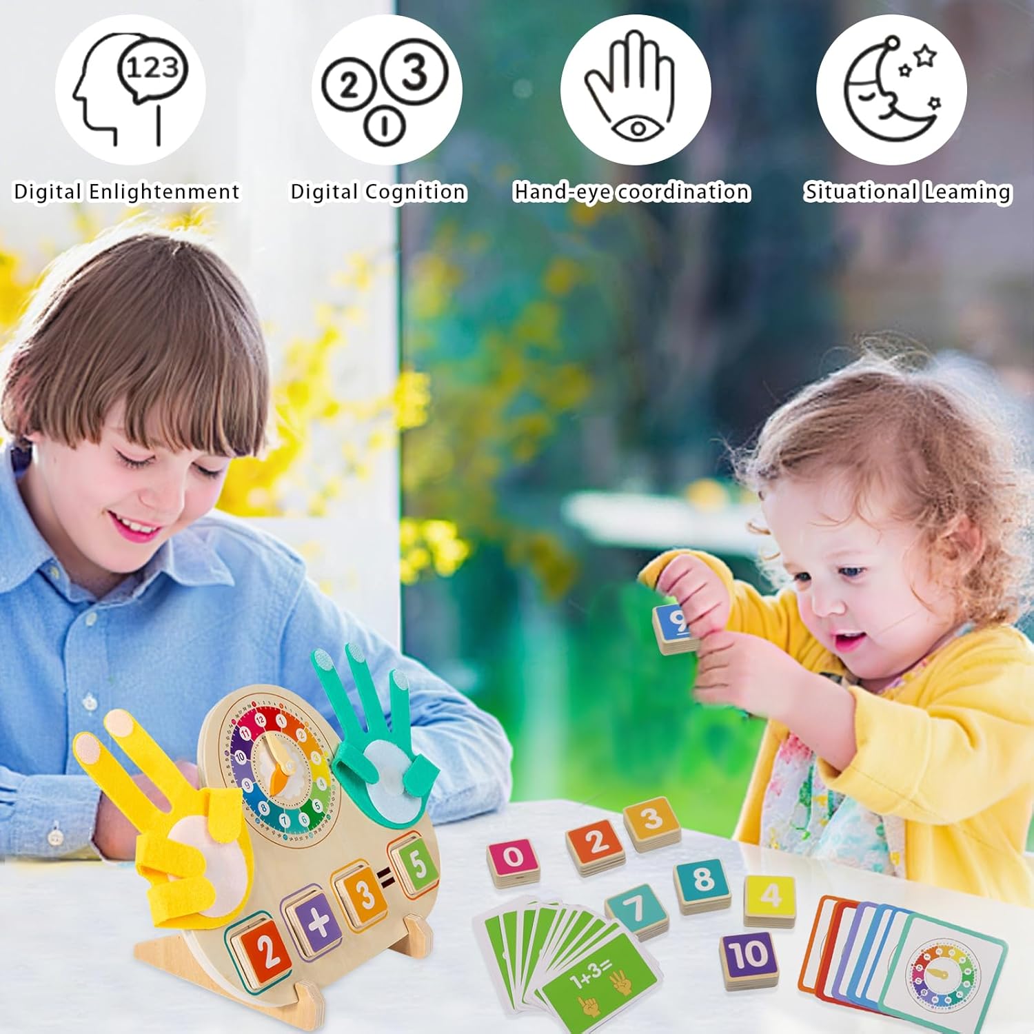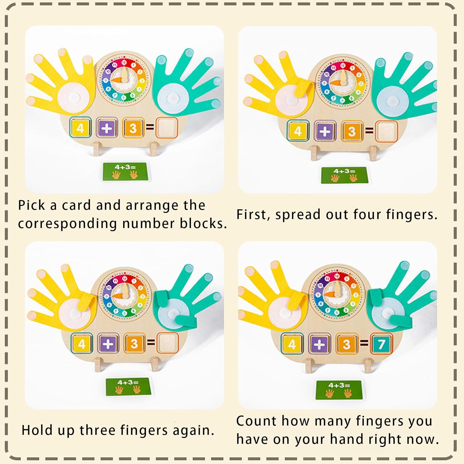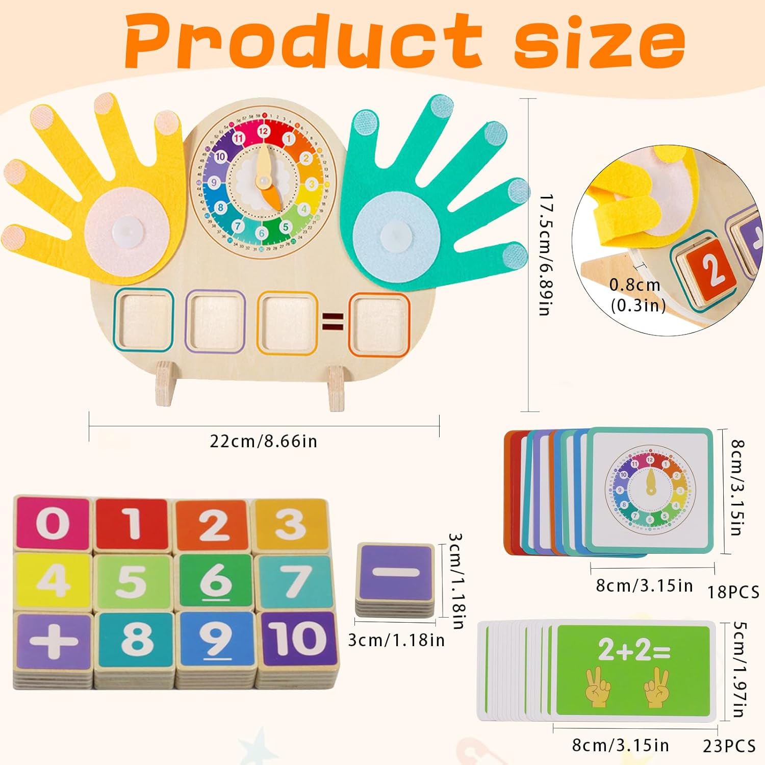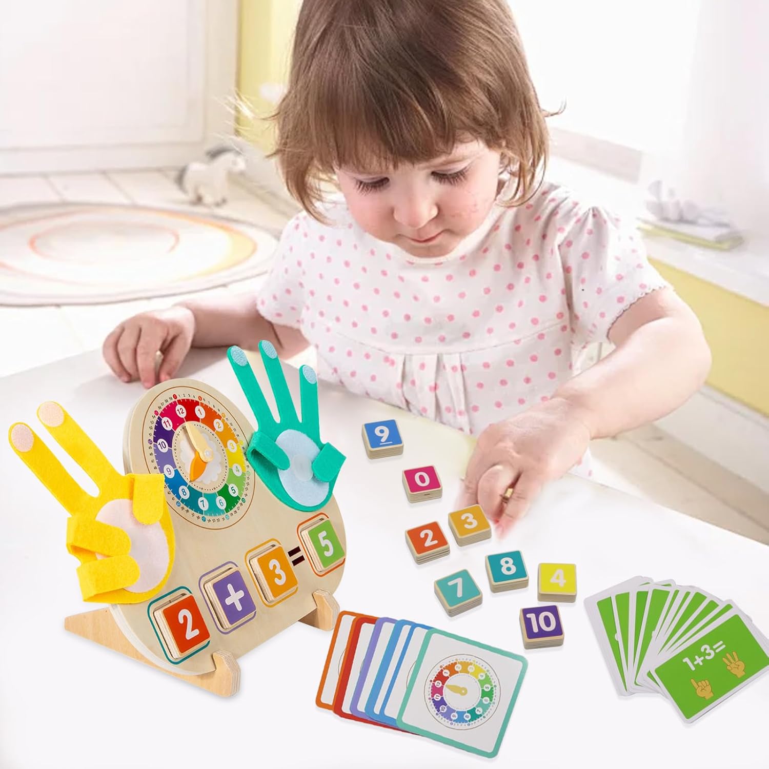 Giocattoli Montessori a partire dai 3 anni: i nostri giocattoli contatori matematici sono composti da 11 blocchi di numeri in legno colorato, 2 blocchi di simboli in legno, 23 carte di apprendimento double face, 2 palmi morbidi in feltro, 1 robusta tavola in legno e supporto. Perfetto per bambini piccoli e bambini in età prescolare per sviluppare abilità matematiche di base in modo giocoso Materiale di alta qualità: questo gioco educativo di matematica è realizzato in legno naturale di alta qualità, accuratamente levigato per garantire che la tavola di legno sia robusta e durevole, non si danneggia e non si rompe facilmente e resiste all'uso quotidiano. Sicuro per le mani dei bambini piccoli. Con una pratica dimensione di 22 cm, la rana si adatta a qualsiasi zaino per la scuola ed è sicura e antiscivolo anche per le mani dei bambini Giocattolo contatore di matematica in legno: è il giocattolo perfetto per ragazze e ragazzi di età compresa tra 3, 4, 5, 6, 7 o 8 anni, sia in kita che per scolari, colori e forme vivaci stimolano ulteriormente i sensi e rendono l'apprendimento un'esperienza multisensoriale Sviluppa le capacità motorie fini: la tavoletta numerica digitale consente ai bambini di risolvere compiti matematici, riconoscere i numeri e contare con i contatori a forma di mano. Piegare e diffondere le dita in feltro sulla tavola richiede una manipolazione precisa, che sfida la coordinazione occhio-mano e la flessibilità del braccio del bambino. Il conteggio promuove le capacità motorie, la coordinazione occhio-mano, il pensiero logico e la memoria Regalo per bambini: il nostro giocattolo educativo Montessori interattivo è il regalo ideale per compleanni, Natale o occasioni speciali. Che si tratti di lezioni scolastiche, homeschooling o come regalo di compleanno o di Natale, può suscitare l'entusiasmo dei bambini per la matematica