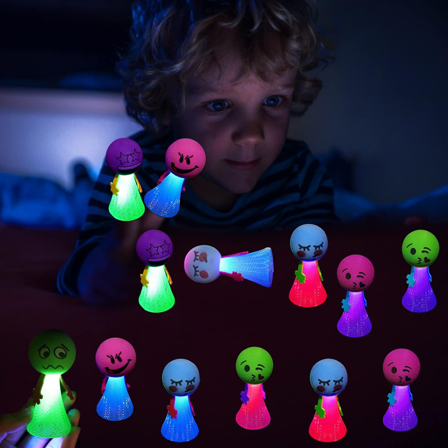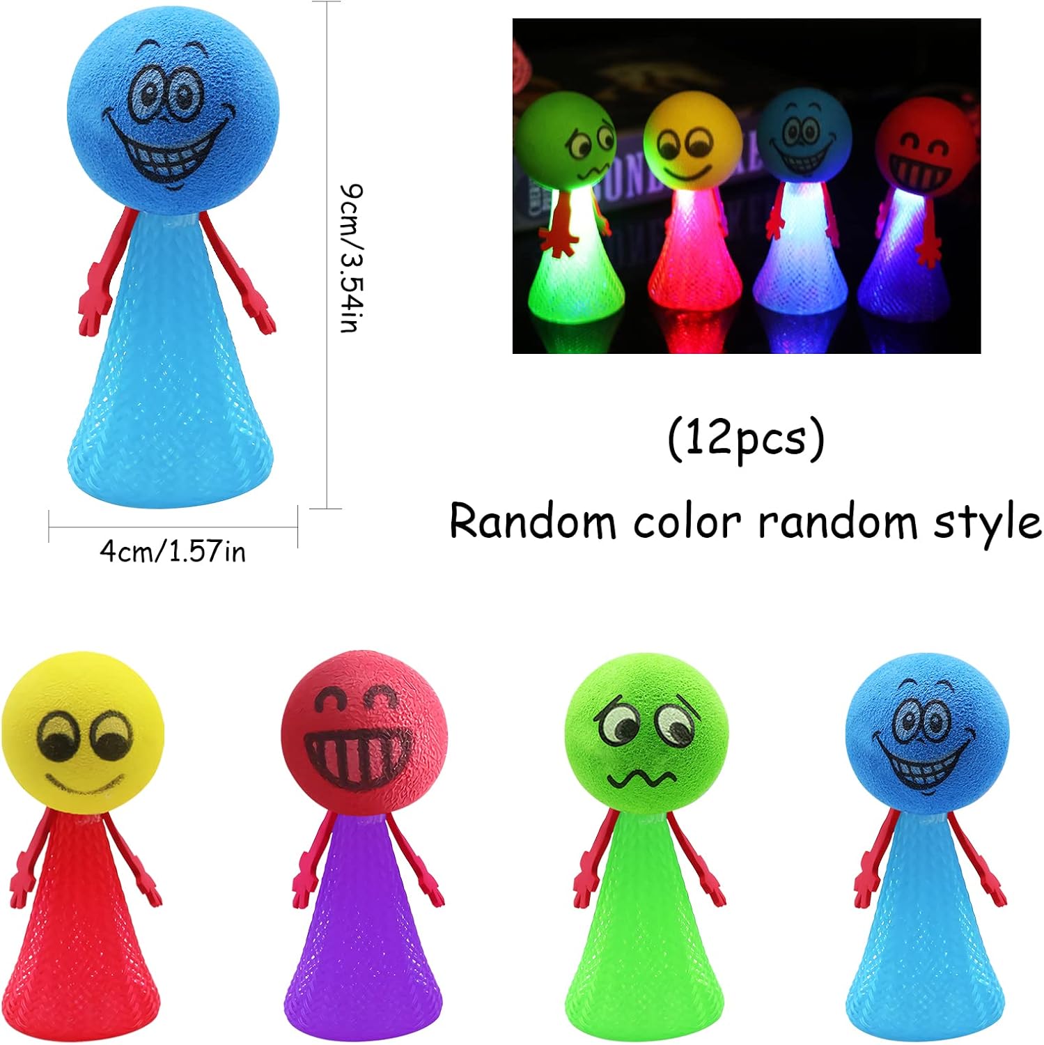 Jumping Balls Palla rimbalzante che si illumina al buio: 12 pezzi di giocattoli rimbalzanti che si illuminano al buio, questi articoli per feste che si illuminano al buio sono perfetti per le feste di compleanno dei bambini. Buona qualità: realizzato con materiali di alta qualità, sicuri e durevoli. Il tuo bambino può usarlo in tutta sicurezza, offrendo infinite ore di intrattenimento pratico. Viso carino: hanno molti colori vivaci diversi ed espressioni super carine, che possono attirare rapidamente molta attenzione dei bambini. I giocattoli gonfiabili sono la scelta perfetta! Facile da usare: devi premerlo con il dito, rilasciarlo finché non salta su e ti sorprende, salta e brilla e crea motivi che creano un enorme bagliore nell'oscurità. Ampiamente usato: ideale da regalare come premi per feste, premi scolastici, riempitivi per calze di Natale o riempitivi per borse da festa durante feste di compleanno o feste a tema.