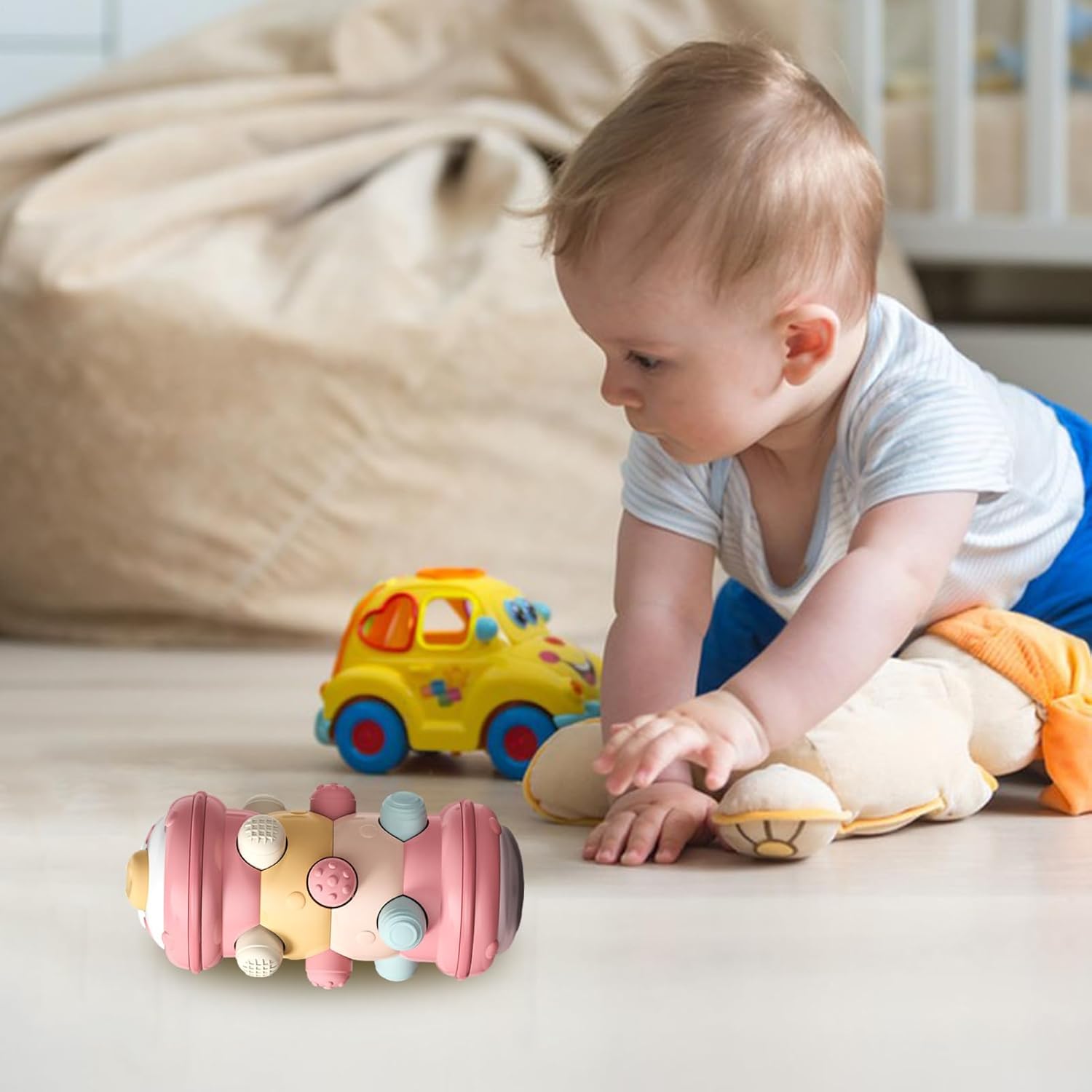 Sviluppo sensoriale: migliora lo sviluppo sensoriale e la coordinazione di tuo figlio con il nostro giocattolo a rulli striscianti. Il suo esclusivo design a trama tridimensionale offre una gamma di esperienze tattili che le mani dei più piccoli possono esplorare e apprezzare. Attira l'attenzione: sviluppa capacità motorie e coordinazione: coinvolgere il tuo bambino con questo allettante giocattolo rotante può portarlo a imparare a gattonare in modo naturale. I suoni d'impatto prodotti mentre rotola portano eccitazione e divertimento. Con il design a rulli, aiuta i bambini a sviluppare muscolare e coordinazione. Incoraggia l'interazione: questo giocattolo a rulli striscianti utilizza il principio di simmetria per stimolare la curiosità e consentire ai bambini di realizzare l'effetto interattivo del giocattolo premendo su e giù. Sensibilità al suono: non solo questo giocattolo può attirare l'attenzione dei bambini, ma promuove anche la stimolazione uditiva con il suo suono chiaro e nitido quando viene scosso. I piccoli sul fondo aggiungono ulteriore piacere. Un compagno di giochi per potenziare le capacità sensoriali e la sensibilità al suono. Design sicuro a misura di bambino: questo giocattolo a rulli striscianti è finemente lucidato per garantire che ogni bordo sia privo di sbavature, consentendo ai bambini di giocare in sicurezza senza preoccuparsi di possibili disagi.