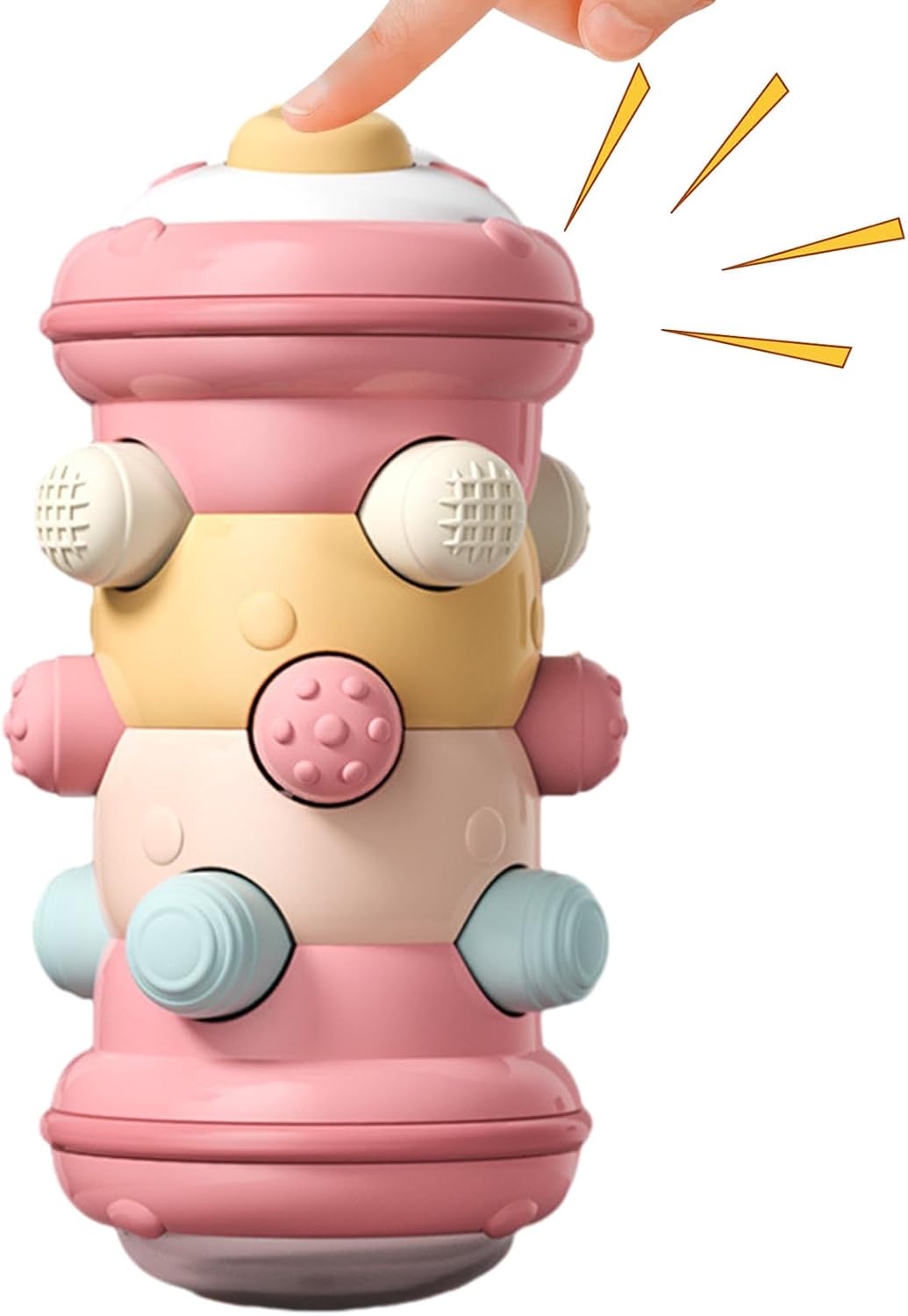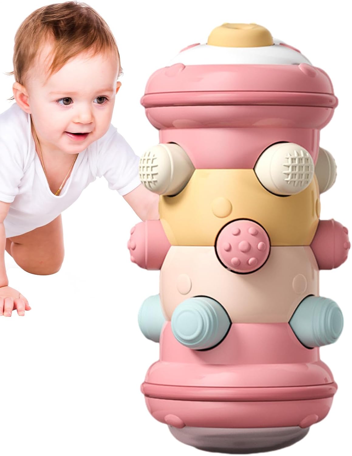 Stimolazione sensoriale: testimonia il miglioramento sensoriale di tuo figlio con il nostro giocattolo a rulli striscianti che stimola la sua esperienza sensoriale. La varietà di texture tridimensionali consente alle loro piccole mani di percepire un senso tattile diverso, migliorando al stesso la coordinazione sensoriale e lo sluppo delle abilità. Giocattolo che attira l'attenzione: incoraggia il gattonamento: questo gioco divertente può influenzare positivamente i momenti dei bambini, stimolando il loro desiderio di gattonare ed esplorare. Crea un suono d'impatto mentre rotola per suscitare eccitazione. Il design dei rulli non solo aiuta i bambini a imparare a gattonare, ma anche a esercitare la muscolare e a migliorare l'equilibrio. Divertimento interattivo: il nostro giocattolo a rulli striscianti racchiude il principio della simmetria creando un gioco aperto per stimolare la curiosità. Il giocattolo consente ai bambini di realizzare l'effetto interattivo premendo su e giù, promuovendo il gioco fantasioso e la creatità mentre affinano il loro sluppo cognitivo. Sluppo della stimolazione uditiva: non solo questo giocattolo può attirare l'attenzione dei bambini con il suo design colorato, ma emette anche un suono chiaro e nitido quando ene agitato, grazie ai piccoli sul fondo, che aiutano lo sluppo uditivo dei bambini. Sicuro da giocare: questo giocattolo a rulli striscianti è dotato di bordi finemente lucidati, garantendo che non siano sbavature che potrebbero causare disagio al tuo bambino.