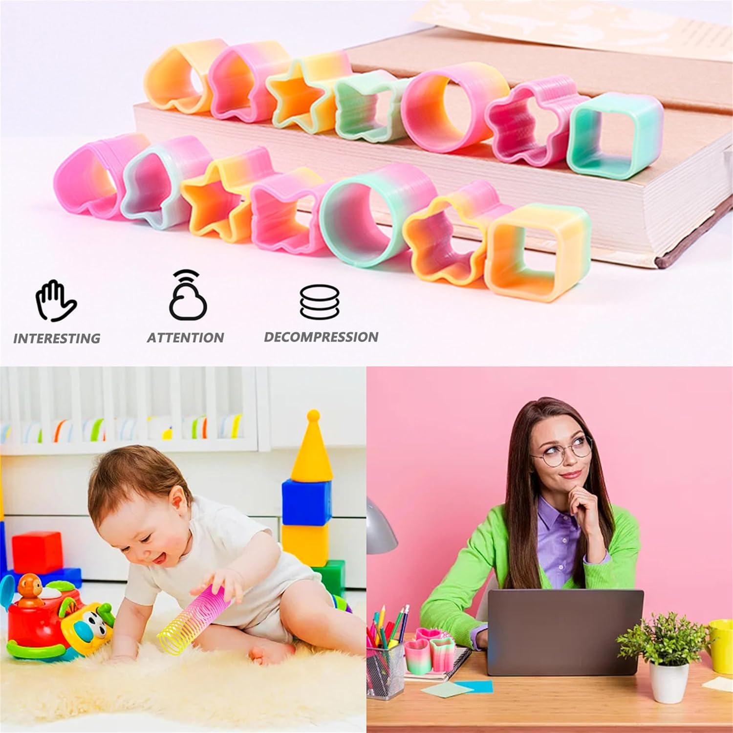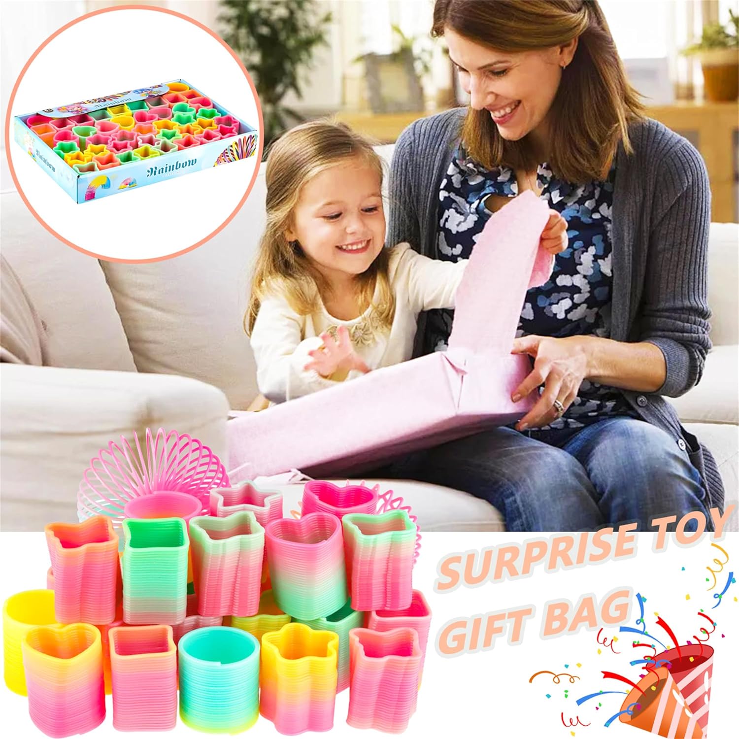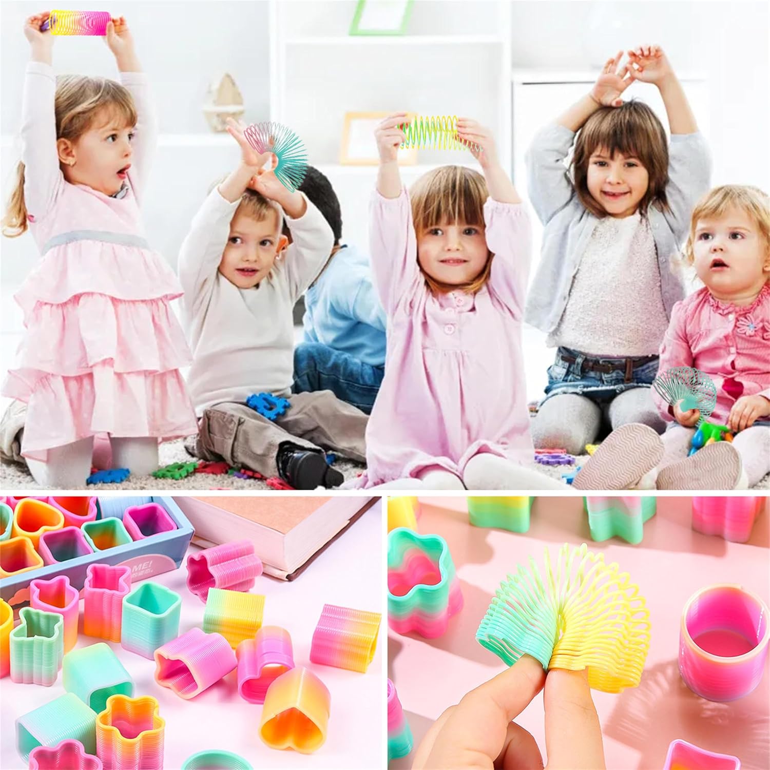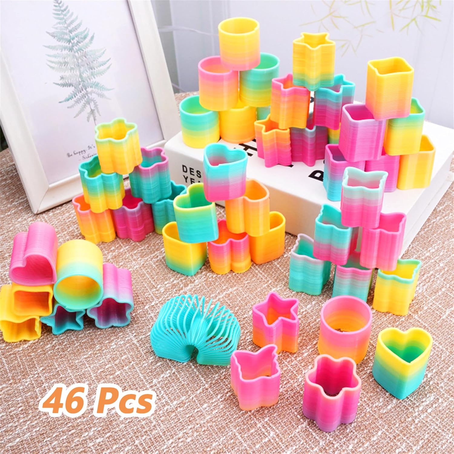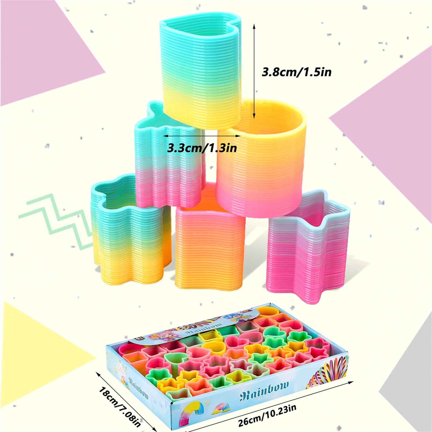 Confezione super conveniente: il set regalo di compleanno per bambini contiene 48 set a spirale arcobaleno colorati con colori vivaci e diversi stili, che aggiungono molto divertimento alla festa di compleanno del bambino. Le tonalità chiare rendono la spirale arcobaleno per bambini perfetta per decorazioni per feste o come regalo per bambini. Buon compagno per i bambini: la spirale arcobaleno è un nuovo tipo di giocattolo educativo estensibile, ogni giocattolo arcobaleno ha una buona elasticità e non si deforma facilmente dopo lo stretching. si può progettare questo arcobaleno salto, braccialetti, o collegare molte spirali con gli altri. Durevole e sicuro: queste spirali arcobaleno sono realizzate in plastica di alta qualità e durevoli, difficili da rompere e deformare. È divertente espandere questa spirale colorata magica arcobaleno e guardarla subito indietro. Sbarazzati dello stress, tutti saranno divertenti. Giocattolo multistile: questa spirale arcobaleno per bambini ha diverse forme, come ad esempio rotonda, cinque stelle, amore, fiore, farfalla e quadrata. È divertente ampliare questo set colorato Rainbow Spring, sviluppa l'immaginazione, la percezione dei colori e le capacità motorie dei bambini, allena la flessibilità e la coordinazione del corpo. Regalo perfetto: questo divertente giocattolo a spirale arcobaleno è adatto come regalo, i bambini lo trovano molto divertente. Spirale arcobaleno ideale per feste e calze di Natale, regalini, tombola, uova di Pasqua, premio per insegnanti, ecc.