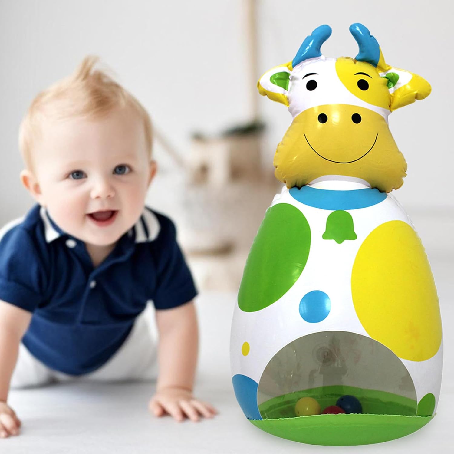 Design Adorabile a : Accende la curiosità con texture morbida sicura e design bovino, arricchito da movimento oscillante buffo per un'appealing gioco sensoriale interattivo che diverte i bambini stimolando naturalmente i sensi (: 198 : Sviluppo Coordinazione: Meccanismo sonoro interno crea allegri tintinnii scuotimento, incentiva il gioco fisico potenziando le capacità occhio-mano con attivazione intuitiva : 219) Struttura : Combina robustezza e flessibilità, questo giocattolo gonfiabile garantisce supporto duraturo e mantiene la forma anche con uso regolare, restando morbido per una presa sicura da mani piccole. Regalo Premuroso:Diffonde gioia e divertimento ai compleanni, scelta eccellente come regalo per ogni festa con design vivace e fascino giocoso, per momenti speciali dei bambini. Portabilità Pratica: Grazie al meccanismo di sgonfiaggio rapido, questo giocattolo si ripiega in dimensioni compatte che entrano facilmente in qualsiasi borsa, semplificando il trasporto e ottimizzando lo spazio di archiviazione con design