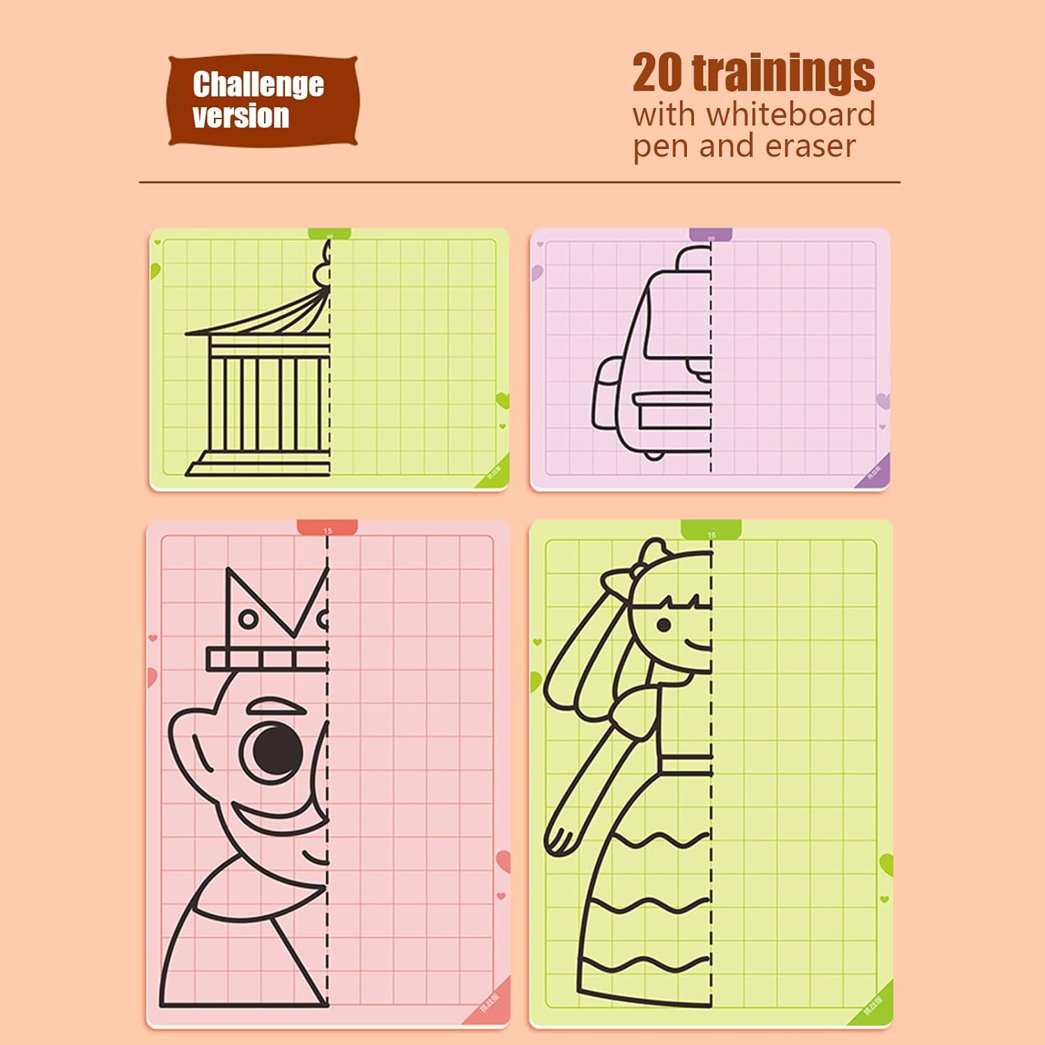 Sviluppo Abilità: Coinvolge i bambini in attività creative per liberare la fantasia, offre sostegno nei compiti scolastici e aiuta a gestire lo stress con esercizi adatti alle giovani menti. Design Simmetrico Cancellabile: Esperienza creativa per esprimersi e rilassarsi, favorisce legami intergenerazionali grazie alle funzioni cancellabili che garantiscono risultati estetici simmetrici impeccabili. Sviluppo Percezione Spaziale: Integra disegni simmetrici con griglie per sviluppare la consapevolezza spaziale nei bambini, sostenendo la coordinazione occhio-mano attraverso attività artistiche divertenti e istruttive. Sviluppo Abilità Creative: Design con cartoncino robusto e membrana speciale riduce traspirazione inchiostro, supportando precisione del tratto e migliorando la coordinazione motoria. Sviluppo Cognitivo: Potenzia estetica artistica e ragionamento logico tramite esercizi di disegno simmetrico, promuove il pensiero tridimensionale e la crescita di abilità multidimensionali con progressione graduale per giovani apprendisti.