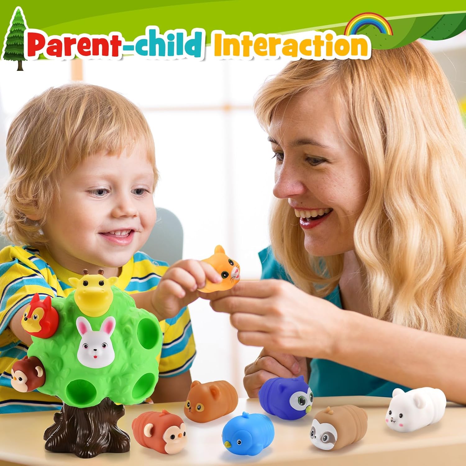 Giocattoli per abilità motorie fini: il nostro giocattolo sensoriale per bambini è composto da un corpo giocattolo a forma di albero e 10 animali della foresta super comprimibili (volpe, giraffa, uccello, gufo, tigre, coniglio, scimmia, allocco, procione, orso bianco) in 10 colori. Gli animali di peluche colorati sono ottimi per l'acuità visiva del bambino. La cima liscia dell'albero con sporgenze di diverse dimensioni ha lo scopo di aiutare i bambini a scoprire i loro sensi. Combina educazione e divertimento: i nostri giocattoli Montessori per 2 anni sono progettati per migliorare il riconoscimento dei colori e degli animali dei bambini, sviluppare il pensiero spaziale e le capacità di risoluzione dei problemi e aiutarli a esplorare il mondo. Questo giocattolo sensoriale è lo strumento perfetto per consentire ai genitori di trascorrere il tempo libero con i propri figli. I più piccoli possono giocare sul pavimento o sul tavolo del soggiorno sempre e ovunque. Sviluppa capacità motorie complesse: prendi semplicemente gli amici della foresta super comprimibili e attaccali dentro e fuori dall'albero. Un coniglio, una volpe e altri simpatici animali si muovono sulla cima dell'albero, aiutando il tuo bambino a sviluppare la coordinazione occhio-mano, la forza della mano e le capacità motorie. Materiale sicuro e durevole: ogni giocattolo per piccoli animali è alto circa 2 pollici, è realizzato con materiali sicuri e non tossici e ha una superficie liscia che è della dimensione perfetta per bambini piccoli e bambini in età prescolare con mani grandi come un palmo per proteggere il tuo bambino dai rischi di soffocamento. Regalo perfetto per il primo compleanno: graziose forme di animali e divertenti design multi-gioco intrattengono i bambini per ore. Regali ideali per compleanni, Natale, come giocattolo da bagno, come piccola sorpresa per San Nicola o come regalo di Pasqua per bambini e bambine dai 2 ai 3 anni. I bambini saranno molto felici di ricevere un regalo educativo così grande!