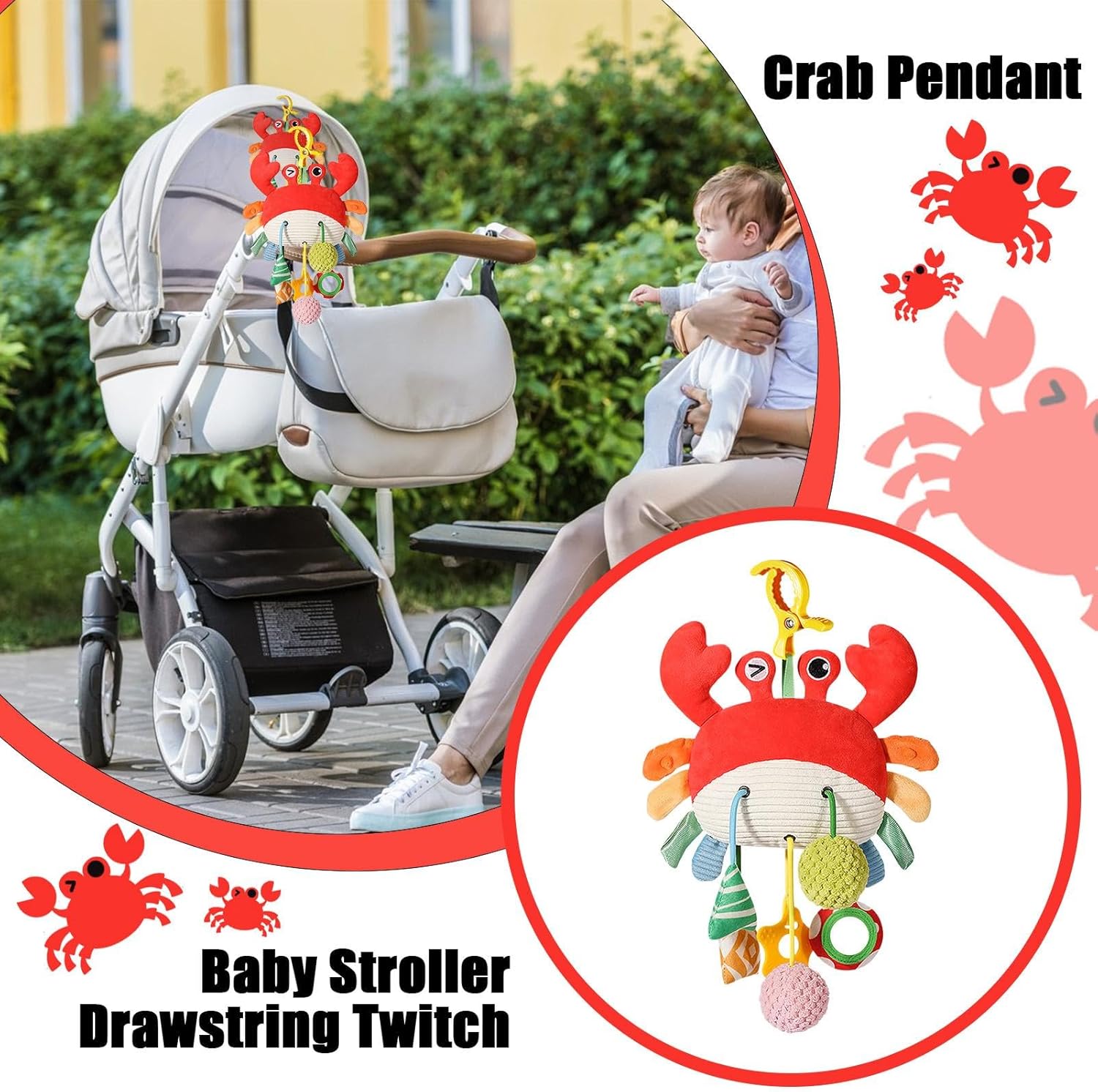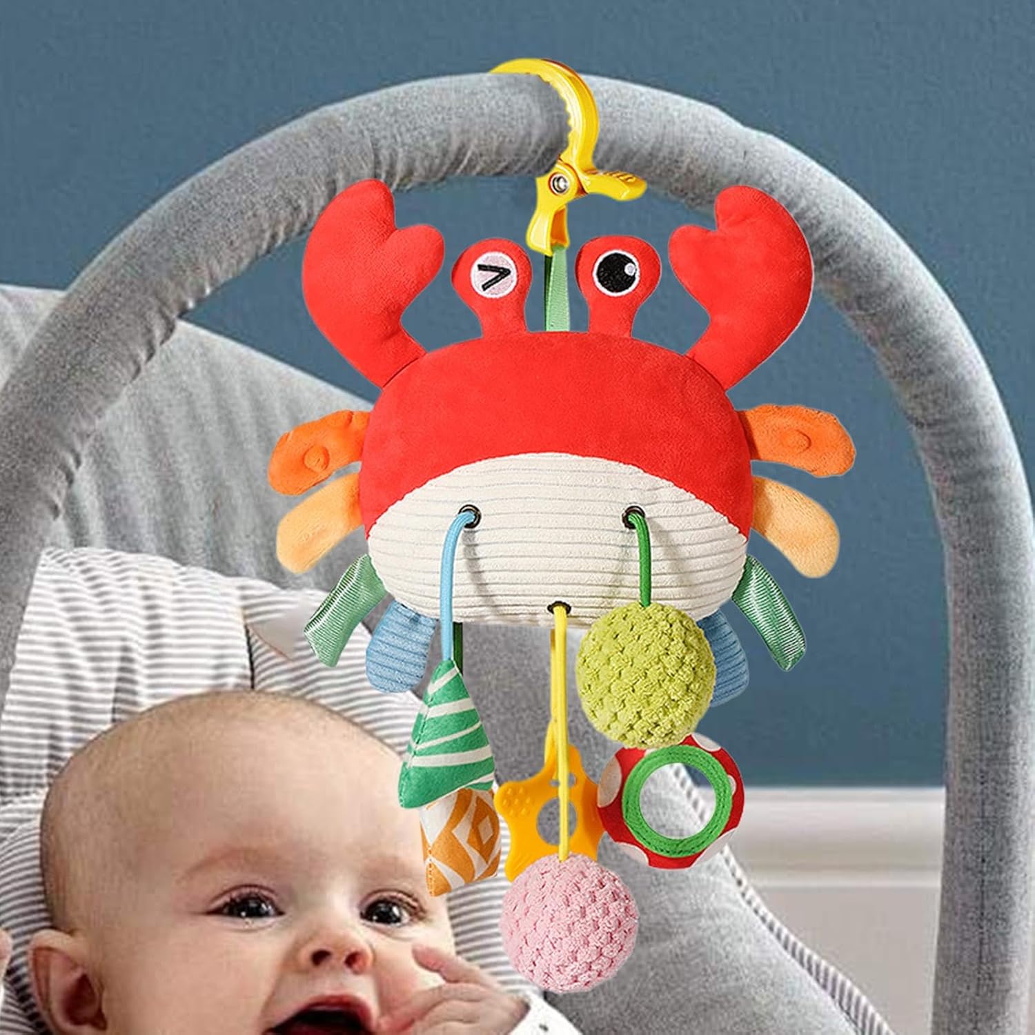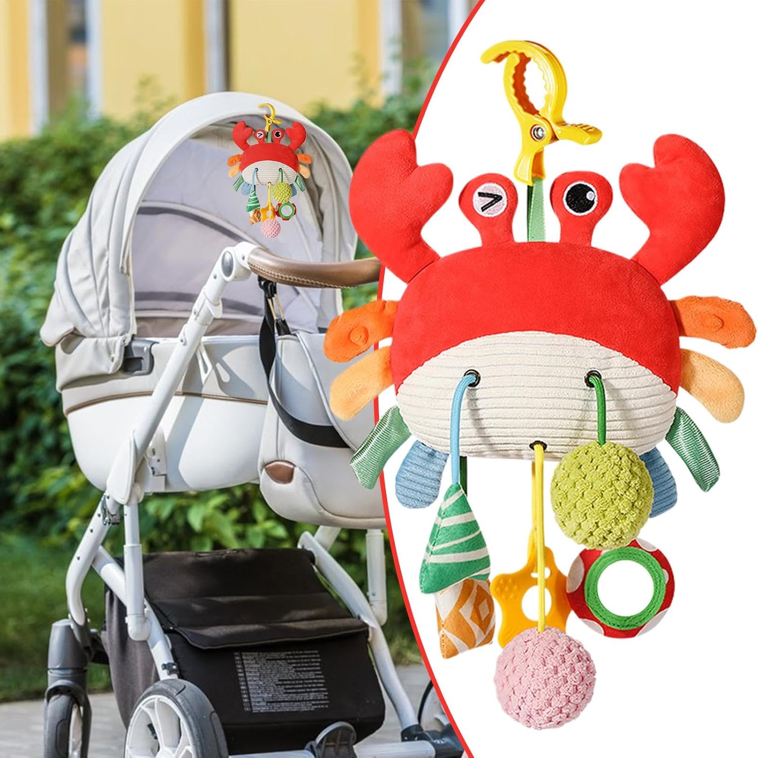 Sicurezza per i bambini: intrattenere il tuo bambino con il giocattolo sonaglio appeso dipinto a mano, che presenta un design a bordo che non taglia ed è realizzato con materiali e sicuri, consentendo al tuo bambino di toccare e giocare senza alcun danno. La sua vivace immagine di granchio avvolgerà e delizierà il tuo bambino Giocattoli pittoreschi per bambini: i motivi colorati sul guscio del granchio rendono questo giocattolo sonaglio sospeso una delizia visiva accattivante per i bambini. Guarda come il tuo bambino è paralizzato dal design divertente, perfetto per stimolare i tuoi sensi e intrattenerli. Giocattoli diversi: i giocattoli sonagli appesi per lettino presentano un design speciale che collega il corpo del piccolo granchio ai pompon sottostanti, promuovendo efficacemente lo sviluppo uditivo, mentre esercita la coordinazione mano con il suo speciale design a cordino. Immagina qualsiasi cosa: quando il tuo bambino si sveglia, il giocattolo sonaglio da appendere nella culla con una simpatica immagine di granchio è il compagno perfetto per esplorare il mondo. Stimola la tua curiosità, calma le tue emozioni e aiuta a ridurre il pianto. Inoltre, aiuta il tuo bambino a addormentarsi più velocemente. Ampia gamma di applicazioni: con i giocattoli sonagli sospesi per culla, puoi migliorare l'ambiente dei tuoi bambini. Puoi facilmente installarli come appendi per il passeggino, appenderli sopra la culla come un simpatico campanellino o semplicemente metterli dove vuoi nel soggiorno del tuo bambino.