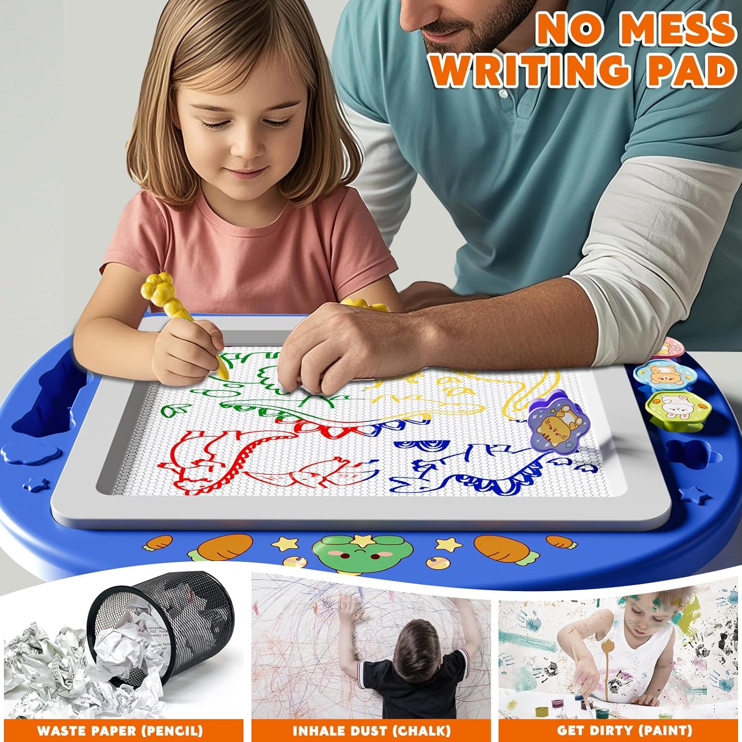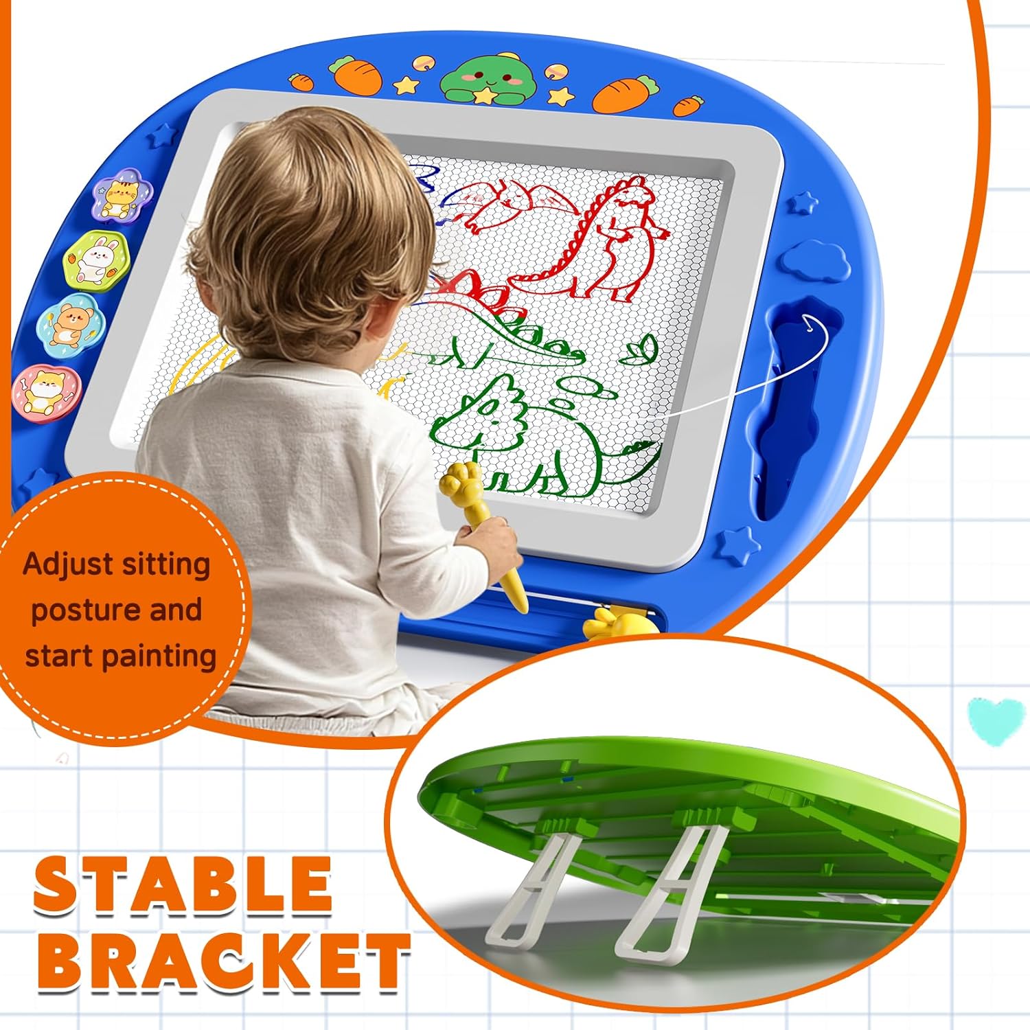 Vivace tavolo da disegno a 4 colori: questa lavagna magnetica gialla sostituisce matite e carta caotiche con 4 colori cancellabili luminosi. I bambini di età compresa tra 2 e 7 anni possono disegnare, scrivere o utilizzare i francobolli inclusi per il gioco creativo in qualsiasi momento, ideale per la casa, i viaggi e l'arte senza pulizia. Early Educational Development Tool: progettato come un emozionante giocattolo educativo per bambini di età compresa tra 2 e 5 anni, costruisce immaginazione artistica, concentrazione e abilità motorie. La tavola riutilizzabile incoraggia la pratica ripetuta di lettere, numeri e forme attraverso l'apprendimento basato sul gioco. Costruzione a prova di bambino e durevole: realizzata in plastica ABS atossica e inchiostro magnetico senza BPA, il nostro tavolo da disegno è realizzato con bordi arrotondati e soddisfa rigorosi standard di sicurezza CPC. Un design sicuro previene i rischi di soffocamento per i bambini piccoli. Cancellazione senza sforzo e divertimento portatile: scivola con il cancellabile per riavvii puliti istantanei. La struttura leggera con manico lo rende un giocattolo da viaggio perfetto per auto, aerei o ristoranti – per far occupare i bambini ovunque senza disordine. Regalo perfetto per giovani artisti: un regalo di compleanno o di Natale premuroso per ragazze e ragazzi di età compresa tra 2 e 7 anni. Questo giocattolo educativo risveglia la creatività riducendo il tempo sullo schermo, rendendolo un regalo approvato dai genitori per bambini piccoli e prescolari.