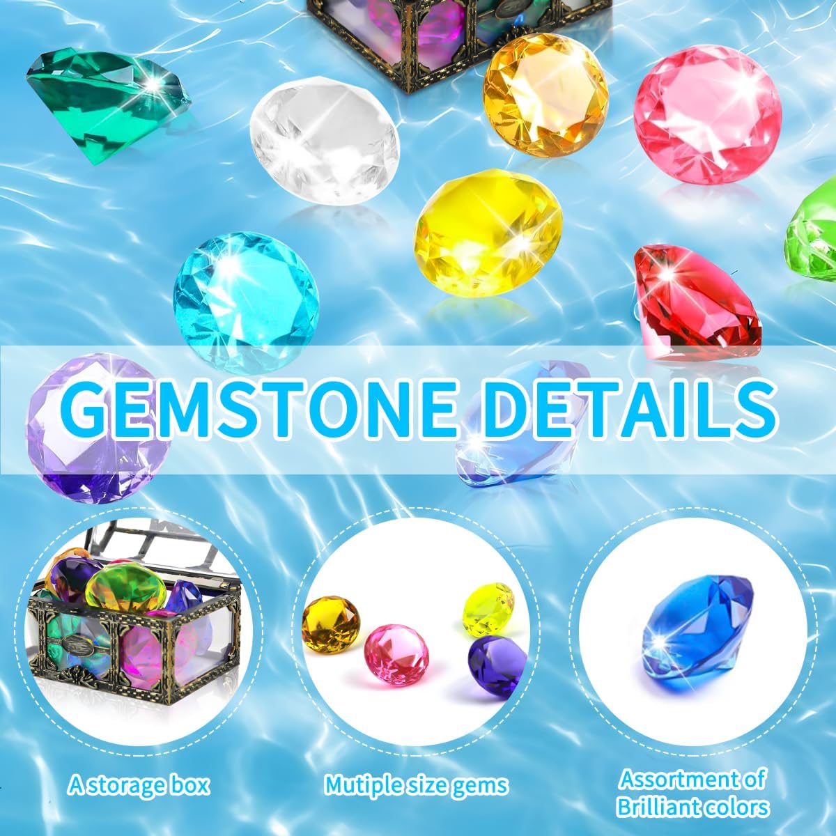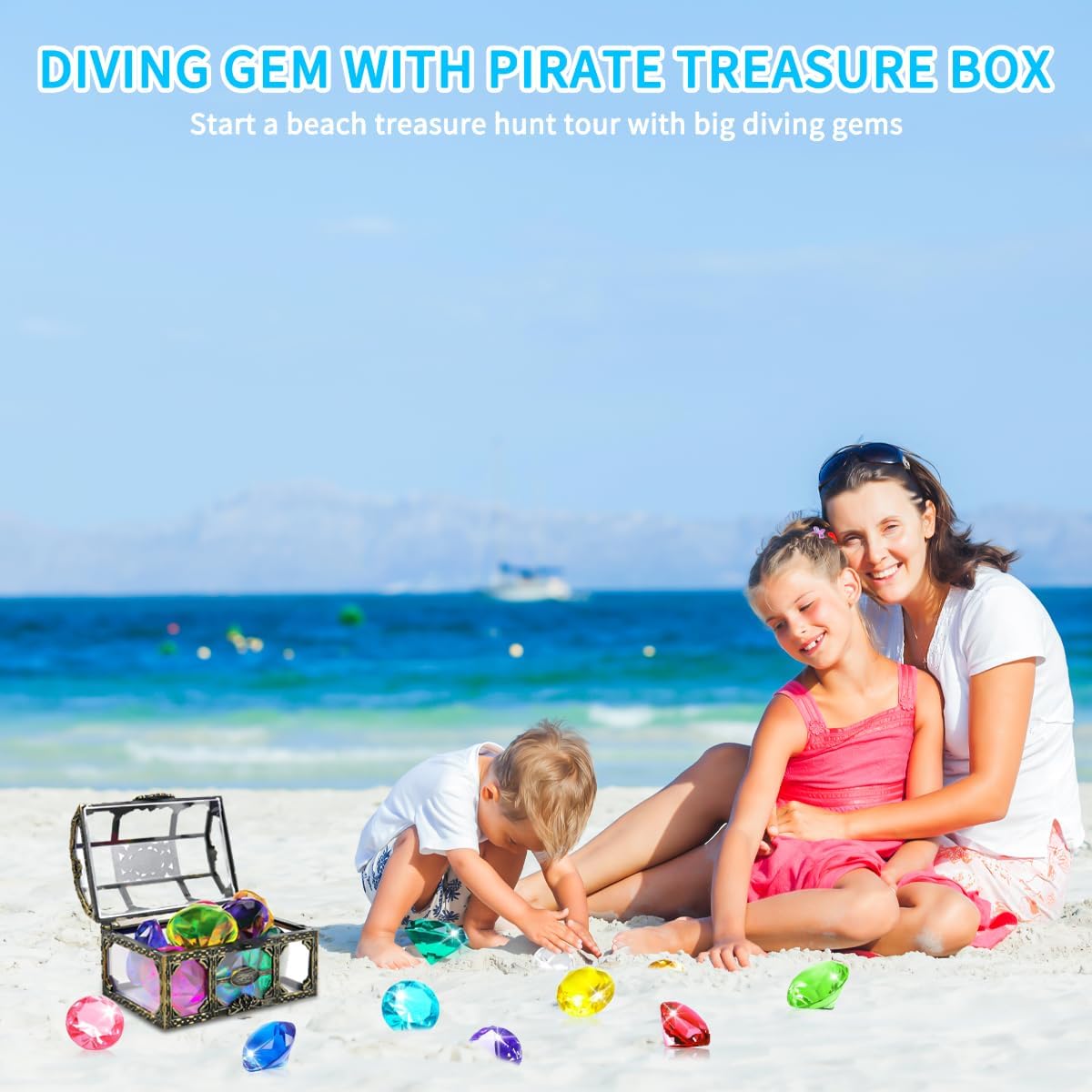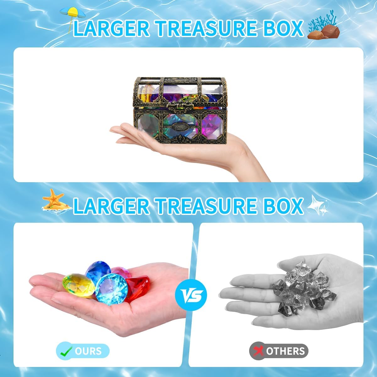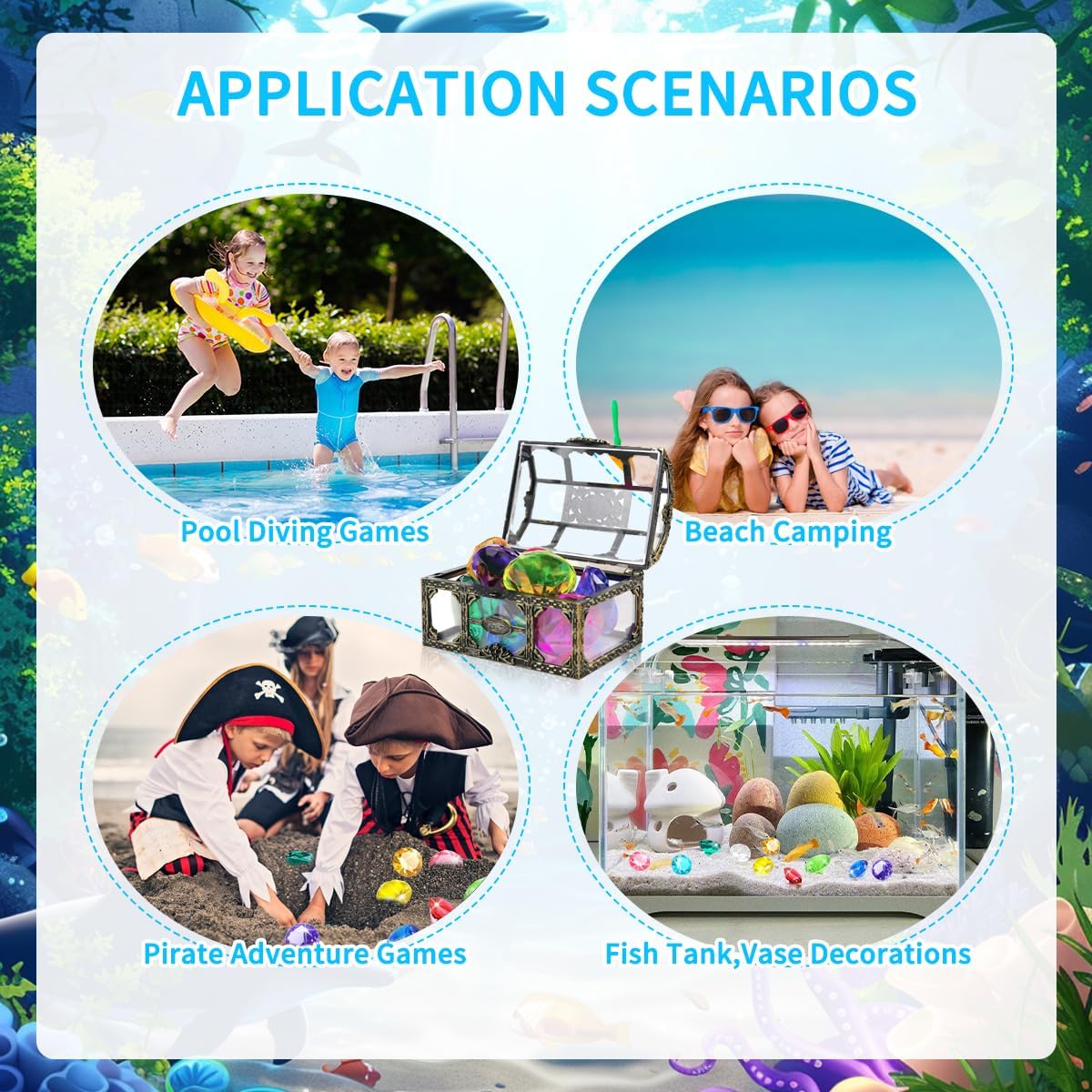Kit di Imballaggio: Riceverete un set di giocattoli acquatici per bambini, 10 pezzi di gemme scintillanti da 4 cm/1,57 pollici in acrilico, uno scrigno dei pirati per bambini; colorati; le gemme sono abbastanza pesanti da affondare sott'acqua e facili da trasportare per i bambini; robusti e durevoli, non facili da rompere; come regalo bonus per incoraggiare i principianti delle immersioni, i giocattoli da piscina sono una scelta affidabile. Creatività e Coraggio: I gioielli subacquei possono soddisfare bambini di tutte le età; i giochi da piscina possono incoraggiare i più piccoli a provare le immersioni subacquee, mentre i più grandi possono assumere il ruolo di sirene o di sommozzatori e andare alla ricerca di tesori! Si possono anche inventare giochi subacquei di ogni tipo; il kit di gioielli subacquei può essere usato come sistema di ricompensa per lavorare insieme e realizzare determinati comportamenti desiderabili. Attraenti e Scintillanti: I giochi gioiello per la piscina sono colorati e abbastanza grandi da catturare rapidamente l'attenzione del bambino. I giocattoli gioiello per la piscina sono colorati e abbastanza grandi da attirare l'attenzione anche in acque profonde. In estate, i bambini e i loro partner possono sperimentare tutti i tipi di immersione e di nuoto; i gioielli con scrigno possono anche essere utilizzati come giochi per la caccia al tesoro in spiaggia. Ampiamente Utilizzati: I gioielli dello scrigno per bambini non solo possono essere utilizzati come giocattoli subacquei per la piscina in estate, ma anche per feste in piscina, feste in spiaggia, decorazioni di vasi, decorazioni di acquari, feste di compleanno e così via. Si possono anche regalare gioielli subacquei a ragazzi, ragazze e nuotatori. Buon Nuoto Estivo: Il set di gemme subacquee per il nuoto estivo può essere riposto a lungo nello scrigno o in piscina e non si sbiadisce; questi giochi d'acqua per bambini da esterno sono ideali per le piscine estive e incoraggiano i ragazzi a tuffarsi e a divertirsi con il nuoto, adatti per l'esercizio del nuoto e il divertimento in piscina. Mettete questi diamanti subacquei in uno scrigno e partite con i vostri amici alla caccia del tesoro.