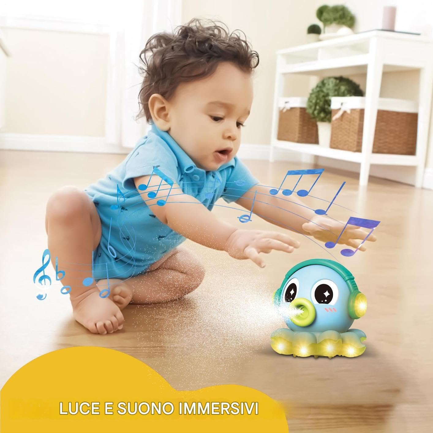 Funzionalità di mobilità automatica: il giocattolo del polipo strisciante utilizza un design di movimento esplorativo che consente la mobilità automatica, incoraggiando il gattonamento con un movimento fluido a 360 gradi che migliora il gioco interattivo e stimola la curiosità durante le attività a terra per il bambino Umidificatore Smart Mist: progettato con un umidificatore intelligente, il giocattolo elettrico a forma di polpo assicura una diffusione fine della per fornire un comfort traspirante, rendendolo ideale per l'uso in soggiorni o camere da letto mantenere livelli di umidità ottimali è fondamentale per il benessere Sicurezza dei bordi arrotondati: il giocattolo dei calamari è dotato di bordi arrotondati che eliminano gli angoli ruvidi, garantendo un tocco adatto ai bambini durante il gioco; realizzato in materiale ABS sicuro con finitura antiscivolo, migliora la presa e impedisce lo scivolamento, rendendolo ideale per consentire ai bambini di esplorare senza rischio di lesioni sia in ambienti interni che esterni Controllo preciso: il giocattolo per bambini calamari è progettato con un facile controllo e una doppia regolazione individuale della luminosa, offrendo agli utenti la possibilità di personalizzare la propria esperienza senza sforzo per maggiore comfort e divertimento Luci e suoni divertenti: dotato di effetti di luce dinamici e melodie delicate e giocose, il giocattolo elettrico del polpo strisciante crea una modalità di coinvolgimento sensoriale che trascina i bambini in un mondo di divertimento, offrendo intrattenimento senza sosta e vantaggi di sviluppo in varie impostazioni di gioco
