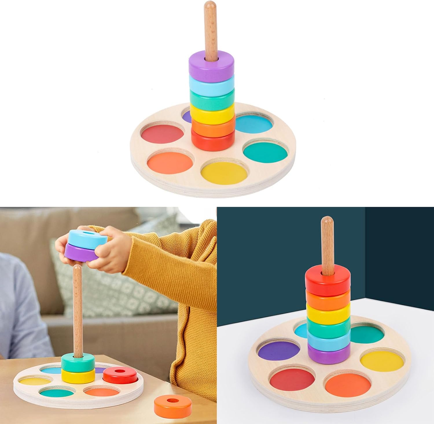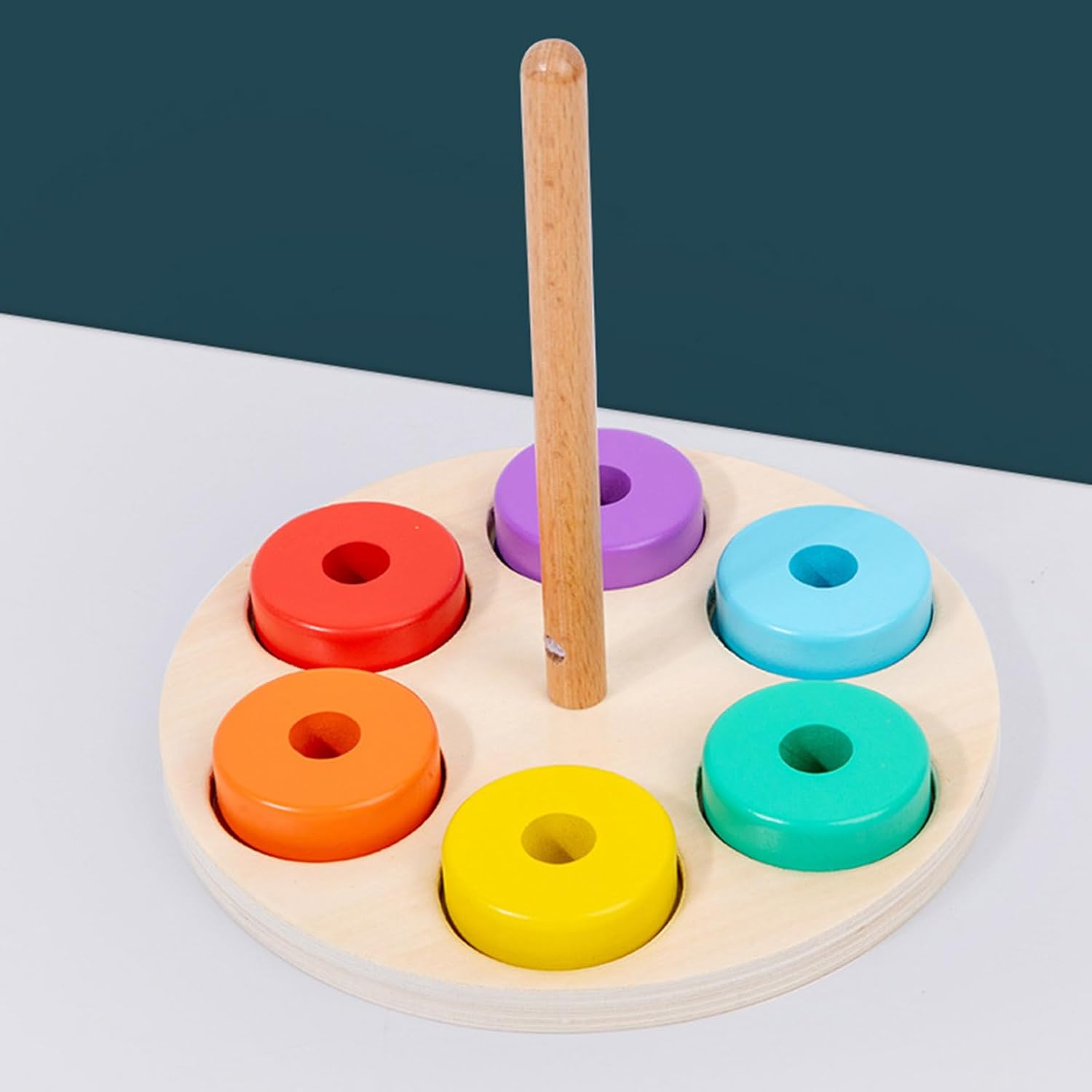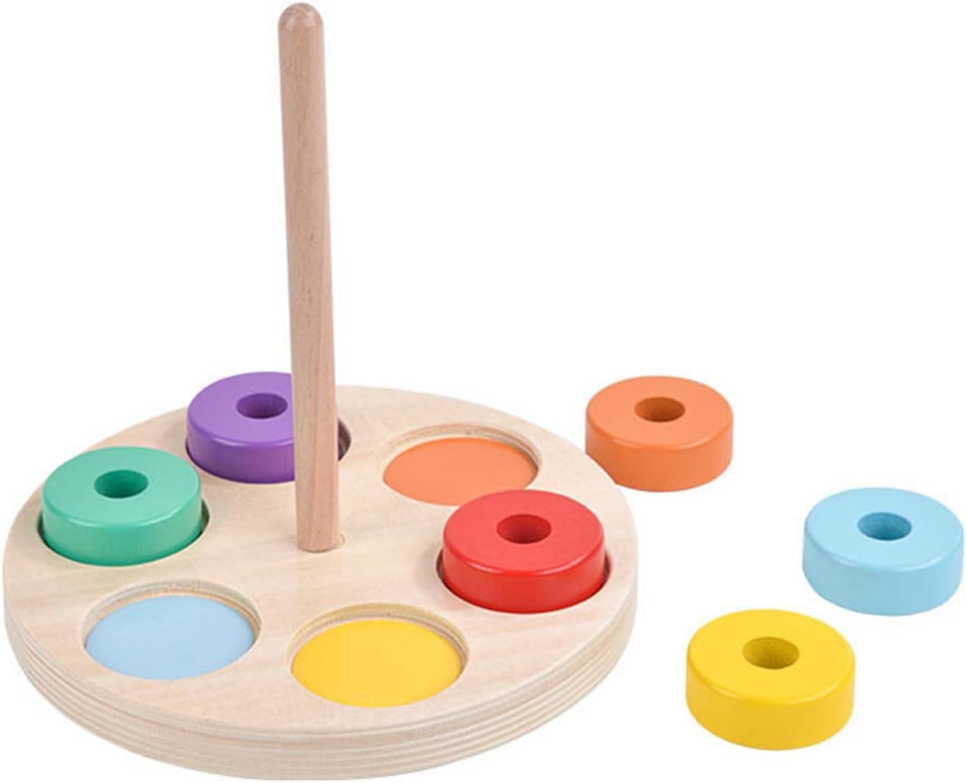 Giocattolo impilabile a colonna: trasportare con base in legno staccabile e anelli rotondi in 6 colori, che possono essere facilmente collegati alla base del pilastro con un buon stimolare gli interessi dei bambini, incoraggiare e sviluppare, esercitare e migliorare la loro capacità di coordinazione mano e occhio. Uso selezionato in legno massello, dipinto ad acqua, bordi lisci ben lucidati per proteggere le mani dei bambini, resistente all'usura, sicuro adatto per i bambini che giocano Giocattolo puzzle interattivo a colori: e interessante puzzle con anelli di collegamento con pezzi impilabili, facile da attirare la concentrazione e con un buon allenamento educativo per i bambini, migliorare le loro abilità di costruzione e abilità di allenamento delle abilità motorie. Impilamento e ordinamento: il giocattolo impilabile richiede grande pazienza e migliora la capacità della mano dei bambini, esercita la loro concentrazione, attraverso l'ordinamento dei colori e il pensiero logico dello spazio per migliorare la loro cognizione di base del colore e le capacità motorie fini. Fantastico: l'educativo è adatto per bambini e come compleanno, Natale, esercizio fisico dei bambini abilità motorie e abilità logiche, attraverso il processo di impilamento per migliorare il loro sviluppo precoce.