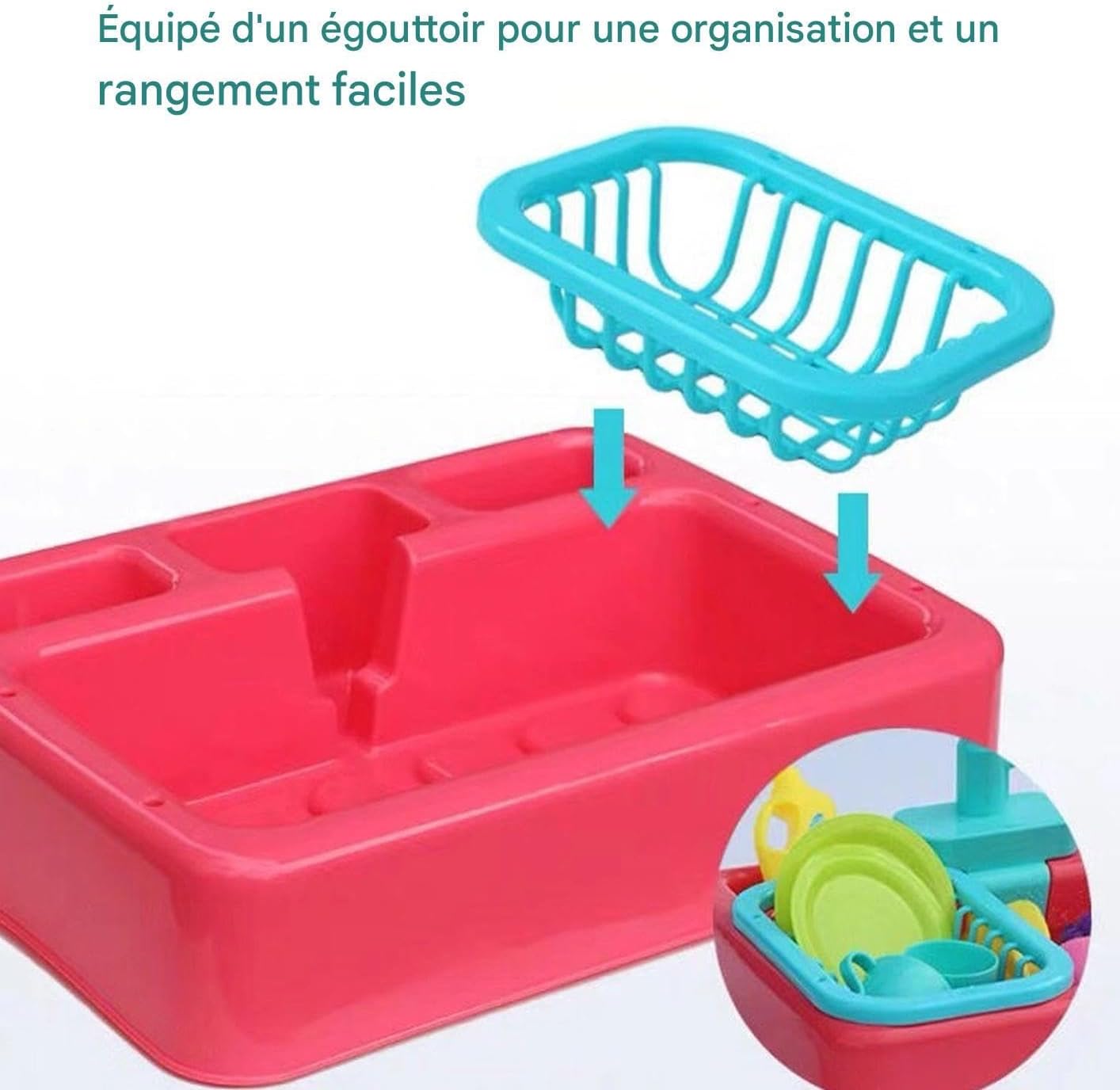 Design sicuro: bordi lisci e guarnizione impermeabile integrati per proteggere durante i giochi creativi. Struttura durevole adatta alle avventure quotidiane di. Sviluppo competenze: combina portaoggetti integrato per giocattoli e grande lavello per coltivare le capacità organizzative, incluso uno scaffale a gocciolamento a piani che facilita la pulizia e la preparazione rapida degli spazi di gioco. Design creativo: Incoraggia l'apprendimento attraverso compiti interattivi di pulizia che imitano le attività culinarie reali, sostenendo lo sviluppo delle capacità cognitive e delle capacità motorie fini attraverso un gioco pratico coinvolgente che ispira naturalmente curiosità e concentrazione. Educazione del gioco: il lavello da gioco offre un flusso d'acqua motorizzato e un rubinetto rotante a 180 gradi, alimentato a batteria per un controllo realistico. Crea un ambiente di gioco interattivo ed educativo, stimolando lo sviluppo delle abilità attraverso l"intrattenimento. Per momenti: stimola l'immaginazione con un gioco o culinario versatile, con opzioni di accessori estensibili che rafforzano la complicità genitore-figlio. Compatibile per ambienti interni ed esterni, incoraggia lunghe ore di intrattenimento accattivante.