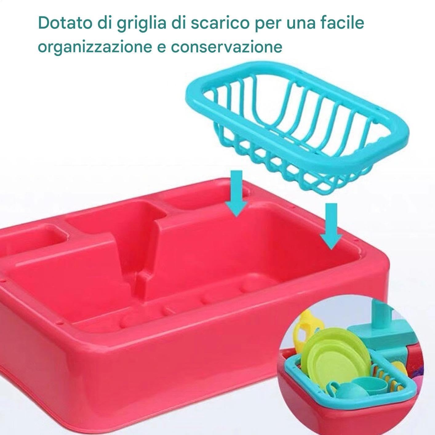 Esperienza Interattiva: Rubinetto rotante 180 con flusso d'acqua motorizzato a batteria per attività dinamiche che ispirano creatività ed esplorazione tramite gioco simbolico Struttura Sicura:Anelli in gomma impermeabili e profili curati permettono ai bambini di esplorare in sicurezza. Progettato per uso frequente, mantiene stabilità durante infinite sessioni di gioco. 3. Design Attraente: Combina il gioco di ruolo cucina realistico con attività di pulizia interattive per rafforzare le capacità di coordinazione e stimolare la crescita cognitiva, offrendo un modo per praticare fondamentali traguardi evolutivi durante il gioco creativo. Adattabilità Completa: Progettato per giochi di ruolo versatili sulla spiaggia e in cucina, supporta set di accessori espandibili che favoriscono legami genitori-figli, garantendo transizioni fluide tra ambienti interni ed esterni con design compatto. Promuovere Abilità Organizzative: Contenitore giocattoli integrato e spazioso sviluppano capacità organizzative, combinati con scolapiatti a più livelli per efficienza e ordine nel gioco.