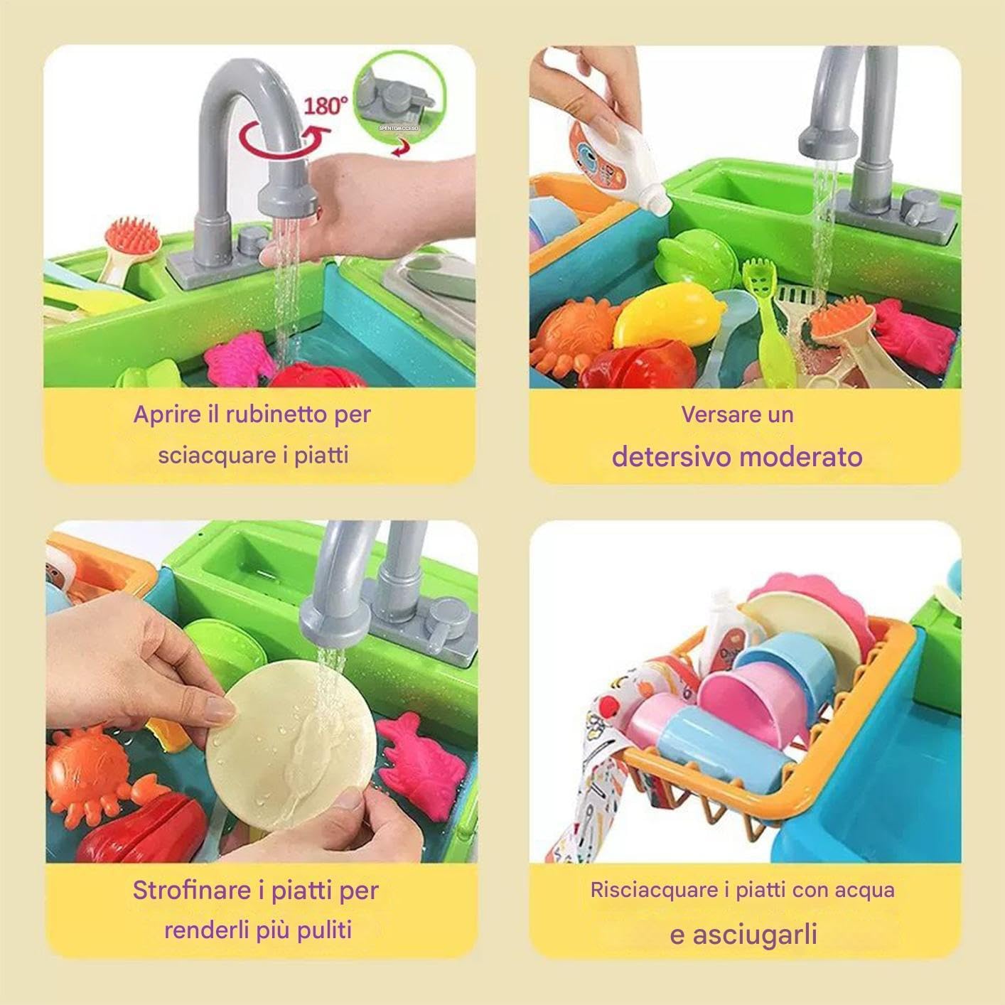 Apprendimento Interattivo: Bordi arrotondati di sicurezza con fissaggi interni rinforzati offrono stabilità ottimizzata e resistenza duratura agli impatti durante il gioco, favorendo esperienze educative coinvolgenti per bambini piccoli Giochi di sviluppo: Stimola le abilità motorie simulando routine quotidiane, con componenti educativi che incoraggiano il pensiero logico tramite funzioni interattive a batteria per esperienze di apprendimento coinvolgente Relazione Genitoriale Migliorata:Favorisce l'interazione genitore-figlio integrando apprendimento basato su giochi di ruolo, potenziando il familiare e stimolando l'espressione verbale durante attività cooperative condivise. Acqua Elettrico: I bambini partecipano a giochi d'acqua interattivi con rubinetto a pulsante e di ricircolo elettrico sviluppando coordinazione occhio-mano tramite vivaci attività di gioco di ruolo con lavello cucina Strumenti Creativi: Promuove il gioco simbolico attraverso accessori cucina dettagliati comprendenti scolapiatti e spazzola, con componenti removibili progettati per una pulizia immediata, adatto a molteplici situazioni di finzione educativa