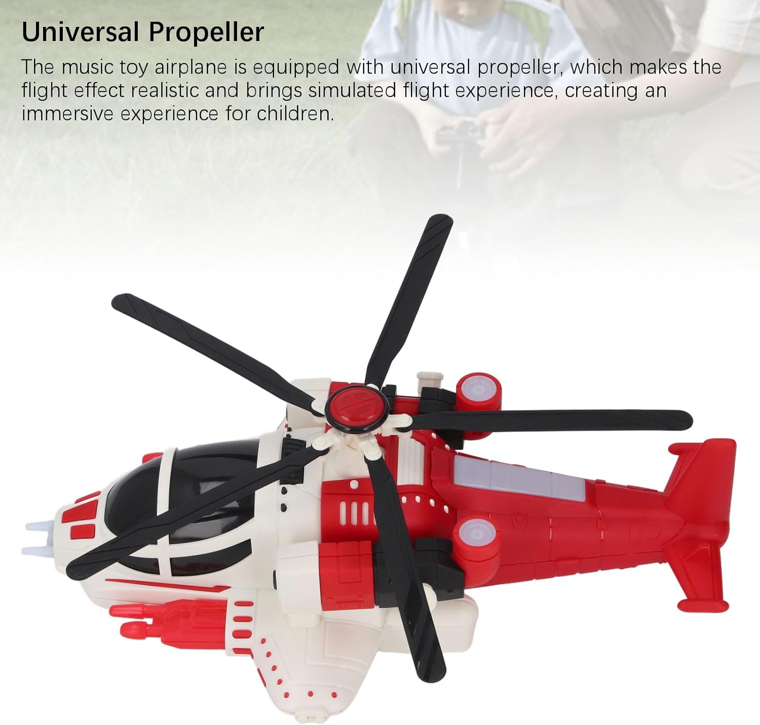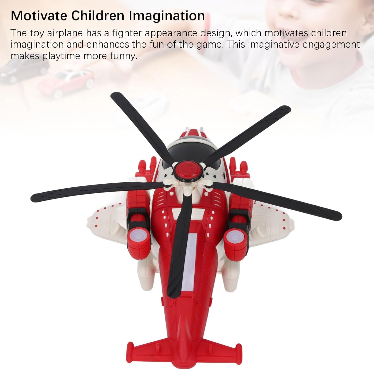 Materiale premium: l'aereo giocattolo musicale realizzato in materiale di alta qualità, robusto e durevole, garantisce un gioco sicuro per i bambini. La struttura robusta assicura che questo giocattolo possa resistere a lunghi giochi. Design cool: l'aereo giocattolo elettrico per bambini ha un design fresco con luci brillanti e musica dinamica, che aggiunge un ulteriore divertimento al gioco. Il suo design non è solo estetico; serve ad arricchire l'esperienza di gioco del bambino creando un'atmosfera che stimola la creatività. universale: l'aereo giocattolo musicale è dotato di un'elica universale, che rende l'effetto di volo realistico e offre un'esperienza di volo simulata, creando un'esperienza coinvolgente per i bambini. Facile da usare: l'aereo elettrico è facile da usare, adatto ai bambini e favorisce l'usabilità. Questa semplice operazione non solo aiuta a costruire la propria fiducia in se stessi, ma promuove anche il gioco Motiva l'immaginazione dei bambini: l'aereo giocattolo ha un design da combattimento che stimola l'immaginazione dei bambini e aumenta il divertimento del gioco. Questo impegno fantasioso rende il gioco ancora più divertente.