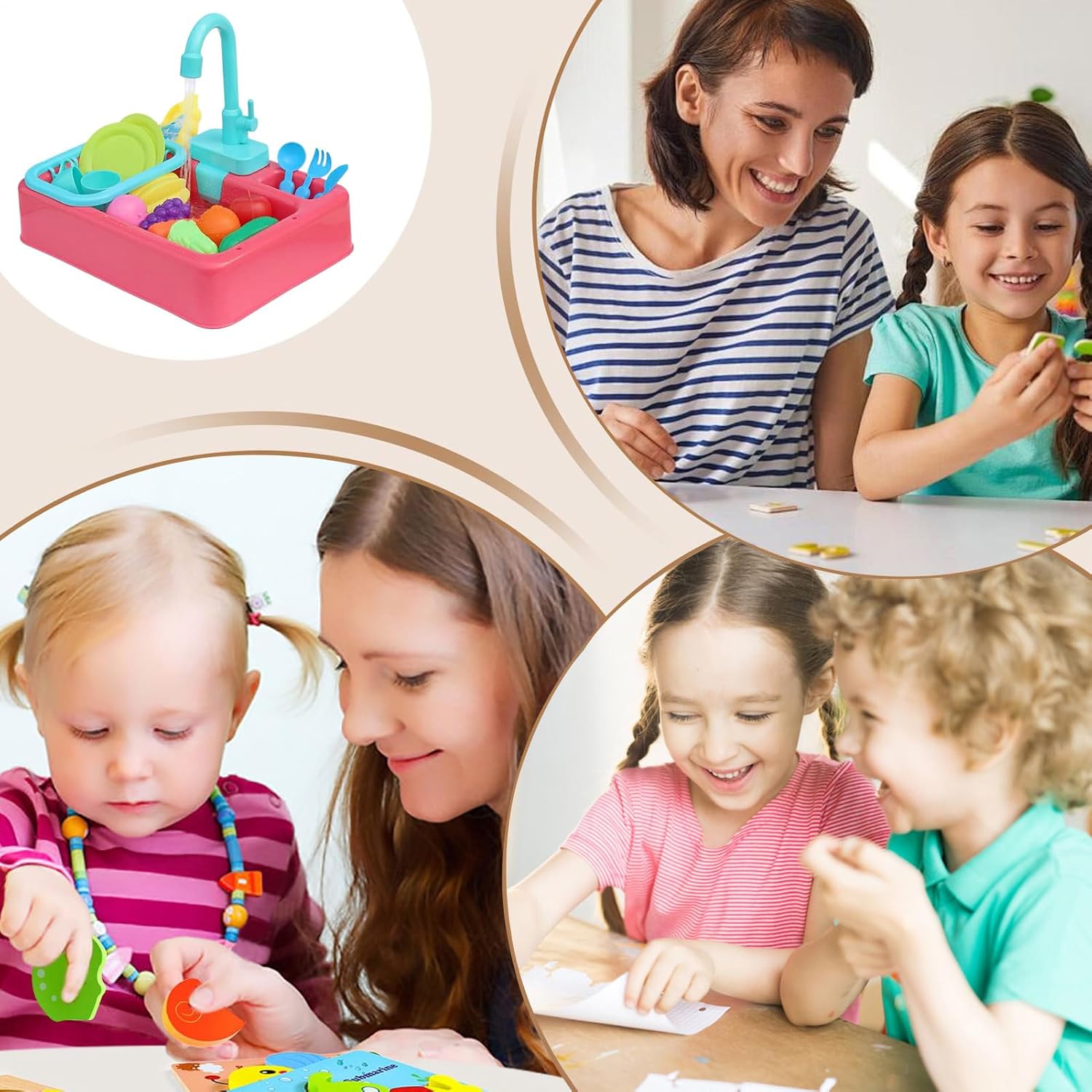 Apprendimento Divertente: Flusso d'acqua motorizzato e rubinetto girevole 180 alimentati a batteria un ambiente di gioco realistico ed educativo per lo sviluppo cognitivo Maggiore Sicurezza:Bordi lisci e anelli in gomma impermeabili assicurano la sicurezza nel gioco creativo. La struttura garantisce divertimento duraturo per avventure quotidiane. 4. Design Creativo: Stimola l'apprendimento attraverso attività di pulizia interattive che imitano quelle reali in cucina, sostenendo il potenziamento delle capacità cognitive e della motricità fine grazie a un gioco pratico coinvolgente pensato per ispirare curiosità e concentrarsi spontaneamente. Adattabilità Completa: Progettato per giochi di ruolo versatili sulla spiaggia e in cucina, supporta set di accessori espandibili che favoriscono legami genitori-figli, garantendo transizioni fluide tra ambienti interni ed esterni con design compatto. Sviluppare Capacità Organizzative: Contenitore giocattoli integrato e grande sviluppano abilità organizzative, includendo scolapiatti multi-livello per pulizia rapida e preparazione efficiente del gioco.