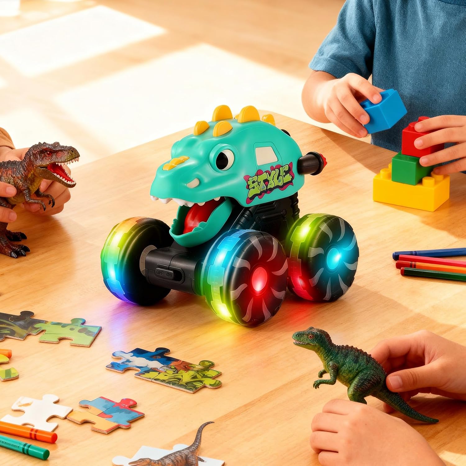 Regalo festivo: il giocattolo per camion dinosauro è un regalo confortante per i , fornendo eccitazione durante compleanni, vacanze o celebrazioni di fine anno. Permette ai parenti di mostrare la loro sollecitazione attraverso un gioco significativo, garantendo sorrisi e felicità condivisa durante eventi familiari e incontri gioiosi. Giocattolo Dinosauro Interattivo: Il giocattolo per auto dinosauro offre trigger di feedback tattile combinati con una funzione di ruggito a controllo della pressione, sostenendo le esigenze di gioco di ruolo migliorando il coordinamento mano-occhio, esperienze di gioco dinamiche e accattivanti per i giovani esploratori in vari ambienti. Prestazioni Luminose Vive: Questo giocattolo per auto dinosauro incorpora luci di ruote multicolore vibranti che generano effetti di luce e sorprendenti, catturando l'attenzione di tutti stimolando i loro sensi durante le attività indoor poco illuminate. Perfetto per sessioni di gioco creative dopo il tramonto, i motivi viventi rafforzano l'attrattiva visiva e supportano lo sviluppo sensoriale, offrendo un'esperienza coinvolgente e divertente. Capacità di Fun Terreni: le auto dinosauro per sono realizzate con materiali di ruote solidi, consentendo loro di resistere a frequenti usi su più terreni offrendo giochi di avventura simulati immersivi pieni di crash visivi e interazioni dinamiche di potenza, rendendoli ideali per l'esplorazione creativa a casa o al parco giochi, con la capacità di esibirsi su varie superfici per un intrattenimento senza limiti e si adatta Compatibilità di età estesa: I camion dinosauri supportano un'ampia compatibilità di età, offrendo un'esperienza accattivante per età e incoraggiando il lavoro di squadra e il gioco di ruolo in vari ambienti, come aule o avventure all'aperto. Possono immergersi insieme in emozionanti scenari preistorici costruendo ricordi senza sforzo, per momenti dinosauri memorabili e collaborativi.