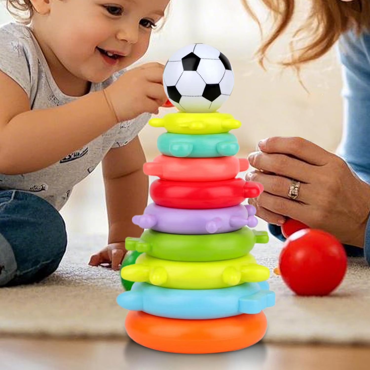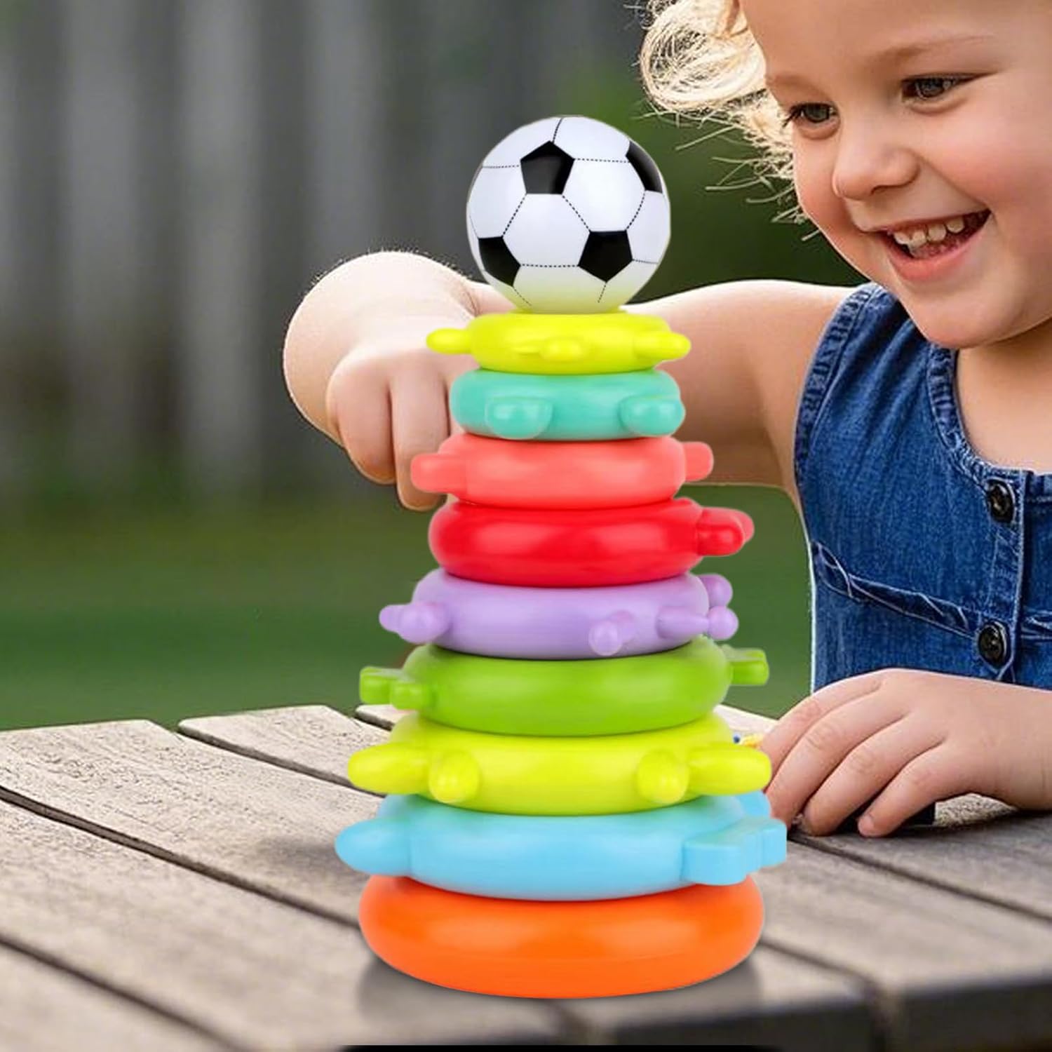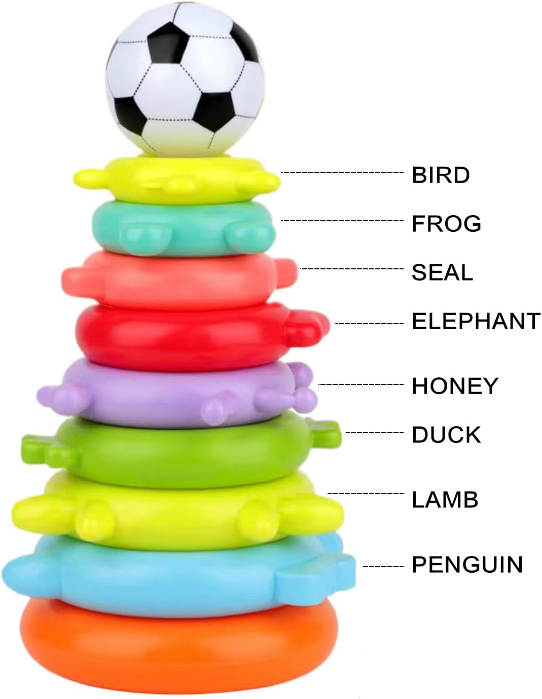 Stimolazione Cromatica : Favorisce lo sviluppo visivo con tonalità vivaci, aiuta a riconoscere i colori e perfeziona le capacità osservative durante le attività di apprendimento infantile. Sviluppo Intellettuale: Stimola la crescita cognitiva supportando lo sviluppo cerebrale, migliorando il ragionamento logico e affinando la coordinazione occhio-mano, ideale per l'esplorazione nella prima infanzia Sviluppo Capacita: Incoraggia il riconoscimento di forme e animali con giochi coinvolgenti favorendo obiettivi di crescita attraverso divertenti attivita educative di anelli impilabili per piccoli apprendisti Design Sicuro e Solido: Gli anelli impilabili in ABS sicuro offrono una struttura robusta con bordi levigati, assicurando la massima sicurezza per il bambino e una soddisfazione duratura per i genitori. Regalo Festivo: Ideale per bambini come regalo in compleanni, feste o Natale. Esprime affetto attraverso un gioco che incrementa naturalmente la gioia, stimolando la creatività e le abilità manuali con anelli colorati da impilare in sicurezza.