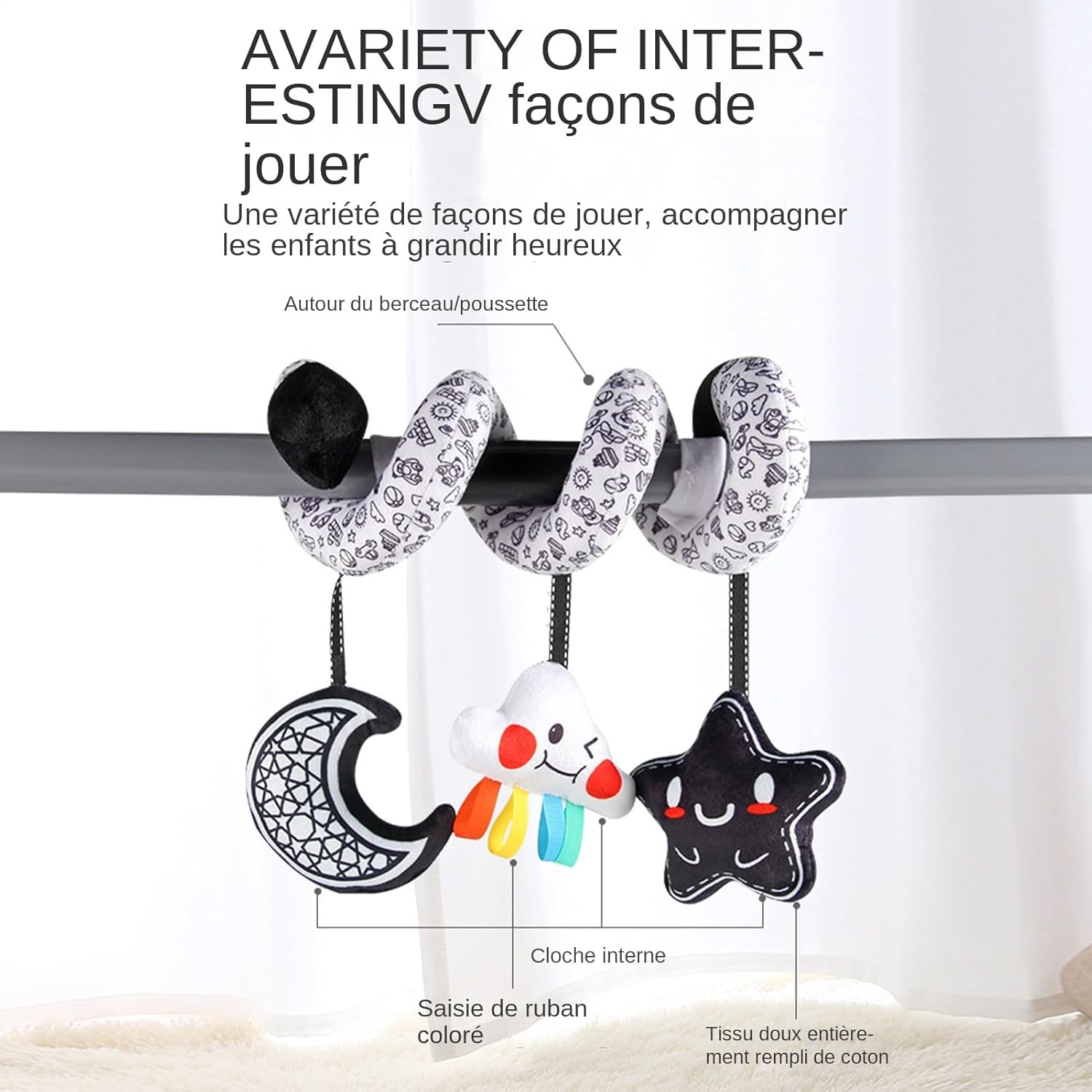 REFLEX & SENSE REFLEX STIMOLA REFLEX: gli elementi sospesi promuovono lo sviluppo sensoriale attraverso diverse texture e rotazioni dinamiche, ideali per allenare la coordinazione occhio-mano e rafforzare naturalmente il riflesso di presa nei bambini Alto contrasto: motivi sfumati con toni contrastanti attivano la concentrazione visiva e suscitano interesse nell'identificazione di modelli attraverso il riconoscimento cromatico giochi educativi Occasioni speciali: progettato per sottolineare i momenti preziosi dell'infanzia, si adatta grazie al suo meccanismo di regolazione semplificato per passeggini di tutte le dimensioni perfetto per le gite all'aperto per il comfort del bambino: struttura leggera con attacco universale per passeggino, Rotazione di 360 gradi senza intoppi. I materiali morbidi e ipoallergenici favoriscono il risveglio sensoriale garantendo al tempo stesso una sicurezza ottimale in movimento grazie al sistema antivibrazioni. Toni delicati per: Il meccanismo del campanello dal tono vellutato diffonde composizioni melodiche appositamente studiate per calmare i bambini. Stimola il risveglio dell'ascoltatore attraverso variazioni sonore sottili e progressive.