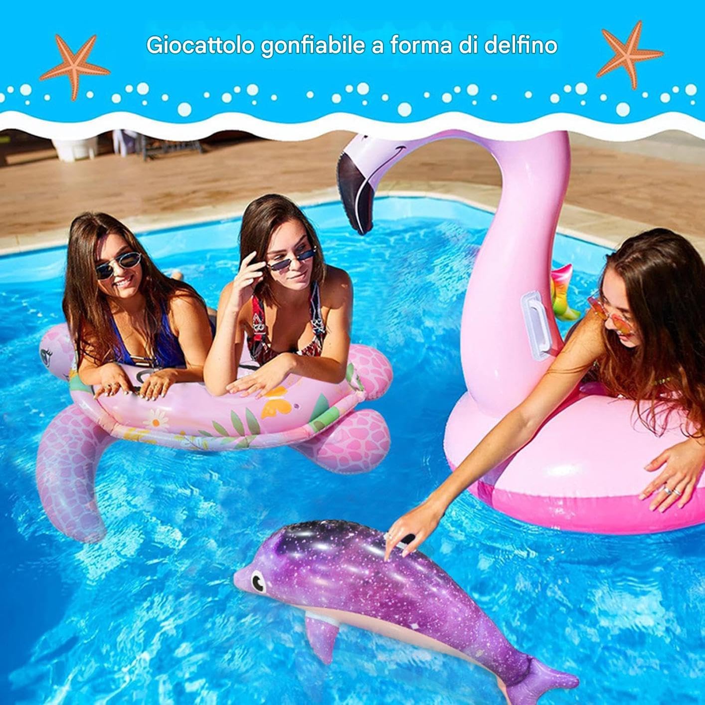 DESIGN ADATTO AI BAMBINI: ispira momenti di gioco fantasiosi con questo galleggiante per piscina con delfini realizzato in materiale PVC sicuro ed ecologico. La struttura spessa resiste al gioco intenso, garantendo la sicurezza e l'intrattenimento del bambino per ore. Delizia dei delfini stellati: il galleggiante della piscina dei delfini aggiunge un tocco di fantasia con il suo splendido motivo stellato ed è per giochi acquatici illimitati. Il suo design energico stimola l'immaginazione dei bambini e migliora la loro esperienza in piscina con gioia infinita. Porta entusiasmo alla tua giornata: aggiungi un po' di vivace divertimento alla tua giornata, sia all'interno che all'esterno, con questo galleggiante per piscina con delfini. È versatile, quindi non è solo per la piscina o la spiaggia, ma anche come decorazione d'interni o supporto fotografico, per creare ricordi divertenti. FAMILIARE: goditi un fantastico momento interattivo tra genitori e figli con questo galleggiante per piscina con delfini. Un compagno sia per adulti che per bambini, pensato per condividere il divertimento 'acqua e rafforzare i rapporti familiari. Facile da riporre: questo galleggiante per piscina con delfini è facile da gonfiare e sgonfiare, quindi non richiederà molto o energia. Al termine delle attività della giornata, espellere l'aria in eccesso per risparmiare spazio di archiviazione.