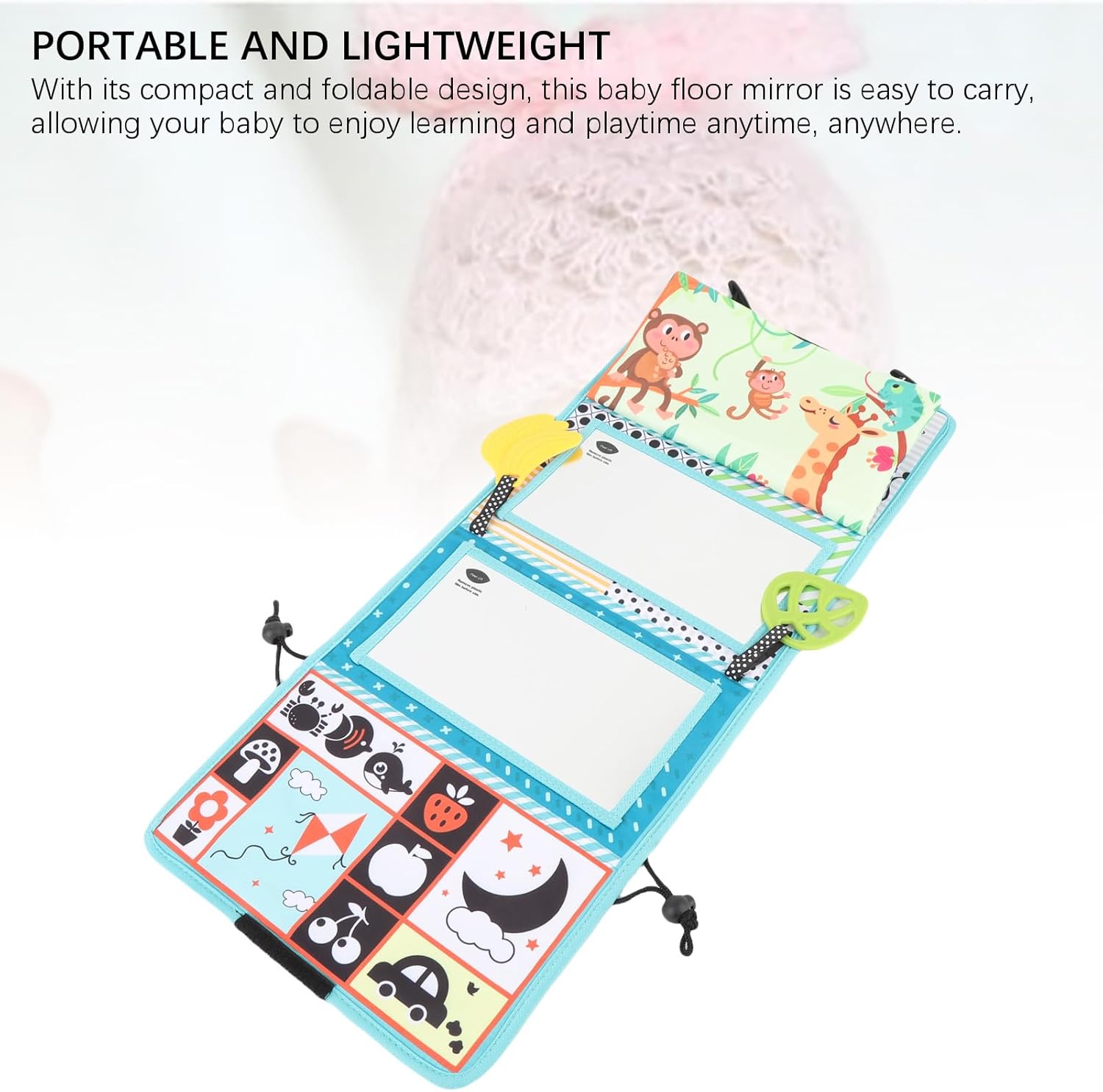 Panca panoramica del tempo dell'addome: con uno specchio pieghevole, questo giocattolo specchio per bambini cattura l'attenzione del tuo bambino e migliora il divertimento interattivo, rendendolo un'aggiunta attraente e divertente per il tempo di gioco. Materiale morbido e sicuro: realizzato in fibra di poliestere di qualità, questo libro in tessuto morbido è morbido sulle mani del tuo bambino, garantendo un'esperienza di gioco sicura e confortevole per il tuo piccolo. Contenuto di apprendimento precoce: con ricchi contenuti educativi, questo giocattolo per bambini stimola lo sviluppo cognitivo del tuo bambino e incoraggia l'amore per l'apprendimento fin dalla tenera età. Design del suono delle rughe: la carta Cruye all'interno del libro produce suoni quando viene toccata, fornendo stimolazione tattile e uditiva che promuove lo sviluppo sensoriale e la crescita precoce. Portatile e leggero: con il suo design compatto e pieghevole, questo specchio da pavimento per bambini è facile da trasportare, consentendo al tuo bambino di godersi l'apprendimento e il tempo di gioco sempre e ovunque.