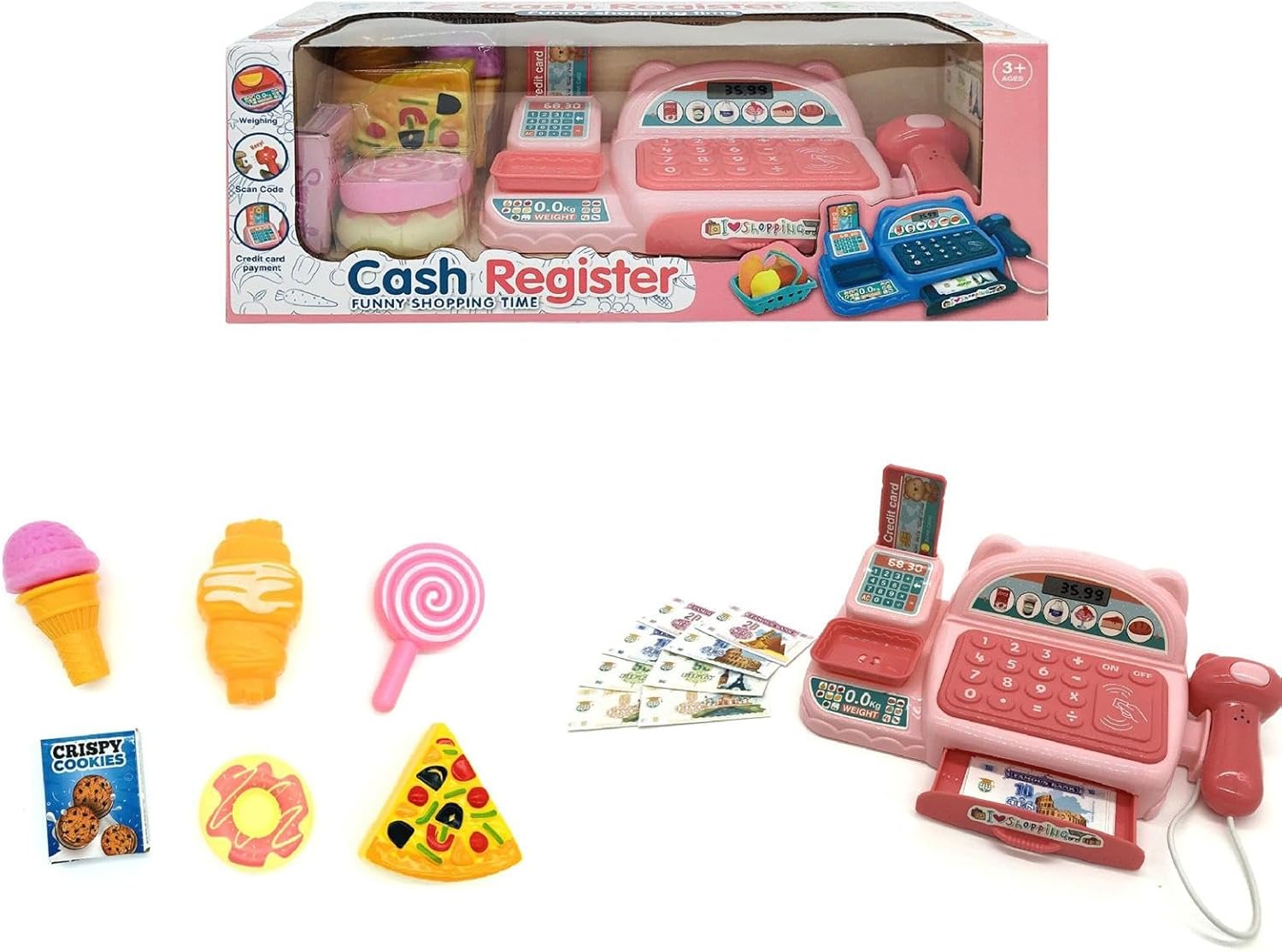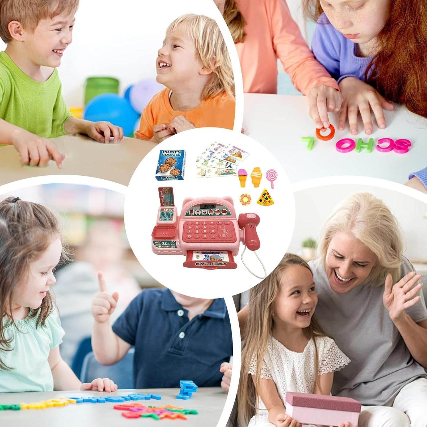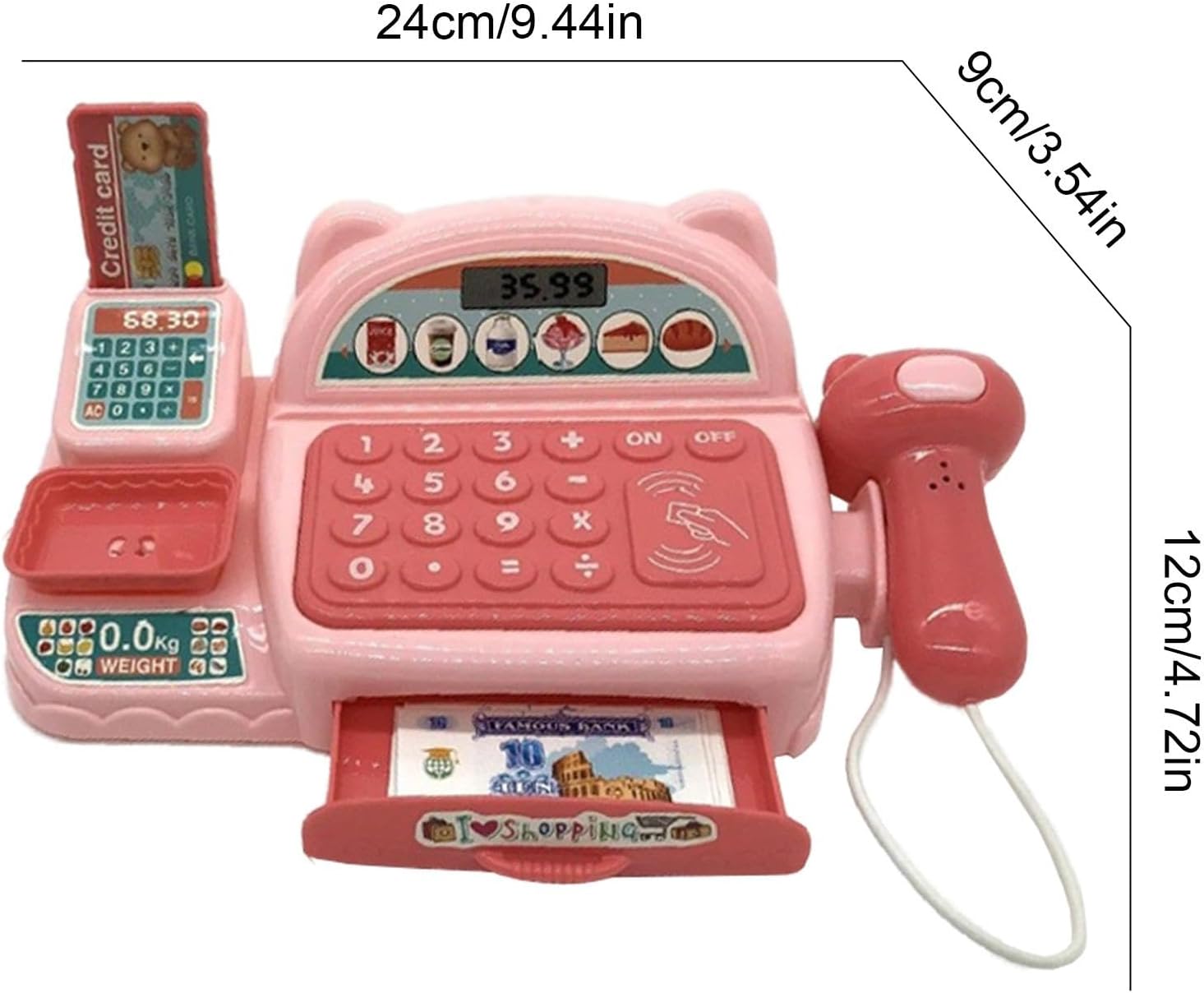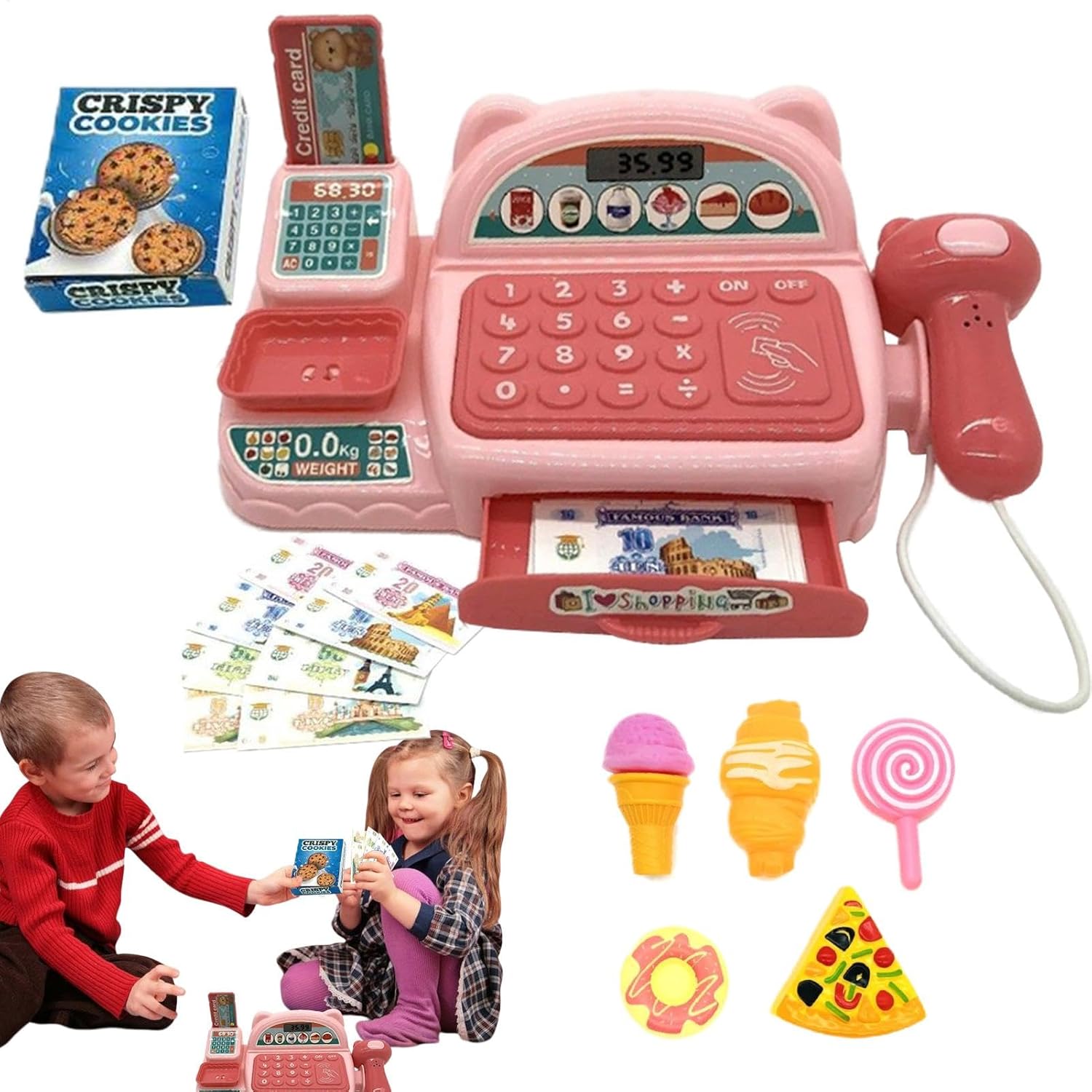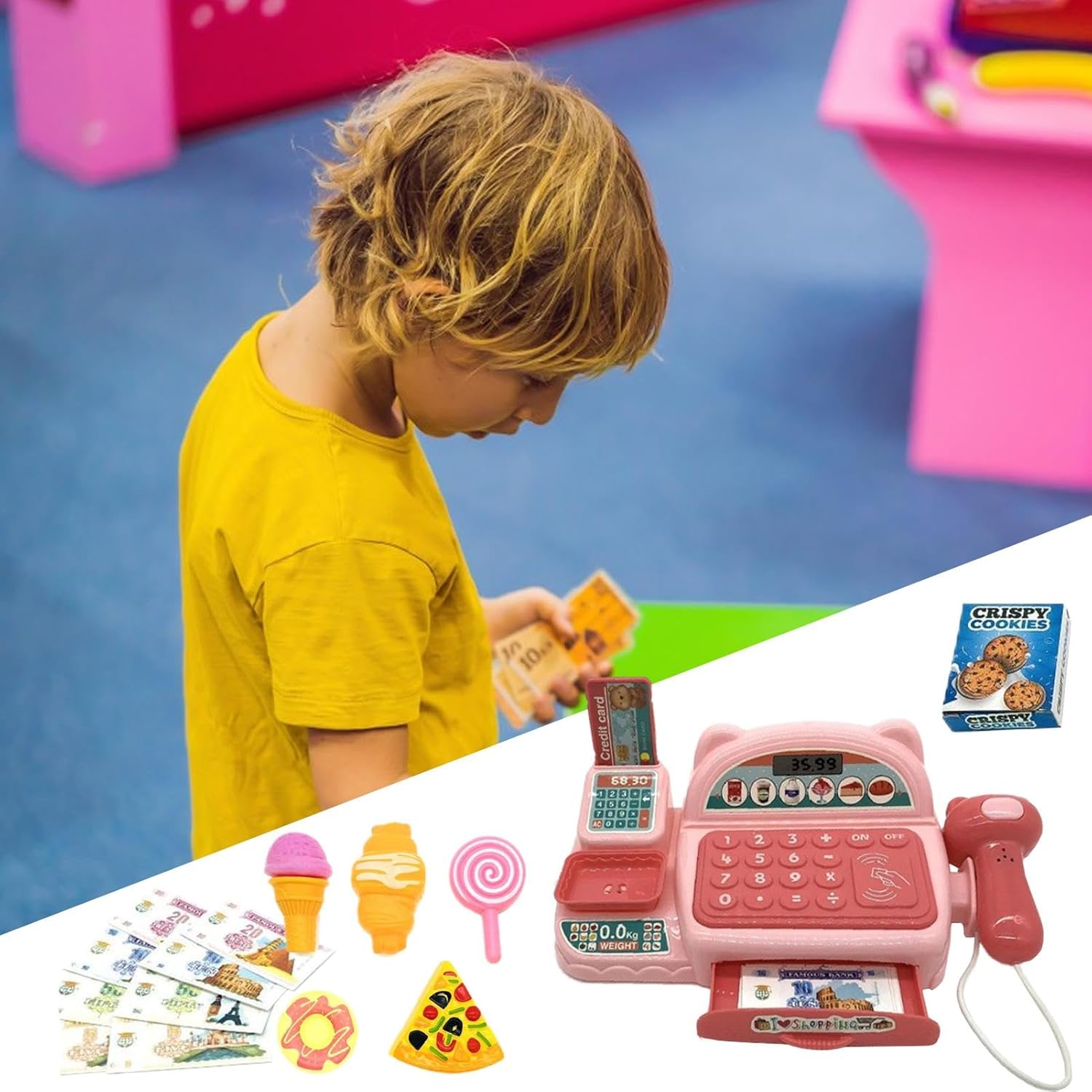 Registro interattivo dei giocattoli: presenta effetti luminosi e sonori per migliorare il gioco di finzione e coinvolgerli nelle attività del negozio di alimentari. Prime abilità matematiche: incoraggia le abilità matematiche e di conteggio di base giocando con monete, banconote e pulsanti sul registratore di cassa. Divertimento per tutti: ideale dai 3 anni in su, promuove l'immaginazione e l'apprendimento in modo divertente ed educativo. Caratteristiche realistiche: include calcolatrice, pulsanti per aggiungere, sottrarre e dare il resto, imitando un vero registratore di cassa. Design durevole: realizzato con materiali sicuri e di alta qualità per un uso duraturo e ore di gioco creativo.