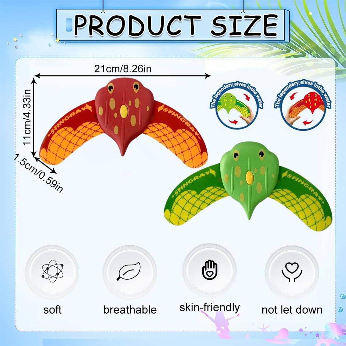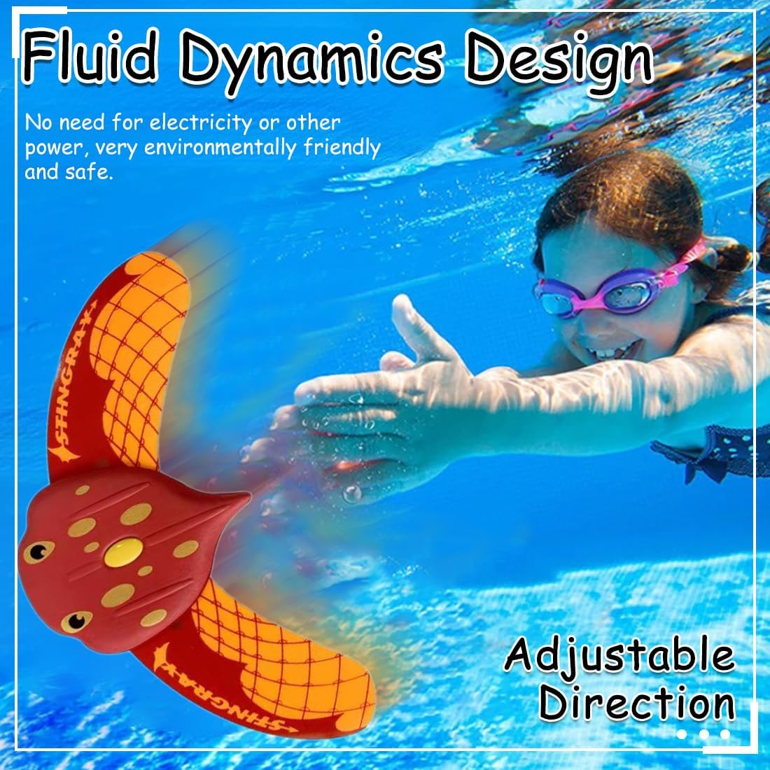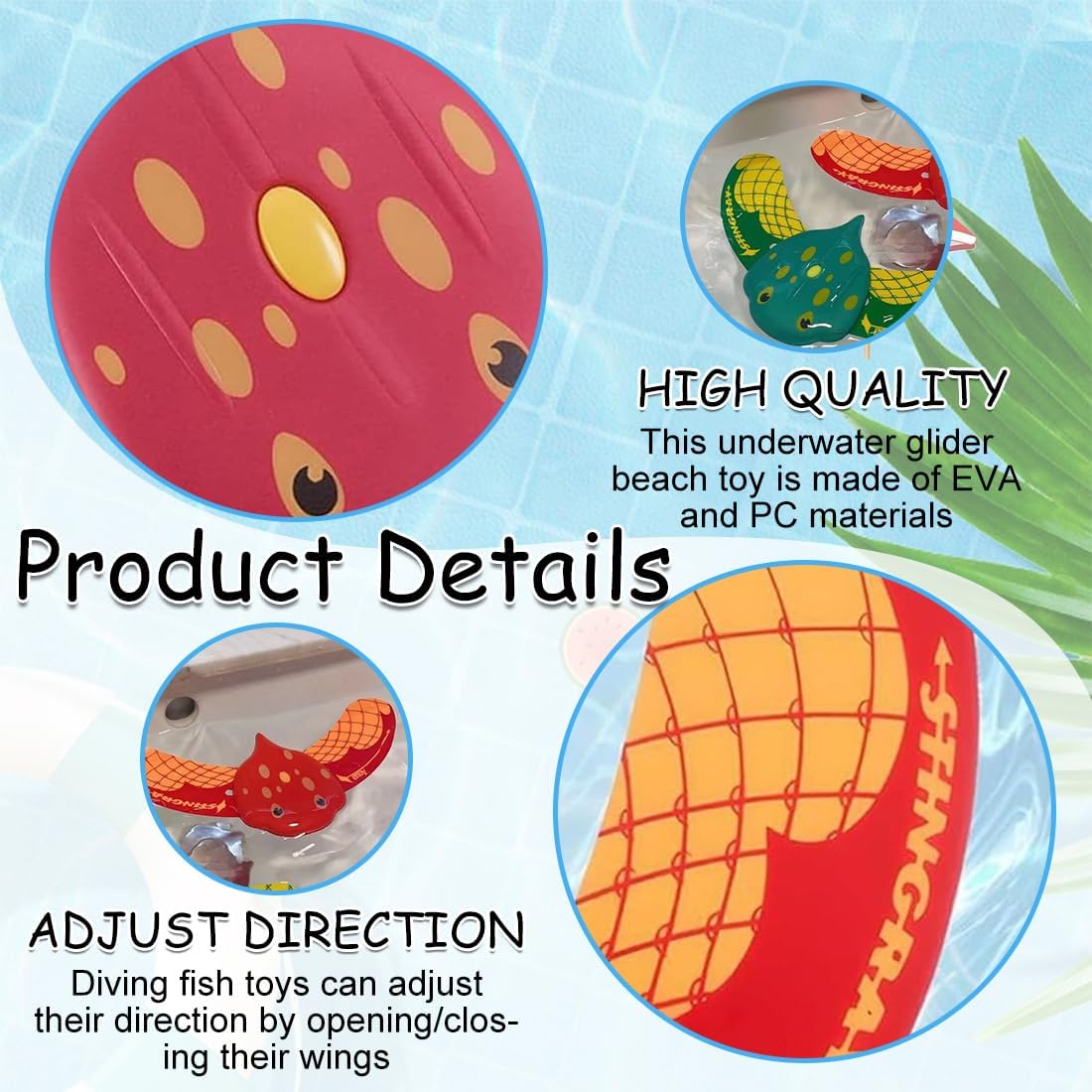 【Design fluidodinamico】 Questo giocattolo subacqueo per bambini utilizza un design fluidodinamico. Non sono necessarie batterie. Immergilo in acqua e poi rilascialo. Si muove in avanti e nuota da solo! Più lo immergi, più scivola. 【Materiali di alta qualità】 Questo giocattolo da nuoto è realizzato in materiale EVA di alta qualità e la pinna di squalo è in policarbonato ad alta resistenza e con un elevato coefficiente elastico. Sicuro per i bambini. 【Direzione Regolabile】 4 giochi d'acqua possono cambiare la loro modalità accendendoli/spegnendoli o ruotandoli a sinistra/destra! I bambini possono esplorare i principi della meccanica dei fluidi, regolare la posizione dei giocattoli, riflettere mentre giocano, migliorare la loro espressione subacquea e incoraggiare il pensiero innovativo. 【Promuove la forma fisica dei bambini】 Inseguire i giocattoli da immersione in acqua può allenare le abilità natatorie e la forma fisica dei bambini, migliorare la loro forma fisica, promuovere la loro adattabilità in acqua e la consapevolezza della sicurezza, e aumentare il divertimento e la sicurezza delle attività acquatiche. 【Educativo e divertente】 Giocattoli da piscina perfetti per l'estate, una nuova esperienza di interazione genitore-figlio. Questo gioco acquatico sfrutta i principi di galleggiamento e pressione dell'acqua, permettendo ai bambini di comprendere i principi di galleggiamento e dinamica dei fluidi durante il gioco.